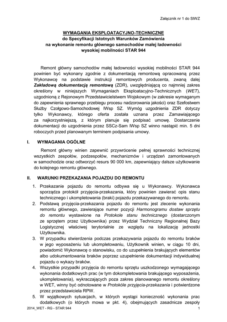 Załącznik nr 1 do SIWZ WYMAGANIA EKSPLOATACYJNO-TECHNICZNE do Specyfikacji Istotnych Warunków Zamówienia na wykonanie remontu głównego samochodów małej ładowności wysokiej mobilności STAR 944 Remont główny samochodów małej ładowności wysokiej mobilności STAR 944 powinien być wykonany zgodnie z dokumentacją remontową opracowaną przez Wykonawcę na podstawie instrukcji remontowych producenta, zwaną dalej Zakładową dokumentacją remontową (ZDR), uwzględniającą co najmniej zakres określony w niniejszych Wymaganiach Eksploatacyjno-Technicznych (WET), uzgodnioną z Rejonowym Przedstawicielstwem Wojskowym (w zakresie wymaganym do zapewnienia sprawnego przebiegu procesu nadzorowania jakości) oraz Szefostwem Służby Czołgowo-Samochodowej IWsp SZ. Wymóg uzgodnienia ZDR dotyczy tylko Wykonawcy, którego oferta została uznana przez Zamawiającego za najkorzystniejszą, z którym planuje się podpisać umowę. Dostarczenie dokumentacji do uzgodnienia przez SSCz-Sam IWsp SZ winno nastąpić min. 5 dni roboczych przed planowanym terminem podpisania umowy. I. WYMAGANIA OGÓLNE Remont główny winien zapewnić przywrócenie pełnej sprawności technicznej wszystkich zespołów, podzespołów, mechanizmów i urządzeń zamontowanych w samochodzie oraz odtworzyć resurs 90 000 km, zapewniający dalsze użytkowanie do kolejnego remontu głównego. II. WARUNKI PRZEKAZANIA POJAZDU DO REMONTU 1. Przekazanie pojazdu do remontu odbywa się u Wykonawcy. Wykonawca sporządza protokół przyjęcia-przekazania, który powinien zawierać opis stanu technicznego i ukompletowania (braki) pojazdu przekazywanego do remontu. 2. Podstawą przyjęcia-przekazania pojazdu do remontu jest zlecenie wykonania remontu głównego, zawierające numer pozycji Harmonogramu dostaw sprzętu do remontu wystawione na Protokole stanu technicznego (dostarczonym ze sprzętem przez Użytkownika) przez Wydział Techniczny Regionalnej Bazy Logistycznej właściwej terytorialnie ze względu na lokalizację jednostki Użytkownika. 3. W przypadku stwierdzenia podczas przekazywania pojazdu do remontu braków w jego wyposażeniu lub ukompletowaniu, Użytkownik winien, w ciągu 10 dni, powiadomić Wykonawcę o stanowisku, co do uzupełnienia brakujących elementów albo udokumentowania braków poprzez uzupełnienie dokumentacji indywidualnej pojazdu o wykazy braków. 4. Wszystkie przypadki przyjęcia do remontu sprzętu uszkodzonego wymagającego wykonania dodatkowych prac (w tym dokompletowania brakującego wyposażenia, ukompletowania), wykraczających poza zakres planowanego remontu określony w WET, winny być odnotowane w Protokóle przyjęcia-przekazania i potwierdzone przez przedstawiciela RPW. 5. W wyjątkowych sytuacjach, w których wystąpi konieczność wykonania prac dodatkowych (o których mowa w pkt. 4), obejmujących zasadnicze zespoły 2014_WET - RG - STAR 944 1 pojazdu Wykonawcy przysługiwać będzie dodatkowa zapłata. Do zasadniczych zespołów zalicza się: silnik, skrzynię przekładniową (i rozdzielczą), mosty napędowe, ramę pojazdu, kabinę, skrzynię ładunkową. 6. Protokół przyjęcia-przekazania wymieniony w pkt. 4 wraz z kalkulacją kosztów dodatkowych czynności remontowych, Wykonawca przesyła do Zamawiającego oraz kopię - do Użytkownika. Zamawiający w terminie 14 dni jest zobowiązany określić stanowisko, co do realizacji dodatkowych prac, zastrzegając sobie prawo do zażądania od Wykonawcy udokumentowania kosztów wykazanych w kalkulacji. III. SZCZEGÓŁOWE WYMAGANIA W ZAKRESIE WARUNKÓW TECHNICZNYCH REMONTU 1. Po wykonaniu pełnego demontażu pojazdu - jego układów, zespołów i podzespołów, proces technologiczny remontu powinien obejmować wykonanie (przeprowadzenie), co najmniej następujących operacji, zabiegów lub czynności w zakresie odtworzenia pełnej sprawności, poprzez wykonanie (dokonanie, przeprowadzenie): 1.1. W NADWOZIU: 1.1.1. wymiany na nowe: a) uszczelek szyb; b) wyłożeń, obić tapicerskich kabiny; c) obić tapicerskich foteli i siedzeń; d) dywaników i wyłożenia podłogi kabiny; e) nakładek ażurowych; f) uszczelek drzwi, luków; g) lusterek zewnętrznych; h) zamków drzwi i pokryw; i) wykładzin termiczno-akustycznych (osłon pokrywy i komory) silnika; j) mechanizmów podnoszenia szyb; k) fartuchów przeciwbłotnych kół („chlapaczy”); l) elementów gumowych zawieszenia kabiny. 1.1.2. weryfikacji - m.in. wymienionych poniżej elementów, a w przypadku stwierdzenia uszkodzeń lub niesprawności, w postaci: a) wgnieceń - w zależności od stopnia uszkodzenia - wykonanie napraw blacharskich przez prostowanie, wymianę uszkodzonych fragmentów lub wymianę całych elementów poszycia nadwozia (np.: błotnika, atrapy); b) pęknięć - wykonanie naprawy przez spawanie, w przypadkach koniecznych (po stwierdzeniu osłabienia materiału lub konstrukcji) - zastosowanie dodatkowego wzmocnienia - nakładki; c) ognisk korozji - oczyszczenie, a przy dużych ubytkach materiału wymianę fragmentu lub całego elementu oblachowania na nowy; d) zmatowienia, zarysowania lub pęknięcia szyb - wymianę na nowe; e) pęknięć zderzaków - wymianę na nowe; f) pęknięć pokrywy silnika - naprawę; g) deformacji foteli lub siedzeń - naprawę stelaża poprzez prostowanie, wymianę zniekształconych sprężyn, wymianę materiałów wypełniających poduszek. 1.2. W ZESPOLE NAPĘDOWYM (silnik wraz z osprzętem, sprzęgłem głównym i skrzynią biegów): Wykonanie sprawdzenia parametrów pracy zespołu napędowego i w przypadku stwierdzenia nieprawidłowości, wykonanie naprawy metodą 2 2014_WET - RG - STAR 944 wynikową. Ponadto, wykonanie obsługiwania technicznego najwyższego rzędu (połączonego z wymianą płynów i materiałów eksploatacyjnych). 1.3. W UKŁADZIE ZASILANIA: 1.3.1. wymiany na nowe: a) wkładów filtrów; b) uszczelek i uszczelnień filtrów; 1.3.2. weryfikacji pozostałych - m.in. wymienionych poniżej części układu, a w przy