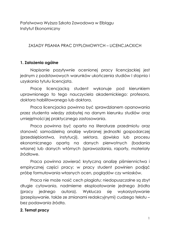 Państwowa Wyższa Szkoła Zawodowa w Elblągu Instytut Ekonomiczny ZASADY PISANIA PRAC DYPLOMOWYCH – LICENCJACKICH 1. Założenia ogólne Napisanie pozytywnie ocenionej pracy licencjackiej jest jednym z podstawowych warunków ukończenia studiów I stopnia i uzyskania tytułu licencjata. Pracę licencjacką student wykonuje pod kierunkiem uprawnionego to tego nauczyciela akademickiego: profesora, doktora habilitowanego lub doktora. Praca licencjacka powinna być sprawdzianem opanowania przez studenta wiedzy zdobytej na danym kierunku studiów oraz umiejętności jej praktycznego zastosowania. Praca powinna być oparta na literaturze przedmiotu oraz stanowić samodzielną analizę wybranej jednostki gospodarczej (przedsiębiorstwa, instytucji), sektora, zjawiska lub procesu ekonomicznego opartą na danych pierwotnych (badania własne) lub danych wtórnych (sprawozdania, raporty, materiały źródłowe. Praca powinna zawierać krytyczną analizę piśmiennictwa i empirycznej części pracy; w pracy student powinien podjąć próbę formułowania własnych ocen, poglądów czy wniosków. Praca nie może nosić cech plagiatu; niedopuszczalne są zbyt długie cytowania, nadmierne eksploatowanie jednego źródła (pracy jednego autora). Wyklucza się wykorzystywanie (przepisywanie, także ze zmianami redakcyjnymi) cudzego tekstu – bez podawania źródła. 2. Temat pracy 1 Temat pracy powinien posiadać cechy istotności i aktualności oraz odpowiadać treściom zawartym w pracy. Przy ustalaniu tematu pracy powinno się brać pod uwagę kierunek studiów, zainteresowania naukowe studenta i promotora, profil naukowy Instytutu Ekonomicznego oraz wybraną przez studenta specjalność studiów. Zaleca się, aby tematy prac licencjackich miały związek z praktyką gospodarczą i miały charakter empiryczny; w części empirycznej pracy można wykorzystać doświadczenia z odbytej praktyki zawodowej. Sformułowanie tematu powinno mieć charakter problemowy. Problem badawczy będący przedmiotem pracy powinien zasadniczo dotyczyć szeroko pojętych aspektów wybranego fragmentu rzeczywistości. Jego analiza w pracy licencjackiej powinna mieć charakter omówienia dostępnej literatury i wyników badań innych autorów lub też własnego empirycznego badania. Wyrazem tego powinno być wykorzystanie w pracy odpowiednio dobranej literatury w liczbie nie mniejszej niż 25 pozycji. Treść pracy piszemy bezosobowo (omówione zostaną) lub w trzeciej osobie liczby pojedynczej (autorka podjęła się omówienia). Nie stosujemy pierwszej osoby liczby pojedynczej. 3. Ogólna konstrukcja pracy Zaleca się następującą konstrukcję pracy licencjackiej: • strona tytułowa – wzór strony tytułowej w załączniku 1; • spis treści – umieszcza się w nim wszystkie części składowe pracy dyplomowej w kolejności występowania w pracy, z wyraźnym podziałem na rozdziały i podrozdziały, z dokładnym podaniem stron, od których się zaczynają; • wstęp – należy podać uzasadnienie wyboru tematu, cel, zakres i główną tezę pracy ; określenie metod badawczych. Objętość wstępu 1 – 2 stron ; • 1 lub 2 rozdziały teoretyczne - w ich treści student powinien wykazać się wiedzą zdobytą na studiach z zakresu 2 podjętego tematu oraz znajomością aktualnej literatury przedmiotu; • 1 lub 2 rozdziały opisujące dane studium przypadku lub wyniki badań i analiz, związane z tytułem pracy, nawiązujące do poprzedniej, teoretycznej części pracy; Załącznik 1 (strona tytułowa) PAŃSTWOWA WYŻSZA SZKOŁA ZAWODOWA W ELBLĄGU INSTYTUT EKONOMICZNY (czcionka 18) Jan Kowalski (czcionka 16) Współczesne uwarunkowania rozwoju lokalnego w powiecie Nowy Dwór Gdański (czcionka 18) PRACA DYPLOMOWA (czcionka 18) - stopnia licencjackiego (czcionka16) Opiekun pracy (czcionka 14) Prof. dr hab. Anna Nowak 3 Dr hab. Anna Nowak, prof. PWSZ Dr Anna Nowak Dr inż. Anna Nowak Elbląg 2009 • podsumowanie/wnioski końcowe – zawiera reasumpcję wyników badawczych pracy, ogólna ocena, co zostało w pracy szczegółowo przedstawione Objętość zakończenia powinna wynosić 2 - 3 stron; • bibliografię ( zestawienie literatury); • spis rysunków i tabel oraz ewentualne załączniki. 4. Objętość i struktura pracy Podstawową częścią składową pracy licencjackiej mającą na celu uporządkowanie jej treści jest rozdział. W pracy licencjackiej powinny być co najmniej trzy rozdziały, a nie więcej niż cztery. Rozdział powinien się dzielić wewnętrznie na podrozdziały, natomiast podrozdział – jeśli występuje taka konieczność – na punkty. Rozdział powinien zawierać co najmniej dwa podrozdziały. Wyróżnienie w rozdziale tylko jednego podrozdziału przeczy zasadzie logiki, jako że wówczas zarówno nazwa rozdziału jak i podrozdziału musiałyby brzmieć identycznie. Podział pracy licencjackiej na części (rozdziały, podrozdziały, punkty) musi być przejrzysty, logicznie spójny, bez możliwości niezamierzonych powtórzeń. Nazwa rozdziału nie może być identyczna z tytułem pracy, a nazwa podrozdziału z nazwą 4 rozdziału pracy. Pomiędzy nazwami i numerowanymi fragmentami pracy licencjackiej nie może być pól nienazwanych i nienumerowanych, wstępów do podrozdziałów. Objętość pracy licencjackiej zależy od przedmiotu badań oraz zastosowanej metodyki; zaleca się, aby liczyła ona 50 – 70 stron. Poszczególne części pracy powinny pozostawać we właściwej proporcji wynikającej z tematu pracy i zastosowanej metodyki. 5. Wymagania redakcyjne Praca powinna być napisana przy użyciu edytora Microsoft Windows Word; wymagany odstęp między wierszami wynosi 1,5; rodzaj czcionki – Times New Roman; wielkość czcionki 12 pkt; lewy margines – 2,5 cm, prawy – 2,0 cm; marginesy górny i dolny – 2,5 cm. Akapity – 1,5 wiersza od marginesu. Rozdział nie może zaczynać się bezpośrednio od tabeli czy rysunku, a od treści. Nie należy zaczynać zdani
