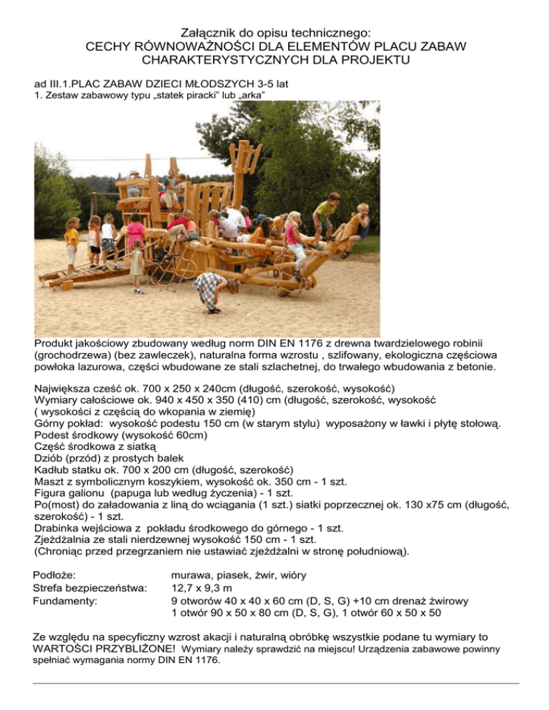 Załącznik do opisu technicznego: CECHY RÓWNOWAŻNOŚCI DLA ELEMENTÓW PLACU ZABAW CHARAKTERYSTYCZNYCH DLA PROJEKTU ad III.1.PLAC ZABAW DZIECI MŁODSZYCH 3-5 lat 1. Zestaw zabawowy typu „statek piracki” lub „arka” Produkt jakościowy zbudowany według norm DIN EN 1176 z drewna twardzielowego robinii (grochodrzewa) (bez zawleczek), naturalna forma wzrostu , szlifowany, ekologiczna częściowa powłoka lazurowa, części wbudowane ze stali szlachetnej, do trwałego wbudowania z betonie. Największa cześć ok. 700 x 250 x 240cm (długość, szerokość, wysokość) Wymiary całościowe ok. 940 x 450 x 350 (410) cm (długość, szerokość, wysokość ( wysokości z częścią do wkopania w ziemię) Górny pokład: wysokość podestu 150 cm (w starym stylu) wyposażony w ławki i płytę stołową. Podest środkowy (wysokość 60cm) Część środkowa z siatką Dziób (przód) z prostych balek Kadłub statku ok. 700 x 200 cm (długość, szerokość) Maszt z symbolicznym koszykiem, wysokość ok. 350 cm - 1 szt. Figura galionu (papuga lub według życzenia) - 1 szt. Po(most) do załadowania z liną do wciągania (1 szt.) siatki poprzecznej ok. 130 x75 cm (długość, szerokość) - 1 szt. Drabinka wejściowa z pokładu środkowego do górnego - 1 szt. Zjeżdżalnia ze stali nierdzewnej wysokość 150 cm - 1 szt. (Chroniąc przed przegrzaniem nie ustawiać zjeżdżalni w stronę południową). Podłoże: Strefa bezpieczeństwa: Fundamenty: murawa, piasek, żwir, wióry 12,7 x 9,3 m 9 otworów 40 x 40 x 60 cm (D, S, G) +10 cm drenaż żwirowy 1 otwór 90 x 50 x 80 cm (D, S, G), 1 otwór 60 x 50 x 50 Ze względu na specyficzny wzrost akacji i naturalną obróbkę wszystkie podane tu wymiary to WARTOŚCI PRZYBLIŻONE! Wymiary należy sprawdzić na miejscu! Urządzenia zabawowe powinny spełniać wymagania normy DIN EN 1176. ad III.2. PLAC ZABAW DZIECI STARSZYCH – typu „Małpi gaj” 1. „Brama wejściowa” Wymiary: Wymagane miejsce wraz ze strefą bezpieczeństwa: Podłoże: Fundamenty: ok. 130 x 30 x 210 (290) cm (D,S,W [W z częścia podziemną]) ok. 4,3 x 3,3 m Poddasze, murawa, piasek, żwir, wióry 2 otwory 40 x 40 x 80 cm (D, S, G) w tym wypadku +10 cm drenaż żwirowy 2. „Przejście na rozstaju dróg” Wymiary: Wymagane miejsce wraz ze strefą bezpieczeństwa: Podłoże: Fundamenty: ok. 295 x 110 x 120 (200) cm (D,S,W [W z częścia podziemną]) ok. 6 x 4,1 m Poddasze, murawa, piasek, żwir, wióry 4 otwory 40 x 40 x 80 cm (D, S, G) w tym wypadku +10 cm drenaż żwirowy 3. „Gęstwina” Wymiary: Wymagane miejsce wraz ze strefą bezpieczeństwa: Podłoże: Fundamenty: ok. 295 x 130 x 180 (260) cm (D,S,W [W z częścia podziemną]) ok. 6 x 4,3 m murawa, piasek, żwir, wióry 4 otwory 40 x 40 x 80 cm (D, S, G) w tym wypadku +10 cm drenaż żwirowy 4. Drabinka do balansowania – zestaw do wieszania (liny pionowe) Wymiary: Wymagane miejsce wraz ze strefą bezpieczeństwa: Podłoże: Fundamenty: ok. 295 x 130 x 170 (250) cm (D,S,W [W z częścia podziemną]) ok. 6 x 4,3 m Poddasze, murawa, piasek, żwir, wióry 4 otwory 40 x 40 x 80 cm (D, S, G) w tym wypadku +10 cm drenaż żwirowy Ze względu na specyficzny wzrost akacji i naturalną obróbkę wszystkie podane tu wymiary to WARTOŚCI PRZYBLIŻONE! Wymiary należy sprawdzić na miejscu! Urządzenia zabawowe powinny spełniać wymagania normy DIN EN 1176.
