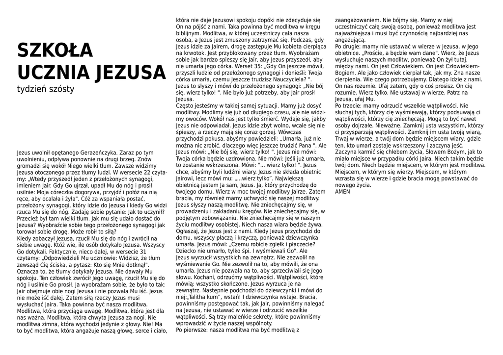 SZKOŁA UCZNIA JEZUSA tydzień szósty Jezus uwolnił opętanego Gerazeńczyka. Zaraz po tym uwolnieniu, odpływa ponownie na drugi brzeg. Znów gromadzi się wokół Niego wielki tłum. Zawsze widzimy Jezusa otoczonego przez tłumy ludzi. W wersecie 22 czytamy: „Wtedy przyszedł jeden z przełożonych synagogi, imieniem Jair. Gdy Go ujrzał, upadł Mu do nóg i prosił usilnie: Moja córeczka dogorywa, przyjdź i połóż na nią ręce, aby ocalała i żyła". Cóż za wspaniała postać, przełożony synagogi, który idzie do Jezusa i kiedy Go widzi rzuca Mu się do nóg. Zadaję sobie pytanie: Jak to uczynił? Przecież był tam wielki tłum. Jak mu się udało dostać do Jezusa? Wyobraźcie sobie tego przełożonego synagogi jak torował sobie drogę. Może robił to siłą? Kiedy zobaczył Jezusa, rzucił Mu się do nóg i zwrócił na siebie uwagę. Któż wie, ile osób dotykało Jezusa. Wszyscy Go dotykali. Faktycznie, nieco dalej, w wersecie 31 czytamy: „Odpowiedzieli Mu uczniowie: Widzisz, że tłum zewsząd Cię ściska, a pytasz: Kto się Mnie dotknął". Oznacza to, że tłumy dotykały Jezusa. Nie dawały Mu spokoju. Ten człowiek zwrócił Jego uwagę, rzucił Mu się do nóg i usilnie Go prosił. Ja wyobrażam sobie, że było to tak: Jair obejmuje obie nogi Jezusa i nie pozwala Mu iść. Jezus nie może iść dalej. Zatem siłą rzeczy Jezus musi wysłuchać Jaira. Taka powinna być nasza modlitwa. Modlitwa, która przyciąga uwagę. Modlitwa, która jest dla nas ważna. Modlitwa, która chwyta Jezusa za nogi. Nie modlitwa zimna, która wychodzi jedynie z głowy. Nie! Ma to być modlitwa, która angażuje naszą głowę, serce i ciało, która nie daje Jezusowi spokoju dopóki nie zdecyduje się On na pójść z nami. Taka powinna być modlitwa w kręgu biblijnym. Modlitwa, w której uczestniczy cała nasza osoba, a Jezus jest zmuszony zatrzymać się. Podczas, gdy Jezus idzie za Jairem, drogę zastępuje Mu kobieta cierpiąca na krwotok. Jest przyblokowany przez tłum. Wyobrażam sobie jak bardzo spieszy się Jair, aby Jezus przyszedł, aby nie umarła jego córka. Werset 35: „Gdy On jeszcze mówił, przyszli ludzie od przełożonego synagogi i donieśli: Twoja córka umarła, czemu Jeszcze trudzisz Nauczyciela? ". Jezus to słyszy i mówi do przełożonego synagogi: „Nie bój się, wierz tylko! ". Nie było już potrzeby, aby Jair prosił Jezusa. Często jesteśmy w takiej samej sytuacji. Mamy już dosyć modlitwy. Modlimy się już od długiego czasu, ale nie widzimy owoców. Wokół nas jest tylko śmierć. Wydaje się, jakby Jezus nie odpowiadał. Jezus idzie zbyt wolno, wcale się nie śpieszy, a rzeczy mają się coraz gorzej. Wówczas przychodzi pokusa, abyśmy powiedzieli: „Umarła, już nie można nic zrobić, dlaczego więc jeszcze trudzić Pana ". Ale Jezus mówi: „Nie bój się, wierz tylko! ". Jezus nie mówi: Twoja córka będzie uzdrowiona. Nie mówi: Jeśli już umarła, to zostanie wskrzeszona. Mówi: "... wierz tylko! ". Jezus chce, abyśmy byli ludźmi wiary. Jezus nie składa obietnic Jairowi, lecz mówi mu: „...wierz tylko”. Największą obietnicą jestem Ja sam, Jezus. Ja, który przychodzę do twojego domu. Wierz w moc twojej modlitwy Jairze. Zatem bracia, my również mamy uchwycić się naszej modlitwy. Jezus słyszy naszą modlitwę. Nie zniechęcajmy się, w prowadzeniu i zakładaniu kręgów. Nie zniechęcajmy się, w podjętym zobowiązaniu. Nie zniechęcajmy się w naszym życiu modlitwy osobistej. Niech nasza wiara będzie żywa. Ogłaszaj, że Jezus jest z nami. Kiedy Jezus przychodzi do domu, wszyscy płaczą i krzyczą, ponieważ dziewczynka umarła. Jezus mówi: „Czemu robicie zgiełk i płaczecie? Dziecko nie umarło, tylko śpi. I wyśmiewali Go". Ale Jezus wyrzucił wszystkich na zewnątrz. Nie zezwolił na wyśmiewanie Go. Nie zezwolił na to, aby mówili, że ona umarła. Jezus nie pozwala na to, aby sprzeciwiali się Jego słowu. Kochani, odrzućmy wątpliwości. Wątpliwości, które mówią: wszystko skończone. Jezus wyrzuca je na zewnątrz. Następnie podchodzi do dziewczynki i mówi do niej:„Talitha kum”, wstań! I dziewczynka wstaje. Bracia, powinniśmy postępować tak, jak Jair, powinniśmy nalegać na Jezusa, nie ustawać w wierze i odrzucić wszelkie wątpliwości. Są trzy maleńkie sekrety, które powinniśmy wprowadzić w życie naszej wspólnoty. Po pierwsze: nasza modlitwa ma być modlitwą z zaangażowaniem. Nie bójmy się. Mamy w niej uczestniczyć całą swoją osobą, ponieważ modlitwa jest najważniejsza i musi być czynnością najbardziej nas angażującą. Po drugie: mamy nie ustawać w wierze w Jezusa, w Jego obietnice. „Proście, a będzie wam dane". Wierz, że Jezus wysłuchuje naszych modlitw, ponieważ On żył tutaj, między nami. On jest Człowiekiem. On jest CzłowiekiemBogiem. Ale jako człowiek cierpiał tak, jak my. Zna nasze cierpienia. Wie czego potrzebujemy. Dlatego idzie z nami. On nas rozumie. Ufaj zatem, gdy o coś prosisz. On cię rozumie. Wierz tylko. Nie ustawaj w wierze. Patrz na Jezusa, ufaj Mu. Po trzecie: mamy odrzucić wszelkie wątpliwości. Nie słuchaj tych, którzy cię wyśmiewają, którzy podsuwają ci wątpliwości, którzy cię zniechęcają. Mogą to być nawet osoby dojrzałe. Nieważne. Zamknij usta wszystkim, którzy ci przysparzają wątpliwości. Zamknij im usta twoją wiarą, Trwaj w wierze, a twój dom będzie miejscem wiary, gdzie ten, kto umarł zostaje wskrzeszony i zaczyna jeść. Zaczyna karmić się chlebem życia, Słowem Bożym, jak to miało miejsce w przypadku córki Jaira. Niech takim będzie twój dom. Niech będzie miejscem, w którym jest modlitwa. Miejscem, w którym się wierzy. Miejscem, w którym wzrasta się w wierze i gdzie bracia mogą powstawać do nowego życia. AMEN Wtorek Środa Czwartek Mk 5,21-24 Gdy Jezus przeprawił się z powrotem w łodzi na drugi brzeg, zebrał się wielki tłum wokół Niego, a On był jeszc