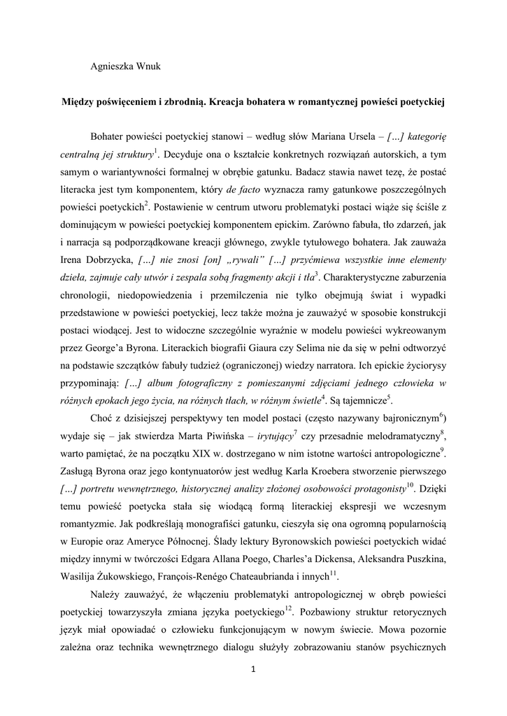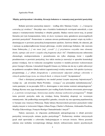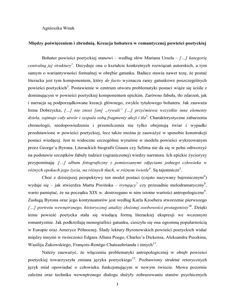 Agnieszka Wnuk Między poświęceniem i zbrodnią. Kreacja bohatera w romantycznej powieści poetyckiej Bohater powieści poetyckiej stanowi – według słów Mariana Ursela – […] kategorię centralną jej struktury1. Decyduje ona o kształcie konkretnych rozwiązań autorskich, a tym samym o wariantywności formalnej w obrębie gatunku. Badacz stawia nawet tezę, że postać literacka jest tym komponentem, który de facto wyznacza ramy gatunkowe poszczególnych powieści poetyckich2. Postawienie w centrum utworu problematyki postaci wiąże się ściśle z dominującym w powieści poetyckiej komponentem epickim. Zarówno fabuła, tło zdarzeń, jak i narracja są podporządkowane kreacji głównego, zwykle tytułowego bohatera. Jak zauważa Irena Dobrzycka, […] nie znosi [on] „rywali” […] przyćmiewa wszystkie inne elementy dzieła, zajmuje cały utwór i zespala sobą fragmenty akcji i tła3. Charakterystyczne zaburzenia chronologii, niedopowiedzenia i przemilczenia nie tylko obejmują świat i wypadki przedstawione w powieści poetyckiej, lecz także można je zauważyć w sposobie konstrukcji postaci wiodącej. Jest to widoczne szczególnie wyraźnie w modelu powieści wykreowanym przez George’a Byrona. Literackich biografii Giaura czy Selima nie da się w pełni odtworzyć na podstawie szczątków fabuły tudzież (ograniczonej) wiedzy narratora. Ich epickie życiorysy przypominają: […] album fotograficzny z pomieszanymi zdjęciami jednego człowieka w różnych epokach jego życia, na różnych tłach, w różnym świetle4. Są tajemnicze5. Choć z dzisiejszej perspektywy ten model postaci (często nazywany bajronicznym6) wydaje się – jak stwierdza Marta Piwińska – irytujący7 czy przesadnie melodramatyczny8, warto pamiętać, że na początku XIX w. dostrzegano w nim istotne wartości antropologiczne9. Zasługą Byrona oraz jego kontynuatorów jest według Karla Kroebera stworzenie pierwszego […] portretu wewnętrznego, historycznej analizy złożonej osobowości protagonisty10. Dzięki temu powieść poetycka stała się wiodącą formą literackiej ekspresji we wczesnym romantyzmie. Jak podkreślają monografiści gatunku, cieszyła się ona ogromną popularnością w Europie oraz Ameryce Północnej. Ślady lektury Byronowskich powieści poetyckich widać między innymi w twórczości Edgara Allana Poego, Charles’a Dickensa, Aleksandra Puszkina, Wasilija Żukowskiego, François-Renégo Chateaubrianda i innych11. Należy zauważyć, że włączeniu problematyki antropologicznej w obręb powieści poetyckiej towarzyszyła zmiana języka poetyckiego12. Pozbawiony struktur retorycznych język miał opowiadać o człowieku funkcjonującym w nowym świecie. Mowa pozornie zależna oraz technika wewnętrznego dialogu służyły zobrazowaniu stanów psychicznych 1 postaci. Znamienne, że organizacja wierszowa nie zaburzała, przynajmniej u czytelnika dziewiętnastowiecznego, poczucia autentyzmu. Zdaniem Ireny Dobrzyckiej, bohater wierszowanych utworów Byrona: […] nawołujący do czynu, sam ginący w walce, odzwierciedla konflikt rozdzierający współczesnych: pragnienie czynu połączone z poczuciem bezsilności, bezpłodności buntu jednostkowego, chwilami nawet z zachwianiem wiary w rolę jednostek wyjątkowych. W powieściach poetyckich doskonałe odbicie znalazło […] żywe wciąż hasło rewolucji francuskiej, hasło indywidualizmu w życiu społecznym, zarówno jak i prywatnym13. Spośród określeń charakteryzujących omawiany model postaci najtrafniejsze wydaje się sformułowanie człowiek ekstremalnych doświadczeń, rozpięty między niebem i piekłem, najczęściej opisywany za pomocą sprzecznych, oksymoronicznych terminów: szlachetny zbrodniarz, anioł zemsty itp., łączący w sobie cechy czułego kochanka i brato- lub ojcobójcy. Jest to postać, która – niczym Byronowski Korsarz – jedną ręką zabija wrogów, a drugą ratuje kobiety z płonącego haremu14. W tym charakterystycznym, metaforycznym obrazie kumulują się podstawowe założenia romantycznej antropologii. Człowiek jawi się jako istota zawieszona między bytami, nieustannie przekraczająca własną cielesność i zdążająca ku sferze ducha, łącząca skrajności, charakteryzująca się wieczną potencjalnością15. Podobny, pozornie sprzeczny wewnętrznie, mechanizm działania możemy zaobserwować u Mickiewiczowskiego Wallenroda, który […] płakał, ażeby mordować16, czy też Wacława z powieści Malczewskiego. W odczuciu romantycznych komentatorów Marii (Mickiewicza, Mochnackiego etc.) sugerowane w toku akcji ojcobójstwo miało stanowić nie tyle dowód na zdegenerowanie duszy bohatera, ile raczej świadectwo krańcowego poświęcenia. Zgodnie z tą logiką pomszczenie, tu na ziemi, ukochanej małżonki okazywało się ważniejsze, bardziej wartościowe niż czyste sumienie i chrześcijańska perspektywa szczęścia w zaświatach. W kreacji bohatera powieści poetyckiej odnajdujemy jedną z najpełniejszych wersji romantycznego indywidualizmu, nakreśloną – rzecz znamienna – za pomocą zaledwie kilku charakterystycznych rysów. Obok wspomnianej już tajemnicy otaczającej postać protagonisty na jego wizerunek składają się również: ostentacyjne samotnictwo17, skrajne zaangażowanie w realizację określonego, wyższego celu (oswobodzenie ojczyzny, pomszczenie zmarłej ukochanej itp.) oraz elementy demonizmu. Autorom powieści poetyckich szło o ukazanie nowego doświadczenia – doświadczenia nowożytnego człowieka zdolnego wyodrębnić 2 jednostkę ze zbiorowości jako podmiotowość, która może stać się dla siebie autonomiczną wartością i w sobie – w swoim sumieniu znaleźć miarę wartości świata ludzkiego18. Tacy bohaterowie, jak Nebaba z Zamku kaniowskiego, tytułowy jeniec kaukaski Puszkina czy Byronowski Lara, to postaci świadome swojej podmiotowości. Krąg wyznawanych przez nie wartości zostaje skoncentrowany wokół ich