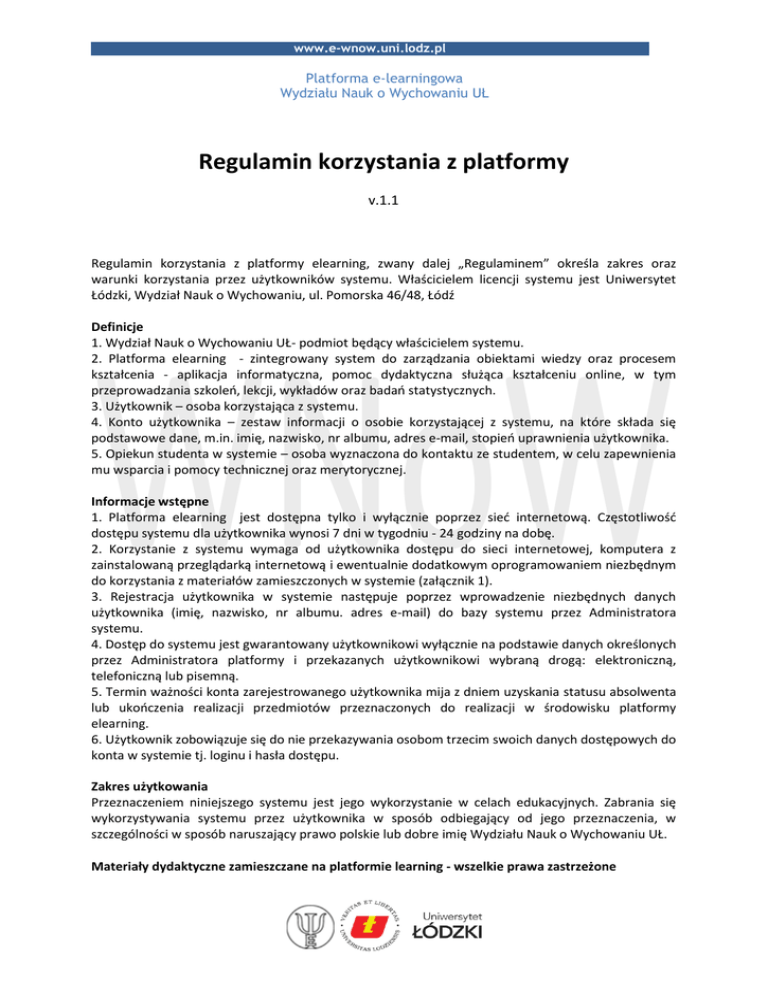 www.e-wnow.uni.lodz.pl Platforma e-learningowa Wydziału Nauk o Wychowaniu UŁ Regulamin korzystania z platformy v.1.1 Regulamin korzystania z platformy elearning, zwany dalej „Regulaminem” określa zakres oraz warunki korzystania przez użytkowników systemu. Właścicielem licencji systemu jest Uniwersytet Łódzki, Wydział Nauk o Wychowaniu, ul. Pomorska 46/48, Łódź Definicje 1. Wydział Nauk o Wychowaniu UŁ- podmiot będący właścicielem systemu. 2. Platforma elearning - zintegrowany system do zarządzania obiektami wiedzy oraz procesem kształcenia - aplikacja informatyczna, pomoc dydaktyczna służąca kształceniu online, w tym przeprowadzania szkoleń, lekcji, wykładów oraz badań statystycznych. 3. Użytkownik – osoba korzystająca z systemu. 4. Konto użytkownika – zestaw informacji o osobie korzystającej z systemu, na które składa się podstawowe dane, m.in. imię, nazwisko, nr albumu, adres e-mail, stopień uprawnienia użytkownika. 5. Opiekun studenta w systemie – osoba wyznaczona do kontaktu ze studentem, w celu zapewnienia mu wsparcia i pomocy technicznej oraz merytorycznej. Informacje wstępne 1. Platforma elearning jest dostępna tylko i wyłącznie poprzez sieć internetową. Częstotliwość dostępu systemu dla użytkownika wynosi 7 dni w tygodniu - 24 godziny na dobę. 2. Korzystanie z systemu wymaga od użytkownika dostępu do sieci internetowej, komputera z zainstalowaną przeglądarką internetową i ewentualnie dodatkowym oprogramowaniem niezbędnym do korzystania z materiałów zamieszczonych w systemie (załącznik 1). 3. Rejestracja użytkownika w systemie następuje poprzez wprowadzenie niezbędnych danych użytkownika (imię, nazwisko, nr albumu. adres e-mail) do bazy systemu przez Administratora systemu. 4. Dostęp do systemu jest gwarantowany użytkownikowi wyłącznie na podstawie danych określonych przez Administratora platformy i przekazanych użytkownikowi wybraną drogą: elektroniczną, telefoniczną lub pisemną. 5. Termin ważności konta zarejestrowanego użytkownika mija z dniem uzyskania statusu absolwenta lub ukończenia realizacji przedmiotów przeznaczonych do realizacji w środowisku platformy elearning. 6. Użytkownik zobowiązuje się do nie przekazywania osobom trzecim swoich danych dostępowych do konta w systemie tj. loginu i hasła dostępu. Zakres użytkowania Przeznaczeniem niniejszego systemu jest jego wykorzystanie w celach edukacyjnych. Zabrania się wykorzystywania systemu przez użytkownika w sposób odbiegający od jego przeznaczenia, w szczególności w sposób naruszający prawo polskie lub dobre imię Wydziału Nauk o Wychowaniu UŁ. Materiały dydaktyczne zamieszczane na platformie learning - wszelkie prawa zastrzeżone www.e-wnow.uni.lodz.pl Przeznaczeniem materiałów dydaktycznych zamieszczanych na platformie przez wykładowców jest ich odtworzenie przez studenta w zamkniętym środowisku platformy learning WNoW UŁ. Zabrania się kopiowania, modyfikowania i udostępniania materiałów poza środowiskiem platformy, chyba że wykładowca ustala inaczej. Wszystkie materiały dydaktyczne zamieszczane na platformie learning chronione są prawem autorskim. Łamanie prawa w tym zakresie będzie ścigane z urzędu. Zastrzeżenia 1. Wydział Nauk o Wychowaniu UŁ zastrzega sobie prawo do stałego lub czasowego wyłączenia dostępu do systemu dla użytkownika, który korzysta z systemu w sposób niezgodny z niniejszym regulaminem, w szczególności przy udostępnianiu danych dostępowych osobom trzecim a także wykorzystywania informacji znajdujących się w systemie w sposób mogący spowodować szkodę dla Uczelni. 2. Użytkownika obowiązuje zakaz umieszczania w systemie informacji, powodujących łamanie prawa polskiego (ze szczególnym uwzględnieniem prawa autorskiego). 3. Użytkownik, korzystając z systemu w procesie kształcenia zobowiązany jest do stosowania się do zasad tzw. etykiety (zbiór zasad przyzwoitego zachowania w Internecie). Nie przestrzeganie zasad obliguje administratora systemu do zablokowania konta użytkownika. Ponowne przydzielenie możliwości korzystania z zasobów systemu może nastąpić dopiero po wyjaśnieniu przyczyn zablokowania dostępu. Pomoc techniczna 1. Użytkownik zgłasza wszelkie pytania i nieprawidłowości związane z wykorzystywaniem systemu na adres e-mail [email protected] lub telefonicznie 42 66 55 067 lub osobiście ul. Pomorska 46/48 Wydział Nauk o Wychowaniu, parter, budynek B, pokój 7. 2. Wydział Nauk o Wychowaniu UŁ dołoży wszelkich starań do usunięcia powstałych nieprawidłowości systemu na miarę możliwości technicznych, w przypadku powstałych nieprawidłowości, których WNoW UŁ nie jest w stanie usunąć - w terminach określonych przez zewnętrznego dostawcę systemu – nie dłużej niż 10 dni roboczych. 3. Wydział Nauk o Wychowaniu UŁ nie odpowiada za szkody użytkownika, jakie poniósł w wyniku nieprawidłowego funkcjonowania systemu. Jednakże dołoży wszelkich starań by pomóc użytkownikowi odzyskać utracone dane. Postanowienia końcowe 1. Wydział Nauk o Wychowaniu UŁ zastrzega sobie prawo do zmiany postanowień niniejszego regulaminu. 2. Wydział Nauk o Wychowaniu UŁ zobowiązuje się do powiadomienia użytkowników w przypadku dokonania zmian regulaminu korzystania z systemu w przeciągu 2 dni roboczych od dokonania zmiany. 3. Odmowa przyjęcia dokonanych zmian, oznacza rezygnację z platformy elearning. W takim przypadku użytkownik zobowiązany jest do powiadomienia Administratora systemu na adres e-mail [email protected], w celu usunięcia konta użytkownika. www.e-wnow.uni.lodz.pl Załącznik nr 1 1. Wymagania techniczne dla stacji roboczej użytkownika. System operacyjny: - Mac OS - Windows - Linux Debian 6.0 Przeglądarka Internetowa: - Google Chrome - Safari - Internet Explorer - Mozilla FireFox - Opera