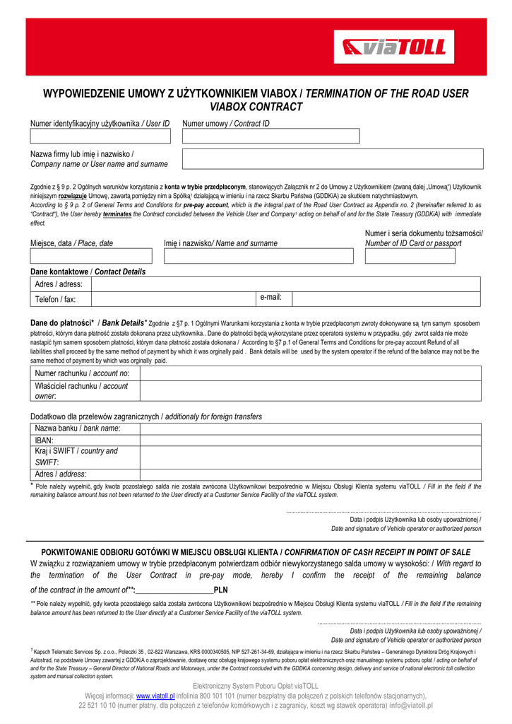 WYPOWIEDZENIE UMOWY Z UŻYTKOWNIKIEM VIABOX / TERMINATION OF THE ROAD USER VIABOX CONTRACT Numer identyfikacyjny użytkownika / User ID Numer umowy / Contract ID Nazwa firmy lub imię i nazwisko / Company name or User name and surname Zgodnie z § 9 p. 2 Ogólnych warunków korzystania z konta w trybie przedpłaconym, stanowiących Załącznik nr 2 do Umowy z Użytkownikiem (zwaną dalej „Umową“) Użytkownik niniejszym rozwiązuje Umowę, zawartą pomiędzy nim a Spółką1 działającą w imieniu i na rzecz Skarbu Państwa (GDDKiA) ze skutkiem natychmiastowym. According to § 9 p. 2 of General Terms and Conditions for pre-pay account, which is the integral part of the Road User Contract as Appendix no. 2 (hereinafter referred to as “Contract“), the User hereby terminates the Contract concluded between the Vehicle User and Company1 acting on behalf of and for the State Treasury (GDDKiA) with immediate effect. Miejsce, data / Place, date Numer i seria dokumentu tożsamości/ Number of ID Card or passport Imię i nazwisko/ Name and surname Dane kontaktowe / Contact Details Adres / adress: e-mail: Telefon / fax: Dane do płatności* / Bank Details* Zgodnie z §7 p. 1 Ogólnymi Warunkami korzystania z konta w trybie przedpłaconym zwroty dokonywane są tym samym sposobem płatności, którym dana płatność została dokonana przez użytkownika.. Dane do płatności będą wykorzystane przez operatora systemu w przypadku, gdy zwrot salda nie może nastąpić tym samem sposobem płatności, którym dana płatność została dokonana / According to §7 p.1 of General Terms and Conditions for pre-pay account Refund of all liabilities shall proceed by the same method of payment by which it was orginally paid . Bank details will be used by the system operator if the refund of the balance may not be the same method of payment by which was orginally paid. Numer rachunku / account no: Właściciel rachunku / account owner: Dodatkowo dla przelewów zagranicznych / additionaly for foreign transfers Nazwa banku / bank name: IBAN: Kraj i SWIFT / country and SWIFT: Adres / address: * Pole należy wypełnić, gdy kwota pozostałego salda nie została zwrócona Użytkownikowi bezpośrednio w Miejscu Obsługi Klienta systemu viaTOLL / Fill in the field if the remaining balance amount has not been returned to the User directly at a Customer Service Facility of the viaTOLL system. ............................................................................................................................ Data i podpis Użytkownika lub osoby upoważnionej / Date and signature of Vehicle operator or authorized person POKWITOWANIE ODBIORU GOTÓWKI W MIEJSCU OBSŁUGI KLIENTA / CONFIRMATION OF CASH RECEIPT IN POINT OF SALE W związku z rozwiązaniem umowy w trybie przedpłaconym potwierdzam odbiór niewykorzystanego salda umowy w wysokości: / With regard to the termination of the User Contract in pre-pay mode, hereby I confirm the receipt of the remaining balance of the contract in the amount of**:____________________PLN ** Pole należy wypełnić, gdy kwota pozostałego salda została zwrócona Użytkownikowi bezpośrednio w Miejscu Obsługi Klienta systemu viaTOLL / Fill in the field if the remaining balance amount has been returned to the User directly at a Customer Service Facility of the viaTOLL system. ........................................................................................................ Data i podpis Użytkownika lub osoby upoważnionej / Date and signature of Vehicle operator or authorized person 1 Kapsch Telematic Services Sp. z o.o., Poleczki 35 , 02-822 Warszawa, KRS 0000340505, NIP 527-261-34-69, działająca w imieniu i na rzecz Skarbu Państwa – Generalnego Dyrektora Dróg Krajowych i Autostrad, na podstawie Umowy zawartej z GDDKiA o zaprojektowanie, dostawę oraz obsługę krajowego systemu poboru opłat elektronicznych oraz manualnego systemu poboru opłat / acting on belhaf of and for the State Treasury – General Director of National Roads and Motorways, under the Contract concluded with the GDDKiA concerning design, delivery and service of national electronic toll collection system and manual collection system. Elektroniczny System Poboru Opłat viaTOLL Więcej informacji: www.viatoll.pl infolinia 800 101 101 (numer bezpłatny dla połączeń z polskich telefonów stacjonarnych), 22 521 10 10 (numer płatny, dla połączeń z telefonów komórkowych i z zagranicy, koszt wg stawek operatora) [email protected]