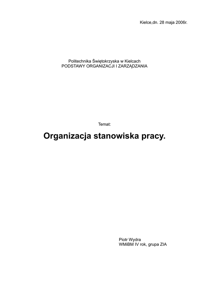 Kielce,dn. 28 maja 2006r. Politechnika Świętokrzyska w Kielcach PODSTAWY ORGANIZACJI I ZARZĄDZANIA Temat: Organizacja stanowiska pracy. Piotr Wydra WMiBM IV rok, grupa ZIA Elementarną jednostką produkcyjną, w przedsiębiorstwie lub instytucji jest stanowisko pracy, czyli miejsce pracy (stanowisko robocze). Składa się ono z następujących elementów: • powierzchni produkcyjnej (frontu robót), • zasobów pracy, tj. wyposażenia technicznego, materiałów, sprzętu i narzędzi, • obsługi stanowiska roboczego (robotnik lub zespół roboczy). • procesu wykonywania określonego zadania lub jego części. Klasyfikację stanowisk pracy można dokonać na podstawie przyjętych kryteriów: 1 l w zależności od charakteru wykonywanych czynności rozróżnia się stanowiska: • produkcyjne, • pomocnicze. • usługowe. w zależności od liczby operacji wyróżnia się stanowiska: • specjalizowane. • uniwersalne, według stopnia mechanizacji pracy wyróżnia się stanowiska pracy: • ręczne, • maszynowo-ręczne,, • maszynowe, • aparaturowe, • zautomatyzowane, na podstawie liczby robotników pracujących na danym stanowisku pracy klasyfikuje się je na: • indywidualne (jednoosobowe), • zespołowe (wieloosobowe) Stanowiska pracy wymagają dobrej obsługi transportowej i konserwacyinonemomowejNiezmiernie ważne jest zapewnienie odpowiednich warunków otoczenia w miejscu pracy, które dotyczą: • zapewnienia prawidłowego oświetlenia, • eliminacji hałasów, • utrzymania należytej temperatury (np. w budownictwie zwłaszcza dla procesów wykończeniowych. • zapewnienia bezpieczeństwa i higieny pracy, • doboru odpowiedniego sprzętu i narzędzi pracy Najistotniejszym elementem stanowiska roboczego jest człowiek, który wpływając na pozostałe elementy, decyduje o osiąganych wynikach pracy. Człowiek w procesie pracy oddziałując na wyrób wykonuje szereg niezbędnych czynności i ruchów. Podział procesu pracy na ruchy robocze, ich analiza stanowi podstawę w doskonaleniu przebiegu pracy na stanowisku roboczym Zagadnieniami tymi zajmuje się nauka: ergonomia, ekonometria, socjologia i fizjologia pracy Stanowiska robocze powinno być dostosowane do funkcji, które ma spelniać oraz do zależności, jakie występują między nim i innymi składnikami struktury organizacyjnej (produkcyjnej). do której to stanowisko należy. Stanowisko robocze można scharakteryzować biorąc pod uwagę następujące kryteria: • cel działania, • wyjścia stanowiące wynik pracy na stanowisku. • wejścia w postaci informacji, zasobów, • sposób wykonania pracy, • otoczenie stanowiska, • wyposażenie, jsgo rodzaj, rozmieszczenie, sposób wykorzystań Właściwa organizacja stanowisk pracy zapewnia łatwe i bezpieczne wykonywanie pracy oraz ogranicza niepotrzebny wysiłek, a także stanowi ochronę pracownika przed obrażeniami i szkodliwymi wpływami. Organizowanie – decydowanie o najlepszym grupowaniu działań i zasobów organizacji. Przy konstruowaniu organizacji menedżerowie mogą wykorzystać pięć podstawowych działań konstrukcyjnych: • • • • • Projektowanie stanowisk pracy Grupowanie stanowisk pracy Ustalenie hierarchicznej zależności pomiędzy poszczególnymi stanowiskami Rozdzielanie uprawnień decyzyjnych pomiędzy poszczególne stanowiska Koordynacja czynności pomiędzy stanowiskami Wymieniony zestaw elementów, wynik ich wykorzystania w postaci konkretnego układu elementów organizacji i ich wzajemnych powiązań tworzą strukturę organizacyjną. Pierwszym elementem konstrukcyjnym struktury organizacyjnej jest projektowanie stanowisk pracy. Polega ono na określeniu zakresu obowiązków poszczególnych osób pracujących w organizacji. Davis (1966) definiuje projektowanie stanowiska pracy jako „określenie treści, metod i powiązań stanowisk pracy w celu spełnienia wymogów technologicznych i organizacyjnych, jak również społecznych i osobistych wymagań osoby wykonującej daną pracę”. Projektowanie stanowiska pracy ma dwa cele. Pierwszy to spełnienie wymagań organizacji, dotyczących produktywności, wydajności operacyjnej oraz jakości produktu lub usługi. Drugi to zaspokojenie potrzeb jednostki w dziedzinie zainteresowań, wyzwań i osiągnięć. Cele te są w oczywisty sposób powiązane ze sobą, a ogólnym celem projektowania stanowiska pracy jest integracja potrzeb jednostki z potrzebami organizacji. Proces projektowania stanowiska pracy musi zaczynać się od analizy tego, co ma zostać wykonane - zadań, które należy zrealizować, jeśli organizacja lub jednostka organizacyjna ma osiągnąć swój cel. W tym punkcie stosuje się techniki planowania procesu, analizy systemów i badań nad pracą, które mają doprowadzić do poprawy wyników organizacji, czyli do pierwszego celu projektowania stanowiska pracy. Koncentrują się one na pracy, jaką należy wykonać - nie na osobie, która ją wykonuje. Mogą zaowocować wysokim stopniem specjalizacji zadań oraz systemem linii montażowej - zarówno w wypadku prac biurowych, jak i produktów fizycznych. Mogą także doprowadzić do maksymalizacji odpowiedzialności jednostki oraz możliwości wykorzystania osobistych umiejętności. Konieczne jest jednak rozróżnienie między wydajnością a skutecznością. Najbardziej wydajna metoda może na krótką metę spowodować maksymalizację wyników w porównaniu do wkładu, ale nie będzie skuteczna na dłuższą metę, ponieważ nie osiąga ogólnych celów danej działalności. Dążenie do krótkoterminowej wydajności poprzez narzucanie maksymalnej specjalizacji zadań może zmniejszyć długofalową skuteczność, pozbawiając pracowników motywacji oraz zwiększając płynność zatrudnienia i absencję. Punktem wyjścia projektowania stanowiska pracy muszą być wymagania związane z pracą, gdyż stanowią one przyczynę istnienia tego stanowiska pracy - zbyt wielu autorów projektów stanowis