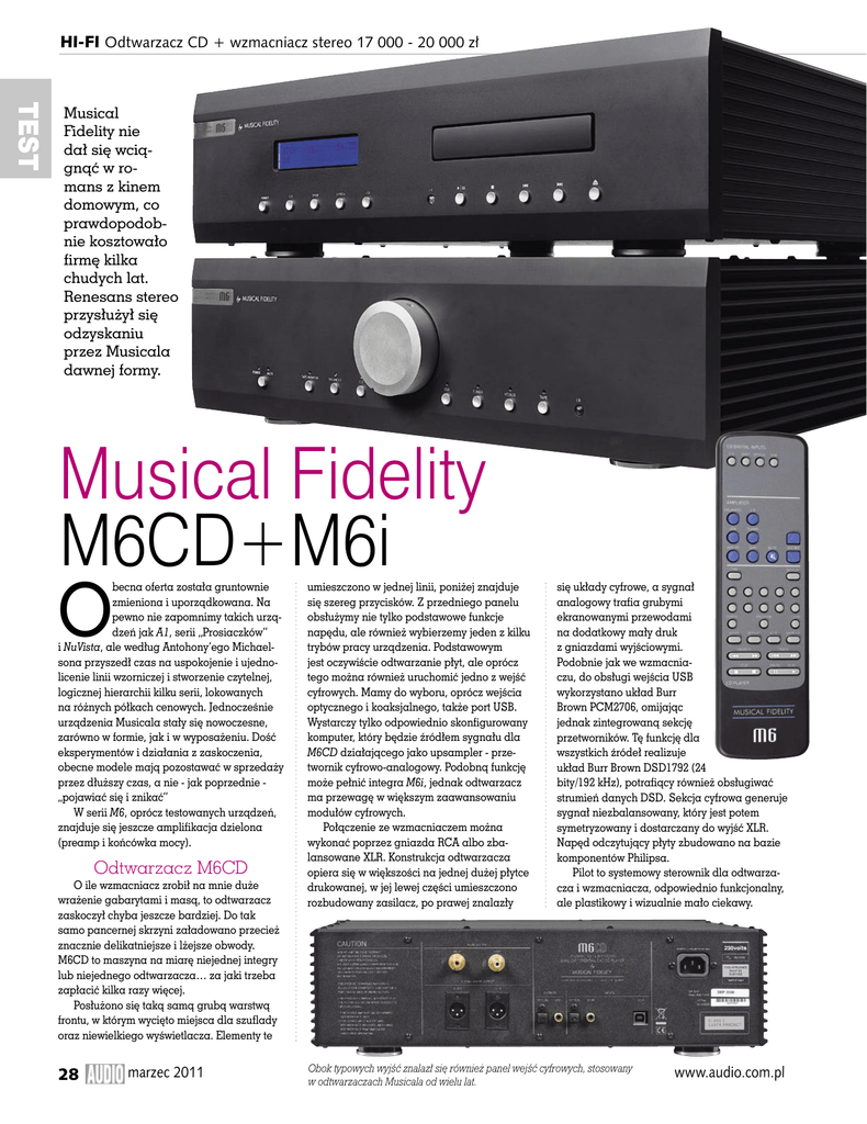 HI-FI Odtwarzacz CD + wzmacniacz stereo 17 000 - 20 000 zł TEST Musical Fidelity nie dał się wciągnąć w romans z kinem domowym, co prawdopodobnie kosztowało firmę kilka chudych lat. Renesans stereo przysłużył się odzyskaniu przez Musicala dawnej formy. Musical Fidelity M6CD+M6i O becna oferta została gruntownie zmieniona i uporządkowana. Na pewno nie zapomnimy takich urządzeń jak A1, serii „Prosiaczków” i NuVista, ale według Antohony’ego Michaelsona przyszedł czas na uspokojenie i ujednolicenie linii wzorniczej i stworzenie czytelnej, logicznej hierarchii kilku serii, lokowanych na różnych półkach cenowych. Jednocześnie urządzenia Musicala stały się nowoczesne, zarówno w formie, jak i w wyposażeniu. Dość eksperymentów i działania z zaskoczenia, obecne modele mają pozostawać w sprzedaży przez dłuższy czas, a nie - jak poprzednie „pojawiać się i znikać” W serii M6, oprócz testowanych urządzeń, znajduje się jeszcze amplifikacja dzielona (preamp i końcówka mocy). Odtwarzacz M6CD O ile wzmacniacz zrobił na mnie duże wrażenie gabarytami i masą, to odtwarzacz zaskoczył chyba jeszcze bardziej. Do tak samo pancernej skrzyni załadowano przecież znacznie delikatniejsze i lżejsze obwody. M6CD to maszyna na miarę niejednej integry lub niejednego odtwarzacza… za jaki trzeba zapłacić kilka razy więcej. Posłużono się taką samą grubą warstwą frontu, w którym wycięto miejsca dla szuflady oraz niewielkiego wyświetlacza. Elementy te 28 marzec 2011 umieszczono w jednej linii, poniżej znajduje się szereg przycisków. Z przedniego panelu obsłużymy nie tylko podstawowe funkcje napędu, ale również wybierzemy jeden z kilku trybów pracy urządzenia. Podstawowym jest oczywiście odtwarzanie płyt, ale oprócz tego można również uruchomić jedno z wejść cyfrowych. Mamy do wyboru, oprócz wejścia optycznego i koaksjalnego, także port USB. Wystarczy tylko odpowiednio skonfigurowany komputer, który będzie źródłem sygnału dla M6CD działającego jako upsampler - przetwornik cyfrowo-analogowy. Podobną funkcję może pełnić integra M6i, jednak odtwarzacz ma przewagę w większym zaawansowaniu modułów cyfrowych. Połączenie ze wzmacniaczem można wykonać poprzez gniazda RCA albo zbalansowane XLR. Konstrukcja odtwarzacza opiera się w większości na jednej dużej płytce drukowanej, w jej lewej części umieszczono rozbudowany zasilacz, po prawej znalazły się układy cyfrowe, a sygnał analogowy trafia grubymi ekranowanymi przewodami na dodatkowy mały druk z gniazdami wyjściowymi. Podobnie jak we wzmacniaczu, do obsługi wejścia USB wykorzystano układ Burr Brown PCM2706, omijając jednak zintegrowaną sekcję przetworników. Tę funkcję dla wszystkich źródeł realizuje układ Burr Brown DSD1792 (24 bity/192 kHz), potrafiący również obsługiwać strumień danych DSD. Sekcja cyfrowa generuje sygnał niezbalansowany, który jest potem symetryzowany i dostarczany do wyjść XLR. Napęd odczytujący płyty zbudowano na bazie komponentów Philipsa. Pilot to systemowy sterownik dla odtwarzacza i wzmacniacza, odpowiednio funkcjonalny, ale plastikowy i wizualnie mało ciekawy. Obok typowych wyjść znalazł się również panel wejść cyfrowych, stosowany w odtwarzaczach Musicala od wielu lat. www.audio.com.pl Wzmacniacz M6i Na ledwo widocznych nóżkach opiera się chyba największy wzmacniacz zintegrowany, jaki można znaleźć poniżej 10 000 zł. Różnica względem I32 (tutaj tłumaczy to amplifikacja cyfrowa Primare) i Naima jest trudna do zlekceważenia… Urządzenie jest bardzo ciężkie. Zanim jeszcze zajrzymy do wnętrza, widać, że wpływają na to grube elementy obudowy. Front wykonano z potężnego płata metalu, wysokie chassis pozwoliło wprowadzić duże pokrętło wzmocnienia; operowanie nim jest bardzo przyjemne. Obok tak dużego elementu szereg ośmiu przycisków wręcz znika, przypisano im rolę selektora wejść i wyłącznika zasilania. Każdy przycisk ma korespondującą z nim diodę. Wzmacniaczowi udaje się nastraszyć użytkownika ogromnymi profilami radiatorów zamocowanymi po dwóch stronach. Choć znamy przypadki posługiwania się przewymiarowanymi radiatorami na pokaz, to M6i do nich nie należy. Sprawdziliśmy to mierząc jego moc - w jednym kanale sięga ona przy niskiej impedancji niemal 400 watów! Na tylnej ściance powtarza się deklaracja budowy dual-mono, co przy gniazdach głośnikowych umieszczonych po obydwu stronach obudowy wydaje się całkiem prawdopodobne. M6i ma cztery wejścia liniowe RCA: jedno z nich służy jako pętla dla rejestratorów, drugie można skonfigurować do pracy w systemie wielokanałowym (z procesorem A/V w roli przedwzmacniacza). Oprócz tego są gniazda XLR, którymi producent poleca doprowadzić sygnał z firmowego odtwarzacza. Port USB nie służy nośnikom pamięci, jest traktowany na równi z innymi wejściami sygnału, trzeba tylko podłączyć komputer i odpowiednio go skonfigurować. Zaglądając do środka zauważymy tylko jeden transformator zasilający, traktując więc zagadnienie pryncypialnie można uznać, że M6i nie jest wzmacniaczem dual-mono. Można jednak podejść do tematu mniej surowo i przyjąć argumenty o zastosowaniu wydzielonych odczepów jedynego transformatora i cał- kowitym rozdzieleniu ścieżek sygnałowych dla obydwu kanałów. Każda z końcówek mocy pracuje z czterema Sankenami, wejścia wybierane są za pomocą scalonego przełącznika. Do obsługi portu USB służy scalak PCM2706, który dba zarówno o komunikację z komputerem, jak i konwersję sygnału cyfrowego na analogowy (16 bit/48 kHz). Ciekawie rozwiązano regulację głośności: pokrętło sprzężone jest z potencjometrem, który okazuje się jedynie czujnikiem, a właściwe tłumiki zawiera układ scalony Burr Brown PGA2320. Rozsunięte wyjścia głośnikowe są typowe dla wzmacniaczy dual-mono, poza tym ułatwiają podłączenie. R E K L A M 