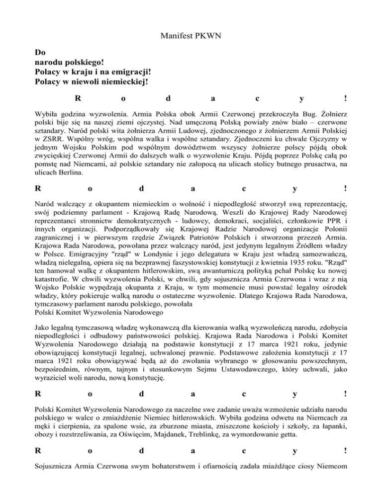 Manifest PKWN Do narodu polskiego! Polacy w kraju i na emigracji! Polacy w niewoli niemieckiej! R o d a c y ! Wybiła godzina wyzwolenia. Armia Polska obok Armii Czerwonej przekroczyła Bug. Żołnierz polski bije się na naszej ziemi ojczystej. Nad umęczoną Polską powiały znów biało – czerwone sztandary. Naród polski wita żołnierza Armii Ludowej, zjednoczonego z żołnierzem Armii Polskiej w ZSRR. Wspólny wróg, wspólna walka i wspólne sztandary. Zjednoczeni ku chwale Ojczyzny w jednym Wojsku Polskim pod wspólnym dowództwem wszyscy żołnierze polscy pójdą obok zwycięskiej Czerwonej Armii do dalszych walk o wyzwolenie Kraju. Pójdą poprzez Polskę całą po pomstę nad Niemcami, aż polskie sztandary nie załopocą na ulicach stolicy butnego prusactwa, na ulicach Berlina. R o d a c y ! Naród walczący z okupantem niemieckim o wolność i niepodległość stworzył swą reprezentację, swój podziemny parlament - Krajową Radę Narodową. Weszli do Krajowej Rady Narodowej reprezentanci stronnictw demokratycznych - ludowcy, demokraci, socjaliści, członkowie PPR i innych organizacji. Podporządkowały się Krajowej Radzie Narodowej organizacje Polonii zagranicznej i w pierwszym rzędzie Związek Patriotów Polskich i stworzona przezeń Armia. Krajowa Rada Narodowa, powołana przez walczący naród, jest jedynym legalnym Źródłem władzy w Polsce. Emigracyjny "rząd" w Londynie i jego delegatura w Kraju jest władzą samozwańczą, władzą nielegalną, opiera się na bezprawnej faszystowskiej konstytucji z kwietnia 1935 roku. "Rząd" ten hamował walkę z okupantem hitlerowskim, swą awanturniczą polityką pchał Polskę ku nowej katastrofie. W chwili wyzwolenia Polski, w chwili, gdy sojusznicza Armia Czerwona i wraz z nią Wojsko Polskie wypędzają okupanta z Kraju, w tym momencie musi powstać legalny ośrodek władzy, który pokieruje walką narodu o ostateczne wyzwolenie. Dlatego Krajowa Rada Narodowa, tymczasowy parlament narodu polskiego, powołała Polski Komitet Wyzwolenia Narodowego Jako legalną tymczasową władzę wykonawczą dla kierowania walką wyzwoleńczą narodu, zdobycia niepodległości i odbudowy państwowości polskiej. Krajowa Rada Narodowa i Polski Komitet Wyzwolenia Narodowego działają na podstawie konstytucji z 17 marca 1921 roku, jedynie obowiązującej konstytucji legalnej, uchwalonej prawnie. Podstawowe założenia konstytucji z 17 marca 1921 roku obowiązywać będą aż do zwołania wybranego w głosowaniu powszechnym, bezpośrednim, równym, tajnym i stosunkowym Sejmu Ustawodawczego, który uchwali, jako wyraziciel woli narodu, nową konstytucję. R o d a c y ! Polski Komitet Wyzwolenia Narodowego za naczelne swe zadanie uważa wzmożenie udziału narodu polskiego w walce o zmiażdżenie Niemiec hitlerowskich. Wybiła godzina odwetu na Niemcach za męki i cierpienia, za spalone wsie, za zburzone miasta, zniszczone kościoły i szkoły, za łapanki, obozy i rozstrzeliwania, za Oświęcim, Majdanek, Treblinkę, za wymordowanie getta. R o d a c y ! Sojusznicza Armia Czerwona swym bohaterstwem i ofiarnością zadała miażdżące ciosy Niemcom hitlerowskim. Armia Czerwona jako armia wyzwoleńcza wkroczyła do Polski. Polski Komitet Wyzwolenia Narodowego wzywa ludność i wszystkie podległe mu władze do jak najściślejszego współdziałania z Armią Czerwoną i najwydatniejszej dla niej pomocy. Jak najwydatniejszy udział Polaków w wojnie zmniejszy cierpienia narodu i przyspieszy koniec wojny. Chwytajcie za broń ! Bijcie Niemców wszędzie, gdzie ich napotkacie ! Atakujcie ich transporty, udzielajcie informacji, pomagajcie żołnierzom polskim i sowieckim! Na terenach wyzwolonych wypełniajcie karnie nakazy mobilizacyjne i śpieszcie do szeregów Wojska Polskiego, które pomści klęskę wrześniową i wraz z armiami Narodów Sprzymierzonych zgotuje Niemcom nowy Grunwald! Stawajcie do walki o wolność Polski, o powrót do Matki - Ojczyzny starego polskiego Pomorza i Śląska Opolskiego, o Prusy Wschodnie, o szeroki dostęp do morza, o polskie słupy graniczne nad Odrą! Stawajcie do walki o Polskę, której nigdy już nie zagrozi nawała germańska, Polskę której zapewniony będzie trwały pokój i możność twórczej pracy, rozkwit kraju! Historia i doświadczenia obecnej wojny dowodzą, że przed naporem germańskiego imperializmu ochronić może tylko zbudowanie wielkiej słowiańskiej tamy, której podstawą będzie porozumienie polsko - sowiecko - czechosłowackie. Przez 400 lat między Polakami i Ukraińcami, Polakami i Białorusinami, Polakami i Rosjanami trwał okres nieustannych konfliktów ze szkodą dla obydwu stron. Teraz nastąpił w tych stosunkach historyczny zwrot. Konflikty ustępują przyjaźni i współpracy, dyktowanej przez obopólne życiowe interesy. Przyjaźń i bojowa współpraca, zapoczątkowane przez braterstwo broni Wojska Polskiego z Armią Czerwoną, winny przekształcić się w trwały sojusz i w sąsiedzkie współprace po wojnie. Krajowa rada narodowa i powołany przez nią Polski Komitet Wyzwolenia Narodowego uznają, że uregulowanie granicy polsko - radzieckiej powinno nastąpić w drodze wzajemnego porozumienia. Granica wschodnia powinna być linią przyjaznego sąsiedztwa, a nie przegrodą między nami, a naszymi sąsiadami, i powinna być uregulowana zgodnie z zasadą: ziemie polskie - Polsce, ziemie ukraińskie, białoruskie i litewskie - Radzieckiej Ukrainie, Białorusi i Litwie. Trwały sojusz z naszymi bezpośrednimi sąsiadami, ze Związkiem Radzieckim i Czechosłowacją, będzie podstawową zasadą zagranicznej polityki polskiej, realizowanej przez Polski Komitet Wyzwolenia Narodowego. Braterstwo broni, uświęcone wspólnie przelaną krwią w walce z niemiecką agresją, jeszcze bardziej pogłębi przyjaźń i utrwali sojusz z Wielką Brytanią i Stanami Zjednoczonymi Ameryki Północnej. Polska dążyć będzie do zachowania tradycyjnej przyjaźni z Francją, jak również do w