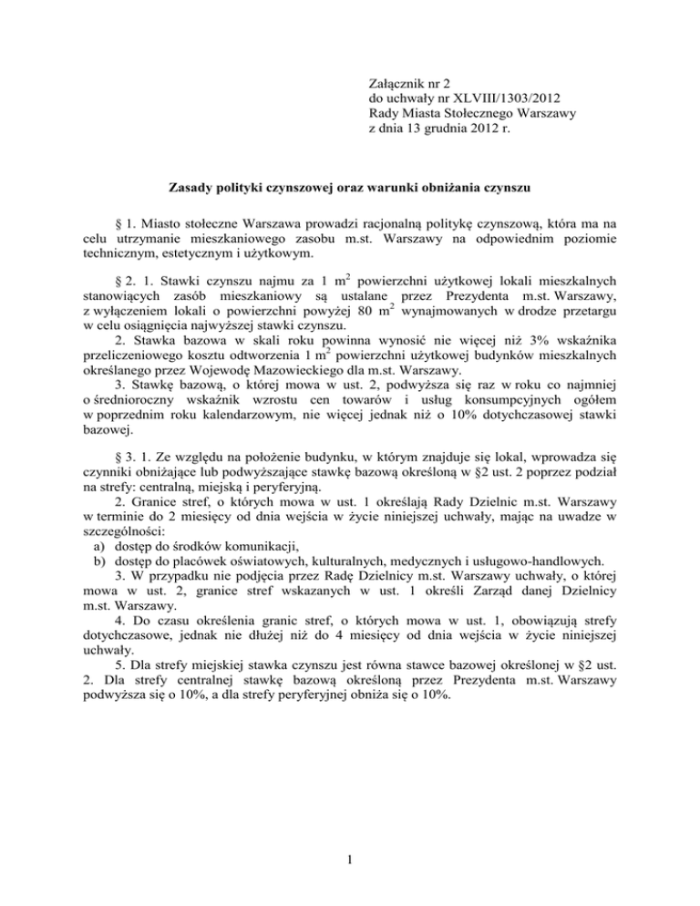 Załącznik nr 2 do uchwały nr XLVIII/1303/2012 Rady Miasta Stołecznego Warszawy z dnia 13 grudnia 2012 r. Zasady polityki czynszowej oraz warunki obniżania czynszu § 1. Miasto stołeczne Warszawa prowadzi racjonalną politykę czynszową, która ma na celu utrzymanie mieszkaniowego zasobu m.st. Warszawy na odpowiednim poziomie technicznym, estetycznym i użytkowym. § 2. 1. Stawki czynszu najmu za 1 m2 powierzchni użytkowej lokali mieszkalnych stanowiących zasób mieszkaniowy są ustalane przez Prezydenta m.st. Warszawy, z wyłączeniem lokali o powierzchni powyżej 80 m2 wynajmowanych w drodze przetargu w celu osiągnięcia najwyższej stawki czynszu. 2. Stawka bazowa w skali roku powinna wynosić nie więcej niż 3% wskaźnika przeliczeniowego kosztu odtworzenia 1 m2 powierzchni użytkowej budynków mieszkalnych określanego przez Wojewodę Mazowieckiego dla m.st. Warszawy. 3. Stawkę bazową, o której mowa w ust. 2, podwyższa się raz w roku co najmniej o średnioroczny wskaźnik wzrostu cen towarów i usług konsumpcyjnych ogółem w poprzednim roku kalendarzowym, nie więcej jednak niż o 10% dotychczasowej stawki bazowej. § 3. 1. Ze względu na położenie budynku, w którym znajduje się lokal, wprowadza się czynniki obniżające lub podwyższające stawkę bazową określoną w §2 ust. 2 poprzez podział na strefy: centralną, miejską i peryferyjną. 2. Granice stref, o których mowa w ust. 1 określają Rady Dzielnic m.st. Warszawy w terminie do 2 miesięcy od dnia wejścia w życie niniejszej uchwały, mając na uwadze w szczególności: a) dostęp do środków komunikacji, b) dostęp do placówek oświatowych, kulturalnych, medycznych i usługowo-handlowych. 3. W przypadku nie podjęcia przez Radę Dzielnicy m.st. Warszawy uchwały, o której mowa w ust. 2, granice stref wskazanych w ust. 1 określi Zarząd danej Dzielnicy m.st. Warszawy. 4. Do czasu określenia granic stref, o których mowa w ust. 1, obowiązują strefy dotychczasowe, jednak nie dłużej niż do 4 miesięcy od dnia wejścia w życie niniejszej uchwały. 5. Dla strefy miejskiej stawka czynszu jest równa stawce bazowej określonej w §2 ust. 2. Dla strefy centralnej stawkę bazową określoną przez Prezydenta m.st. Warszawy podwyższa się o 10%, a dla strefy peryferyjnej obniża się o 10%. 1 § 4. 1. Z uwagi na wartość użytkową lokalu wyznacza się następujące czynniki obniżające stawkę czynszu określoną dla danej strefy zgodnie z § 3 ust. 5 albo ustaloną na podstawie art. 30 ust. 2 ustawy z dnia 21 czerwca 2001 r. o ochronie praw lokatorów, mieszkaniowym zasobie gminy i o zmianie Kodeksu cywilnego (Dz.U. z 2005 r. Nr 31, poz. 266 z późn. zm.): a) brak instalacji zimnej wody – obniżka o 15%, b) brak kanalizacji w lokalu – obniżka o 15%, c) brak WC w lokalu – obniżka o 10%, d) brak łazienki w lokalu – obniżka o 10%, e) brak instalacji centralnego ogrzewania w lokalu – obniżka o 15%, f) brak instalacji centralnej ciepłej wody w lokalu – obniżka o 5%, g) brak pomieszczenia kuchennego albo wnęki kuchennej w lokalu – obniżka o 10%, h) pomieszczenie kuchenne albo wnęka kuchenna pozbawiona bezpośredniego oświetlenia naturalnego – obniżka o 2%, i) brak instalacji gazowej przy jednoczesnym braku odpowiednio wzmocnionej instalacji elektrycznej – obniżka o 5%, j) lokal wspólny tj. taki lokal mieszkalny, w którym poszczególne izby najmowane są przez dwóch lub więcej najemców – obniżka o 10%, przy czym za wspólne korzystanie z pomieszczeń: kuchnia, łazienka, WC – dodatkowa obniżka o 7% za każde z nich, k) brak odpowiednich urządzeń technicznych, umożliwiających dostęp do lokalu osobom niepełnosprawnym poruszającym się na wózku i zamieszkującym w tym lokalu – obniżka o 20%, l) lokal usytuowany powyżej 4 kondygnacji nadziemnej w budynku bez windy – obniżka o 5%, m) lokal położony w suterenie budynku – obniżka o 15%, n) lokal znajdujący się w budynku wymagającym napraw co najmniej dwóch głównych elementów konstrukcyjnych (fundamenty, ściany konstrukcyjne, stropy, konstrukcja schodów i dach) – obniżka o 20%, o) lokal powinien być opróżniony w związku z decyzją organu nadzoru budowlanego – do czasu tego opróżnienia – obniżka o 50%. 2. Stawka czynszu po uwzględnieniu wszystkich obniżek wskazanych w ust. 1 nie może być mniejsza niż 50% stawki właściwej dla danej strefy. 3. Czynników obniżających wartość użytkową lokali wymienionych w ust. 1 nie stosuje się do stawki czynszu za lokale o powierzchni użytkowej przekraczającej 80 m2 wynajęte w drodze przetargu. § 5. 1. Stawka czynszu za lokal socjalny jest ustalana przez Prezydenta m.st. Warszawy, przy czym stawka ta nie może przekraczać połowy najniższej stawki czynszu obowiązującego w zasobie mieszkaniowym m.st. Warszawy. 2. Czynników obniżających i podwyższających wartość użytkową lokali określonych w § 3 i § 4 nie stosuje się do stawki czynszu za lokal socjalny. § 6. 1. Stawka czynszu dla lokali znajdujących się w budynkach wybudowanych po 1995 r. o powierzchni powyżej 80m2 oddawanych w najem w drodze przetargu pisemnego ograniczonego, jest ustalana przez Prezydenta m.st. Warszawy. 2. Stawka, o której mowa w ust. 1, nie może być mniejsza niż 150% stawki właściwej dla danej strefy, jednak w skali roku nie więcej niż 4% wskaźnika przeliczeniowego kosztu odtworzenia 1 m2 powierzchni użytkowej budynków mieszkalnych określanego przez Wojewodę Mazowieckiego dla m.st. Warszawy. 2 § 7. 1. Stawka czynszu dla lokali o powierzchni użytkowej powyżej 80m2, oddanych w najem w drodze przetargu publicznego, w celu uzyskania najwyższej stawki czynszu za 1m2 obowiązuje w wysokości określonej w przetargu, z zastrzeżeniem, że stawka ta nie może być mniejsza niż 150% stawki właściwej dla danej strefy. 2. Stawkę czynszu ustaloną w sposób określony w ust. 1, podwyższa się raz w roku o średnioroczny wsk