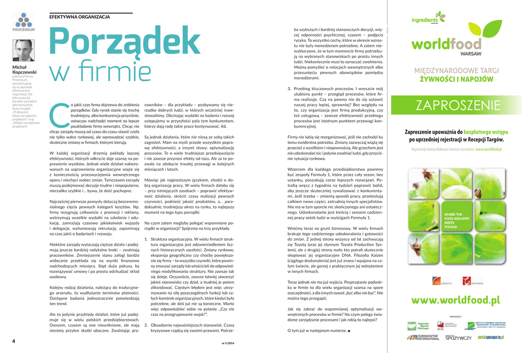 Michał Kopczewski założyciel firmy Processum, specjalizującej się w poprawie efektywności organizacji. Od kilkunastu lat doradza zarządom jako konsultant. Autor książek „Praktyczne lekcje zarządzania projektami” oraz „Alfabet zarządzania projektami”. Porządek w firmie C o jakiś czas firma dojrzewa do zrobienia porządków. Gdy rynek stanie się trochę trudniejszy, albo konkurencja przyciśnie, wówczas nadchodzi moment na lepsze poukładanie firmy wewnątrz. Chcąc nie chcąc zarządy muszą od czasu do czasu stawić czoła nie tylko walce rynkowej, ale wprowadzać szybkie, skuteczne zmiany w firmach, którymi kierują. W każdej organizacji drzemią pokłady lepszej efektywności, których odkrycie daje szansę na poprawienie wyników. Jednak wiele działań nakierowanych na usprawnienia organizacyjne wiąże się z koniecznością przezwyciężenia wewnętrznego oporu i niechęci wobec zmian. Tymczasem zarządy muszą podejmować decyzje trudne i niepopularne, nierzadko szybkie i… bywa, że dość pochopne. Najczęściej pierwsze pomysły dotyczą bezceremonialnego cięcia pewnych kategorii kosztów. Np. firmy rezygnują całkowicie z promocji i reklamy, wstrzymują wszelkie wydatki na szkolenia i edukację, zamrażają czasowo jakiekolwiek wyjazdy i delegacje, wyhamowują rekrutację, zapominają na czas jakiś o badaniach i rozwoju. Niektóre zarządy wytaczają cięższe działa i podejmują jeszcze bardziej radykalne kroki – zwalniają pracowników. Zmniejszenie stanu załogi bardzo widocznie przekłada się na wyniki finansowe nadchodzących miesięcy. Stąd duża pokusa, by rozwiązywać umowy i po prostu odchudzać skład osobowy. Kolejny rodzaj działania, należący do tradycyjnego arsenału, to wydłużanie terminów płatności. Dostępne badania jednoznacznie potwierdzają ten trend. Ale to jedynie przykłady działań, które już podejmuje się w wielu polskich przedsiębiorstwach. Owszem, czasem są one nieuniknione, ale mają niestety przykre skutki uboczne. Zwalniając pra- 4 ba szybszych i bardziej stanowczych decyzji, więcej odporności psychicznej, czasem – podjęcia ryzyka. To wszystko cechy, które w okresie wzrostu nie były menedżerom potrzebne. A zatem niewykluczone, że w tym momencie firmy potrzebują na wybranych stanowiskach po prostu innych ludzi. Niekoniecznie musi to oznaczać zwolnienia. Można pomyśleć o rotacjach wewnętrznych albo przesunięciu pewnych obowiązków pomiędzy menedżerami. cowników – dla przykładu – pozbywamy się nierzadko dobrych ludzi, w których wcześniej inwestowaliśmy. Obcinając wydatki na badania i rozwój ustępujemy w przyszłości pola tym konkurentom, którzy dają radę takie prace kontynuować. Itd. Są jednak działania, które nie niosą ze sobą takich zagrożeń. Mam na myśli przede wszystkim poprawę efektywności, a innymi słowy: optymalizację procesów. To o wiele trudniejsze przedsięwzięcie i nie zawsze przynosi efekty od razu. Ale za to pozwala na zdobycie trwałej przewagi w kolejnych miesiącach i latach. Mówiąc jak najprostszym językiem, chodzi o dobrą organizację pracy. W wielu firmach dałoby się – przy istniejących zasobach – poprawić efektywność działania, skrócić czasy realizacji pewnych czynności, podnieść jakość produktów, a… paradoksalnie, trudniejszy okres na rynku, to najlepszy moment na tego typu porządki. Na czym zatem mogłyby polegać wspomniane porządki w organizacji? Spójrzmy na trzy przykłady. 1. Struktura organizacyjna. W wielu firmach struktura organizacyjna jest odzwierciedleniem licznych historycznych zaszłości. Zmiany rynkowe, ekspansja geograficzna czy choćby powiększanie się firmy – to wszystko czynniki, które powinny zmuszać zarządy lub właścicieli do odpowiedniego modyfikowania struktury. Nie zawsze tak się dzieje. Oczywiście, zawsze łatwiej utworzyć jakieś stanowisko czy dział, a trudniej je potem zlikwidować. Częstym błędem jest więc utrzymywanie na siłę poszczególnych funkcji lub całych komórek organizacyjnych, które kiedyś były potrzebne, ale dziś już nie są konieczne. Warto więc odpowiedzieć sobie na pytanie: „Czy nie czas na przegrupowanie wojsk?”. 2. Obsadzenie najważniejszych stanowisk. Czasy kryzysowe rządzą się swoimi prawami. Potrzenr 1/2014 reklama EFEKTYWNA ORGANIZACJA 3. Przebieg kluczowych procesów. I wreszcie mój ulubiony punkt – przegląd procesów, które firma realizuje. Czy na pewno nie da się ustawić naszej pracy lepiej, sprawniej? Bez względu na to, czy organizacja jest firmą produkcyjną, czy też usługową – zawsze efektywność przebiegu procesów jest istotnym punktem przewagi konkurencyjnej. Firmy nie lubią się reorganizować, jeśli nie zachodzi ku temu ewidentna potrzeba. Zmiany zazwyczaj wiążą się przecież z wysiłkiem i niepewnością. Ale grzechem jest nie udoskonalać nic i jedynie zwalniać ludzi, gdy przyciśnie sytuacja rynkowa. Wzorcem dla każdego przedsiębiorstwa powinny być zespoły Formuły 1, które przez cały sezon, bez ustanku, poszukują coraz lepszych rozwiązań. Potrafią wręcz z tygodnia na tydzień poprawić bolid, aby jeszcze skuteczniej rywalizować z konkurentami. Jeśli trzeba – zmienią sposób pracy, przetestują całkiem nowe części, zatrudnią innych specjalistów. Nie ma w tym sporcie nic skończonego ani ostatecznego. Udoskonalanie jest treścią i sensem codziennej pracy setek ludzi w wyścigach Formuły 1. Wróćmy teraz na grunt biznesowy. W wielu firmach brakuje tego codziennego udoskonalania i gotowości do zmian. Z jednej strony wszyscy od lat zachwycają się Toyotą (oraz jej słynnym Toyota Production System), ale z drugiej strony mało kto potrafi skutecznie skopiować jej organizacyjne DNA. Filozofia Kaizen (ciągłego doskonalenia) jest już znana i wpajana na całym świecie, ale gorzej z praktycznym jej wdrożeniem w innych firmach. Teraz jednak nie ma już wyjścia. Po