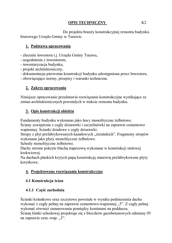 OPIS TECHNICZNY K2 Do projektu branży konstrukcyjnej remontu budynku biurowego Urzędu Gminy w Turawie. 1. Podstawa opracowania - zlecenie inwestora t.j. Urzędu Gminy Turawa, - uzgodnienia z inwestorem, - inwentaryzacja budynku, - projekt architektoniczny, - dokumentacja pierwotna konstrukcji budynku udostępniona przez Inwestora, - obowiązujące normy, przepisy i warunki techniczne. 2. Zakres opracowania Niniejsze opracowanie przedstawia rozwiązania konstrukcyjne wynikające ze zmian architektonicznych powstałych w trakcie remontu budynku. 3. Opis konstrukcji obiektu Fundamenty budynku wykonano jako ławy monolityczne żelbetowe. Ściany zewnętrzne z cegły dziurawki i szczelinówki na zaprawie cementowo wapiennej. Ścianki działowe z cegły dziurawki. Stropy z płyt prefabrykowanych kanałowych „żerańskich”. Fragmenty stropów wykonane jako płyty monolityczne żelbetowe. Schody monolityczne żelbetowe. Dachy strome pokryte blachą trapezową wykonane w konstrukcji stalowej krokwiowej. Na dachach płaskich krytych papą konstrukcję stanowią prefabrykowane płyty korytkowe. 4. Projektowane rozwiązania konstrukcyjne 4.1 Konstrukcja ścian 4.1.1 Część zachodnia Ścianki kolankowe oraz szczytowe powstałe w wyniku podniesienia dachu wykonać z cegły pełnej na zaprawie cementowo-wapiennej „5”. Z cegły pełnej wykonać również zamurowania pomiędzy kominami na poddaszu. Ścianę klatki schodowej projektuje się z bloczków gazobetonowych odmiany 05 na zaprawie cem.-wap. „3”. 2. K3 4.1.2 Część północno-wschodnia Zewnętrzną klatkę schodową omurować cegłą pełną na zaprawie cem.-wap. „3”. Ściany osłonowe parteru pomieszczenia sali ślubów i pokoju biurowego (po demontażu ścian drewnianych) wykonać z bloczków gazobetonowych odmiany 500 za zaprawie cem.-wap. „3”. Na piętrze, po rozbiórce zewnętrznej ściany sali konferencyjnej do wysokości parapetu wykonać ściankę grub. 12 cm z bloczków gazobetonowych „500” na zaprawie cem.-wap. „3”. Nad oknami zamontować rygle wykonane z rur stalowych kwadratowych mocowanych poprzez spawanie do istniejących konstrukcyjnych słupów stalowych – dokładny wymiar rygli ustalić po demontażu istniejącej ściany. Na ryglach, do stropu wykonać ściankę jak poniżej okien. Na parterze, nad projektowanym otworem ściany nośnej w sali ślubów wykonać podciąg stalowy ze stali St3SX (oznaczony jako B-1). W remontowanym sanitariacie na parterze (w.c. dla osób niepełnosprawnych), ściankę pomiędzy w.c. i przedsionkiem wykonać z cegły dziurawki lub bloczków gazobetonowych na zaprawie cementowej „8”. Ściankę łączyć z ścianami istniejącymi na strzępia i zbroić bednarką co 3-cią warstwę. 4.1.3 Kominy Podniesienie kominów wykonać z cegły pełnej na zaprawie cem.-wap. „5”. Na podniesionych kominach ułożyć czapy kominowe zdemontowane przed rozbiórką dachu. 4.2 Schody Na adaptowane poddasze zachodniego skrzydła budynku projektuje się żelbetowe monolityczne schody. Schody wykonać jako płytowe, o grubości płyty 12 cm, z betonu B20 MPa zbrojonego stalą 34GS. Biegi schodowe oparte będą na projektowanych belkach stalowych (stal St3SX) kotwionych w istniejących ścianach podłużnych klatki schodowej. 4.3 Zadaszenie klatki schodowej Nad istniejącą klatką schodową w północnej części budynku projektuje się zadaszenie z blachy trapezowej T55x188, w spadku 6%. Blachę montować do stalowych płatwi. Płatwie oparte będą na stalowych belkach opartych na murach zewnętrznych. Belki nośne kotwić do ścian. 3. K4 Wszystkie elementy stalowe wykonane będą ze stali St3SX i łączone z sobą poprzez spawanie oraz na śruby. 4.4 Dach nad częścią zachodnią Projektowane zwiększenie wysokości strychu powoduje podniesienia konstrukcji dachu. W tym celu należy w pierwszej kolejności rozebrać pokrycie dachu z blachy trapezowej, zdemontować rynny, obróbki blacharskie itp. Demontaż ramowej konstrukcji stalowej dachu rozpocząć należy od rozebrania stalowych łat i odspojenia krokwi od murów zewnętrznych. Następnie krokwie wraz z kleszczami przenieść na teren. Odsłonięty strych przykryć folią. Po nadmurowaniu ścian podłużnych należy wykonać na nich wieniec żelbetowy zbrojony prętami ze stali żebrowanej. Stalową konstrukcję, uprzednio zdemontowaną, kotwić do nowego wieńca oraz do betonowych poduszek wykonanych na istniejących wewnętrznych ścianach podłużnych. Wszystkie elementy stalowe (istniejące i projektowane) należy oczyścić i zabezpieczyć antykorozyjnie. 4.5 Nadproża Nad nowymi otworami okiennymi drzwiowymi, dotyczy to drzwi, okien i luksferów zewnętrznej klatki schodowej, elewacji części północnej i północno wschodniej, szybu oraz przedsionka dźwigu ułożyć nadproża prefabrykowane typu L-19. Nad pozostałymi otworami, wykutymi w ścianach istniejących projektuje się montaż nadproży ze stali walcowanej St3SX o profilu dwuteowym. 5. Prace antykorozyjne Prace antykorozyjne nowych elementów stalowych: kontrłaty wiązarów dachowych części zachodniej, zadaszenia zewnętrznej klatki schodowej oraz balustrad należy wykonać na warsztacie oraz po zamontowaniu konstrukcji. W warsztacie należy wykonać gruntowanie, natomiast na montażu gruntowanie uzupełniające oraz malowanie właściwe. Przed przystąpieniem do malowania gruntującego, na warsztacie należy powierzchnie przygotować t.j.: - usunąć nierówności - oczyścić powierzchnie poprzez wykonanie: czyszczenie przez szczotkowanie 4. K5 mechaniczne do 2-go stopnia czystości (stan wyjściowy powierzchni B) - ostre krawędzie zeszlifować Malowanie elementów stalowych przeprowadzać zgodnie z PN-EN ISO 129447:2001 (malowanie przeciwkorozyjne). Zaleca się wykonać gruntowanie nie później niż 6 godzin po oczyszczeniu elementów. Elementy oczyszczone do chwili rozpoczęcia malowania należy zabezpieczyć przed wpływami atmosferycznymi. G