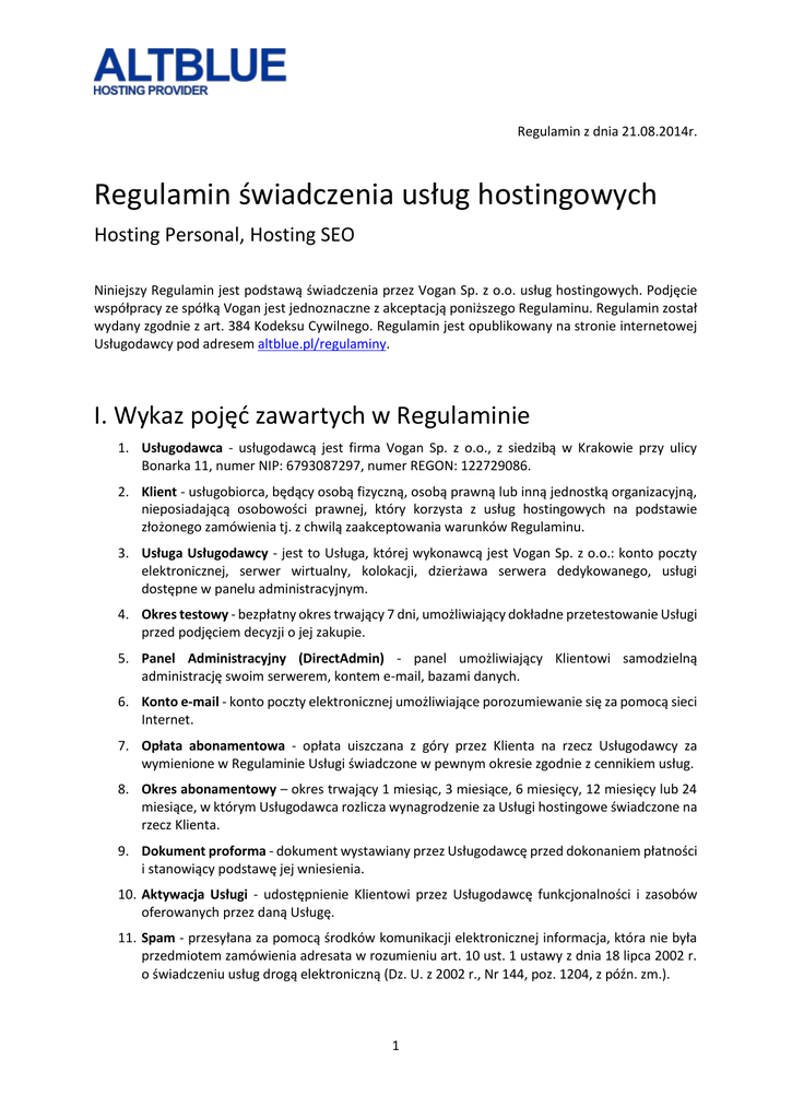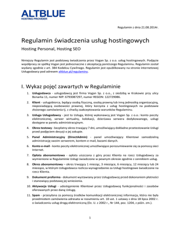Regulamin z dnia 21.08.2014r. Regulamin świadczenia usług hostingowych Hosting Personal, Hosting SEO Niniejszy Regulamin jest podstawą świadczenia przez Vogan Sp. z o.o. usług hostingowych. Podjęcie współpracy ze spółką Vogan jest jednoznaczne z akceptacją poniższego Regulaminu. Regulamin został wydany zgodnie z art. 384 Kodeksu Cywilnego. Regulamin jest opublikowany na stronie internetowej Usługodawcy pod adresem altblue.pl/regulaminy. I. Wykaz pojęć zawartych w Regulaminie 1. Usługodawca - usługodawcą jest firma Vogan Sp. z o.o., z siedzibą w Krakowie przy ulicy Bonarka 11, numer NIP: 6793087297, numer REGON: 122729086. 2. Klient - usługobiorca, będący osobą fizyczną, osobą prawną lub inną jednostką organizacyjną, nieposiadającą osobowości prawnej, który korzysta z usług hostingowych na podstawie złożonego zamówienia tj. z chwilą zaakceptowania warunków Regulaminu. 3. Usługa Usługodawcy - jest to Usługa, której wykonawcą jest Vogan Sp. z o.o.: konto poczty elektronicznej, serwer wirtualny, kolokacji, dzierżawa serwera dedykowanego, usługi dostępne w panelu administracyjnym. 4. Okres testowy - bezpłatny okres trwający 7 dni, umożliwiający dokładne przetestowanie Usługi przed podjęciem decyzji o jej zakupie. 5. Panel Administracyjny (DirectAdmin) - panel umożliwiający Klientowi samodzielną administrację swoim serwerem, kontem e-mail, bazami danych. 6. Konto e-mail - konto poczty elektronicznej umożliwiające porozumiewanie się za pomocą sieci Internet. 7. Opłata abonamentowa - opłata uiszczana z góry przez Klienta na rzecz Usługodawcy za wymienione w Regulaminie Usługi świadczone w pewnym okresie zgodnie z cennikiem usług. 8. Okres abonamentowy – okres trwający 1 miesiąc, 3 miesiące, 6 miesięcy, 12 miesięcy lub 24 miesiące, w którym Usługodawca rozlicza wynagrodzenie za Usługi hostingowe świadczone na rzecz Klienta. 9. Dokument proforma - dokument wystawiany przez Usługodawcę przed dokonaniem płatności i stanowiący podstawę jej wniesienia. 10. Aktywacja Usługi - udostępnienie Klientowi przez Usługodawcę funkcjonalności i zasobów oferowanych przez daną Usługę. 11. Spam - przesyłana za pomocą środków komunikacji elektronicznej informacja, która nie była przedmiotem zamówienia adresata w rozumieniu art. 10 ust. 1 ustawy z dnia 18 lipca 2002 r. o świadczeniu usług drogą elektroniczną (Dz. U. z 2002 r., Nr 144, poz. 1204, z późn. zm.). 1 II. Postanowienia ogólne 1. Postanowienia ogólne określają prawa i obowiązki stron Umowy. 2. Regulamin obowiązuje Klienta bez względu na formę, w jakiej została zawarta Umowa. 3. Podjęcie współpracy z Vogan Sp. z o.o. jest jednoznaczne z akceptacją dla Regulaminu, jako integralnej części łączącej strony Umowy. 4. Usługodawca nie ingeruje w sposób wykorzystania udostępnionych Usług pod warunkiem, że zachowania Klienta nie będą sprzeczne z treścią Regulaminu, niezgodne z polskim prawem, zasadami netykiety, jak również nie będzie to szkodziło renomie i dobremu imieniu Usługodawcy. 5. Data aktywacji Usługi w firmie Vogan Sp. z o.o. jest jednocześnie datą zawarcia Umowy między Usługodawcą a Klientem 6. Usługodawca ma prawo zmiany treści Regulaminu w wyniku zmiany obowiązujących przepisów oraz w wyniku wprowadzenia nowych Usług. Usługodawca jest zobowiązany do poinformowania Klienta o wprowadzonych zmianach z 30-dniowym wyprzedzeniem. W przypadku braku wypowiedzenia umowy przez Usługobiorcę w ciągu 14 dni od doręczenia zawiadomienia, uznaje się, że akceptuje on postanowienia nowego Regulaminu, co skutkuje automatycznym przedłużeniem umowy. III. Zamówienie Usługi 1. Zamówienie Usługi może zostać złożone w każdej formie, która została wskazana przez Usługodawcę w materiałach informacyjnych lub w ofercie Usługodawcy. W szczególności zamówienie może zostać złożone w formie pisemnej, telefonicznie, poprzez live-chat oraz za pośrednictwem: faksu, poczty elektronicznej lub poprzez system zamówień dostępny w serwisie internetowym pod adresem altblue.pl. 2. Przy składaniu zamówienia Klient zobowiązany jest do podania prawdziwych danych personalnych i kontaktowych (imię, nazwisko, adres, numer telefonu, adres e-mail), a także wszystkich niezbędnych danych do wystawienia faktury. Podanie nieprawdziwych danych jest jednoznaczne z naruszeniem Regulaminu, co upoważnia Usługodawcę do zaprzestania świadczenia Usług na rzecz Klienta. W takiej sytuacji Usługodawca nie ma obowiązku zwracać Klientowi uiszczonej opłaty abonamentowej za okres, w którym Usługi nie są wykorzystywane. 3. Usługodawca zastrzega sobie prawo do zablokowania dostępu do Usługi w trakcie okresu testowego, o ile Usługa została aktywowana po raz kolejny po usunięciu wynikającym z braku wniesienia opłaty abonamentowej lub też zaprzestania świadczenia Usługi wskutek naruszenia postanowień Regulaminu i rozwiązania Umowy, bądź też Usługa wykorzystuje zasoby Usługodawcy w sposób przekraczający znamiona testów i prób. 4. Jeżeli Klient przekroczy 7-dniowy okres testowy i nie dokona wpłaty, jego Usługa zostanie zablokowana na kolejne 7 dni. Otrzymanie przez Usługodawcę w tym okresie potwierdzenia wpłaty z banku Usługodawcy spowoduje odblokowanie dostępu do Usługi w ciągu 24 godzin. Po tym terminie, jeżeli nadal Usługodawca nie odnotuje wpłaty, nastąpi usunięcie aktywowanej Usługi, w tym wszystkich plików zamieszczonych na serwerze. 2 5. Usługodawca wystawia dokument proforma 7 dni przed zakończeniem opłaconego okresu abonamentowego Usługi. Jeżeli Klient przekroczy okres abonamentowy i nie dokona wpłaty, jego Usługa zostanie zablokowana na kolejne 7 dni. Otrzymanie przez Usługodawcę w tym okresie potwierdzenia wpłaty z banku Usługodawcy spowoduje odblokowanie dostępu do Usług w ciągu 24 godzin. Po tym terminie, jeżeli nadal nie zostanie odnotowane potwierdzenie wpła