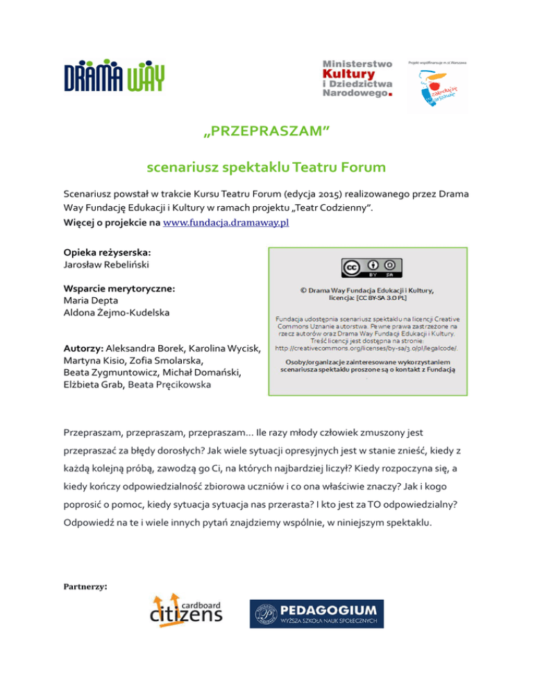 „PRZEPRASZAM” scenariusz spektaklu Teatru Forum Scenariusz powstał w trakcie Kursu Teatru Forum (edycja 2015) realizowanego przez Drama Way Fundację Edukacji i Kultury w ramach projektu „Teatr Codzienny”. Więcej o projekcie na www.fundacja.dramaway.pl Opieka reżyserska: Jarosław Rebeliński Wsparcie merytoryczne: Maria Depta Aldona Żejmo-Kudelska Autorzy: Aleksandra Borek, Karolina Wycisk, Martyna Kisio, Zofia Smolarska, Beata Zygmuntowicz, Michał Domański, Elżbieta Grab, Beata Pręcikowska Przepraszam, przepraszam, przepraszam... Ile razy młody człowiek zmuszony jest przepraszać za błędy dorosłych? Jak wiele sytuacji opresyjnych jest w stanie znieść, kiedy z każdą kolejną próbą, zawodzą go Ci, na których najbardziej liczył? Kiedy rozpoczyna się, a kiedy kończy odpowiedzialność zbiorowa uczniów i co ona właściwie znaczy? Jak i kogo poprosić o pomoc, kiedy sytuacja sytuacja nas przerasta? I kto jest za TO odpowiedzialny? Odpowiedź na te i wiele innych pytań znajdziemy wspólnie, w niniejszym spektaklu. Partnerzy: Wystepują: Karolina- uczennica renomowanego warszawskiego liceum, której młodzieńcza, idealistyczna wizja świata nie pozwala siedzieć cicho, w sytuacja, w ktorej innym uczniom dzieje się krzywda. Michalina- nielubiącą się wychylać uczennica warszawskiego, renomowanego liceum, w którym pechowy los sprawia, że staje się ofiarą prześladowań pani Malinowskiej. Koleżanki - uczennice renomowanego warszawskiego liceum, odznaczające się przeciętnymi ocenami, którym bardzo zależy, aby w sytuacji konfliktowej pozostać neutralnymi za wszelką cenę. Tomek - uczeń renomowanego warszawskiego liceum, chłopak Karoliny, który pomimo tego, że bardzo ją kocha nie potrafi stanąć w jej obrobienie. Wychowawca klasy- jawna konformistka, pomimo swojej szczerej otwartosci na drugiego człowieka. Stara się rozwiązać polubownie każdy konflikt, jeśli tylko konsekwecje nie dotkną jej osoby. Matka- klasyczny typ społecznej aktywistki, przejmującej się wszystkimi problemami świata tak bardzo, że nie starcza jej już czasu na rozwiązanie tych, znajdujących się w jej własnym domu. W szkole: Karolina siada przy ławce, wyjmuje książki, w tym samym czasie na scenę wchodzi najpierw Michalina z książką od chemii, po niej kolejne osoby z klasy. Michalina wita się z Karoliną: Michalina: Cześć Karolina Karolina: Cześć Michalina Wszyscy uczą się chemii. Karolina siedzi z Tomkiem z boku, Michalina mdleje. Koleżanka nr 1 (podbiega do Michaliny jako pierwsza): Tomek! Tomek: Miśka, Miśka żyjesz? Karolina: Podnieście ją! Koleżanka nr 2 (wachlując z góry, z miną: a co mnie to obchodzi): Przecież to już nie pierwszy raz, ona zawsze mdleje. Karolina: Macie wodę? Kto ma wodę? Tomek: Podnieśmy ją, pomożmy jej! Karolina: Weź głowę do dołu. Tak, wiem, że to nie jest piewszy raz. Koleżanka nr 2: Ona tak co tydzień mdleje. Karolina: Uspokój się, postaraj się być spokojna. Tomek: Zostaw te książki! (Zabiera książki Michalinie). Michalina: Ale ona mnie zapyta! Na pewno muszę się uczyć. (Powtarza nazwy kwasów) Karolina: Na pewno Cię nie zapyta, przecież na ostatniej lekcji była klasówka! I dzisiaj są wyniki testu. Nie martw się! Michalina: Ona zawsze mnie pyta. Karolina: Będą wyniki testu. Nie dramatyzuj. Nie zapyta cię. Zostaw te książki! Tomek: Ile będziesz się uczyła? Słuchajcie przez tę chemię będziemy mdleć co chwila! Musimy coś z tym zrobić. Karolina: Tak, tak zgadzam się. Nie możemy tego tak zostawić. Musimy coś z tym zrobić. Koleżanka nr 1: Jadłaś śniadanie? Michalina: Nie no, uczyłam się przez cały czas... Kolezanka nr 1: Jak sie czujesz? Możesz pojdziesz do pielegniarki? Tomek: Tak musisz iść do pielęgniarki, a my musimy coś z tym zrobić! Trzeba z nią pogadać! Karolina: No dobra zróbmy to! Ok! A Ty Michalina idź do pielęgniarki, ja Cię usprawiedliwię Koleżanka nr 1 wyprowadza Michalinę do pielęgniarki. Tomek: Wiesz, co ja mam pomysł, bo jesteś gospodynią klasy.... Karolina: Jaki pomysł? Koleżanka 1: Ty potrafisz wszystko załatwić, zawsze Ci się udaje, ona Cię lubi. Koleżanka 2: No weź jej powiedz... Tomek: Damy radę, powiedź jej to. Jesteśmy z Tobą. Pogadaj z nią. Jesteśmy w tym razem! Tomek: Idzie, idzie, idzie!!!!! Wszyscy rozbiegają się do ławek. Malinowska: Dzień dobry klaso! Klasa: Dzień dobry Pani Profesor. Malinowska: Wiecie, że ostatni test poszedł Wam fatalnie. Zdajecie sobie z tego sprawę, prawda? Koniec roku za pasem, a ja tu nie widzę możliwości, żeby ktokolwiek z tej klasy zaliczył przedmiot. Taaaak, (pukając do drzwi, wchodzi Michalina) Michalina: Przepraszam.... Malinowska: A Ty co?! Dzwoneczka nie słyszałaś?! Michalina: Przepraszam... Malinowska: Co?! Głucha jesteś?! Karolina: Pani profesor, ja chciałam usprawiedliwić koleżankę, ponieważ.... Malinowska: Przepraszam Cię bardzo, a co ona języka w gębie nie ma? Karolina siada. Malinowska: No! Tak... Karolina: Chciałabym usprawiedliwić, koleżanka była u.... Malinowska: Siadaj! Karolina: ... była u pielęgniarki ponieważ zemdlała przed zajęciami Malinowska: Może nie odzywaj się już wiecej, dobrze? Harmider w klasie. Wszysycy próbują przekonać Michalinę, by wstała i powiedziała, że ostnia klasówka była wbrew regulaminowi. Malinowska: Co tu się dzieje? Karolina: Pani Profesor, chciałabym w imieniu całej klasy, jako przewodnicząca poprosić, żeby oceny z tego sprawdzianu nie zostały wpisane do dziennika, ponieważ mamy regulamin, który zabrania sprawdzianów z całego semestru.... Malinowska: Ale co Ty mi sugerujesz? Co takiego? Regulamin? Karolina: Nie był zapowiedziany ten sprawdzian, więc jakby.... Malinowska: Przepraszam Cię bardzo, ja nie znam regulaminu?! To może ja w ogóle nie wiem jak uczyć, co? Siadaj! Malinowska (dalej): Dobrze moi Państwo, wracając do Waszego genialnego testu... No to ja tu napr