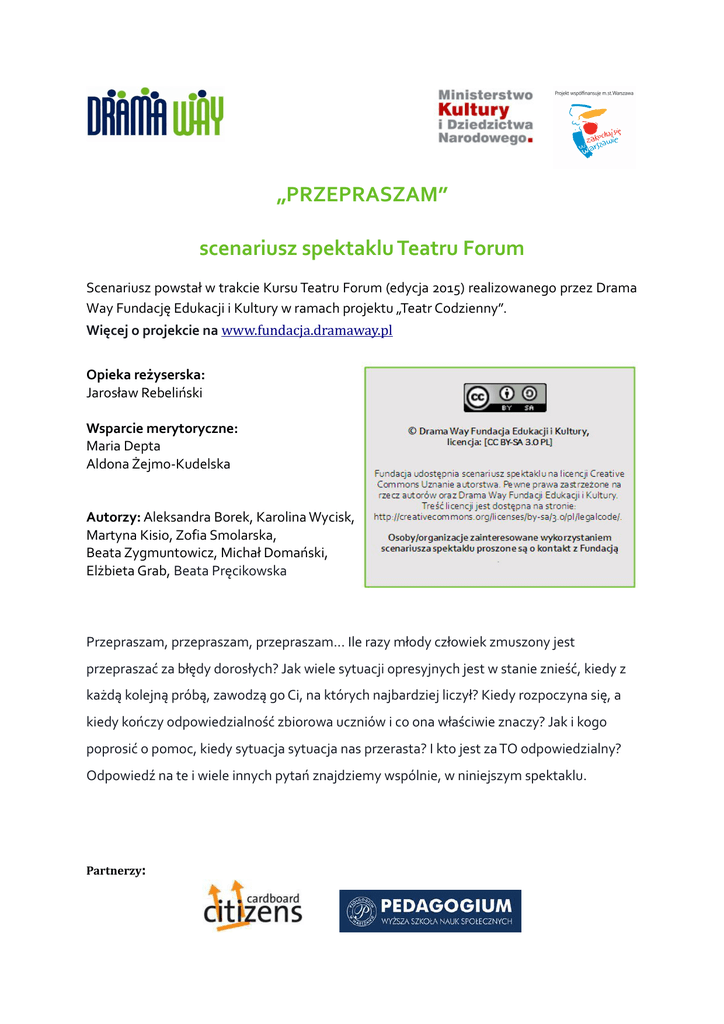 „PRZEPRASZAM” scenariusz spektaklu Teatru Forum