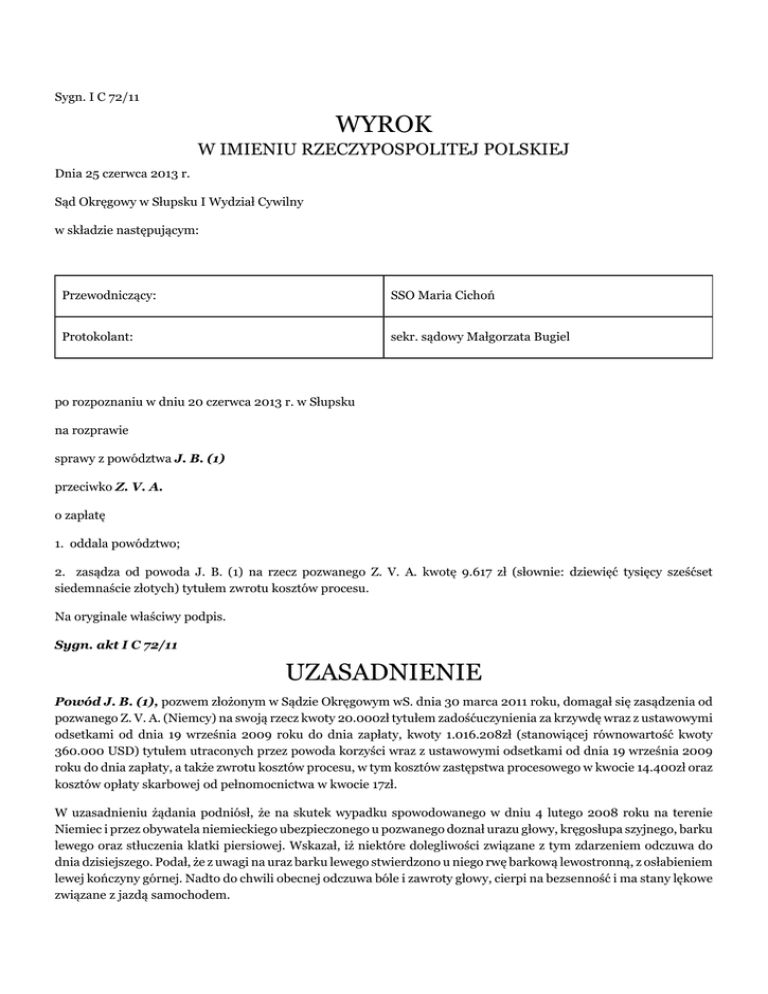 Sygn. I C 72/11 WYROK W IMIENIU RZECZYPOSPOLITEJ POLSKIEJ Dnia 25 czerwca 2013 r. Sąd Okręgowy w Słupsku I Wydział Cywilny w składzie następującym: Przewodniczący: SSO Maria Cichoń Protokolant: sekr. sądowy Małgorzata Bugiel po rozpoznaniu w dniu 20 czerwca 2013 r. w Słupsku na rozprawie sprawy z powództwa J. B. (1) przeciwko Z. V. A. o zapłatę 1. oddala powództwo; 2. zasądza od powoda J. B. (1) na rzecz pozwanego Z. V. A. kwotę 9.617 zł (słownie: dziewięć tysięcy sześćset siedemnaście złotych) tytułem zwrotu kosztów procesu. Na oryginale właściwy podpis. Sygn. akt I C 72/11 UZASADNIENIE Powód J. B. (1), pozwem złożonym w Sądzie Okręgowym wS. dnia 30 marca 2011 roku, domagał się zasądzenia od pozwanego Z. V. A. (Niemcy) na swoją rzecz kwoty 20.000zł tytułem zadośćuczynienia za krzywdę wraz z ustawowymi odsetkami od dnia 19 września 2009 roku do dnia zapłaty, kwoty 1.016.208zł (stanowiącej równowartość kwoty 360.000 USD) tytułem utraconych przez powoda korzyści wraz z ustawowymi odsetkami od dnia 19 września 2009 roku do dnia zapłaty, a także zwrotu kosztów procesu, w tym kosztów zastępstwa procesowego w kwocie 14.400zł oraz kosztów opłaty skarbowej od pełnomocnictwa w kwocie 17zł. W uzasadnieniu żądania podniósł, że na skutek wypadku spowodowanego w dniu 4 lutego 2008 roku na terenie Niemiec i przez obywatela niemieckiego ubezpieczonego u pozwanego doznał urazu głowy, kręgosłupa szyjnego, barku lewego oraz stłuczenia klatki piersiowej. Wskazał, iż niektóre dolegliwości związane z tym zdarzeniem odczuwa do dnia dzisiejszego. Podał, że z uwagi na uraz barku lewego stwierdzono u niego rwę barkową lewostronną, z osłabieniem lewej kończyny górnej. Nadto do chwili obecnej odczuwa bóle i zawroty głowy, cierpi na bezsenność i ma stany lękowe związane z jazdą samochodem. Powód podniósł również, że przed wypadkiem tj. w dniu 10 stycznia 2008 roku podpisał z firmą (...)’ S (...) spółką z o.o. z siedzibą w G. umowę zlecenia poprowadzenia prac logistycznych w kopalni miedzi w Laosie. Podał, że umowa została zawarta na okres 24 miesięcy tj. od dnia 1 marca 2008 roku do dnia 28 lutego 2010 roku i z tytułu wykonanej pracy miał otrzymać wynagrodzenie w wysokości 360.000 USD. Podniósł, że w wyniku doznanych obrażeń związanych z wypadkiem nie mógł rozpocząć wykonania umowy zlecenia w zaplanowanym terminie i zleceniodawca z uwagi na jego stan zdrowia nie zgodził się na wysłanie go w charakterze dyrektora odpowiedzialnego za organizacje pracy do kopalni w Laosie. Pozwany Z. V. A. wniósł o oddalenie powództwa w całości oraz o zasądzenie kosztów procesu, w tym kosztów zastępstwa procesowego w wysokości trzykrotności stawki minimalnej oraz kosztów opłaty od pełnomocnictwa w kwocie 34zł. Na rozprawie w dniu 20 czerwca 2013 roku pełnomocnik pozwanego wniósł o zasądzenie od powoda kosztów zastępstwa procesowego w wysokości co najmniej podwójnej stawki minimalnej oraz zwrotu kosztów dojazdu pełnomocnika strony pozwanej na każdą rozprawę, licząc za jedno stawiennictwo kwotę 400zł (k.269v, 00:12:52 eprotokołu k.251). W uzasadnieniu swojego stanowiska pozwany podniósł, że brak jest podstaw do przyjęcia, że powód doznał uszczerbku na zdrowiu, za który mógłby domagać się od strony pozwanej stosownego odszkodowania. Wskazał, że bezpośrednio po wypadku nie odczuwał on żadnych dolegliwości i nie korzystał z pomocy medycznej, a już następnego dnia udał się do Norwegii w celu kontynowania urlopu. Podkreślił, że powód będąc już w Norwegii również nie korzystał z pomocy lekarza. Pozwany podniósł, że powód w czasie od wypadku do pierwszego badania lekarskiego w Polsce mógł ulec innym wypadkom lub brać udział w innych zdarzeniach, które mogły mieć wpływ na jego stan zdrowia. Wskazał, że brak pomocy medycznej po wypadku, podróż samochodem z Niemiec do Norwegii i następnie z Norwegii do Polski mogły pogłębić urazy jakich rzekomo doznał on podczas wypadku. Ponadto pozwany zakwestionował zasadność żądania powoda zapłaty na jego rzecz kwoty 1.016.208zł tytułem rzekomo utraconego zarobku. Wskazał, że powód nie wykazał, że gdyby do wypadku nie doszło, to jego majątek zwiększyłby się o wyżej wskazaną kwotę. Podniósł, że brak jest adekwatnego związku przyczynowego pomiędzy wypadkiem, a utratą przez powoda wyżej wskazanego zarobku, jak również brak jest dowodów na wysokość utraconych korzyści. Na rozprawie w dniu 6 grudnia 2011 roku pełnomocnik pozwanego oświadczył, że strona pozwana skłonna byłaby podpisać z powodem ugodę, ale jedynie co do zapłaty powodowi kwoty 2.000 euro, gdyż o takiej kwocie była mowa na wstępnym etapie likwidacji przedmiotowej szkody (k.141). Powód jednak nie wyraził na to zgody (k.141). Sąd ustalił następujący stan faktyczny: W styczniu 2008 roku powód wraz ze swoim znajomym J. B. (2) wyjechał do Norwegii. J. B. (2) będąc zatrudnionym w firmie norweskiej otrzymał zlecenie wyjazdu do Słowenii po części do łodzi motorowych. Powód zgodził się pojechać ze znajomym. Do Słowenii pojechali przez Danię, Niemcy i Austrię. Dowód: informacyjne wysłuchanie powoda k.141v-144. W dniu 4 lutego 2008 roku około godz. 23:44 wracając ze Słowenii na terenie Niemiec na autostradzie (...) doszło do wypadku, w którym kierujący pojazdem marki A. (...) o nr rej. (...) 762 obywatel niemiecki J. W. prowadząc pojazd w stanie nietrzeźwości najechał na tył samochodu marki T. o nr rej. (...), którym kierował J. B. (2). Powód jechał jako pasażer w samochodzie, którym kierował J. B. (2). Dowód: informacyjne wysłuchanie powoda k.141v-144, zdjęcia uszkodzonych pojazdów k.110-111. Sprawca wypadku był ubezpieczony od odpowiedzialności cywilnej za szkody komunikacyjne w pozwanym Z. V. A. z siedzibą w B.. (bezsporne) Z miejsca zdarzenia Policja o