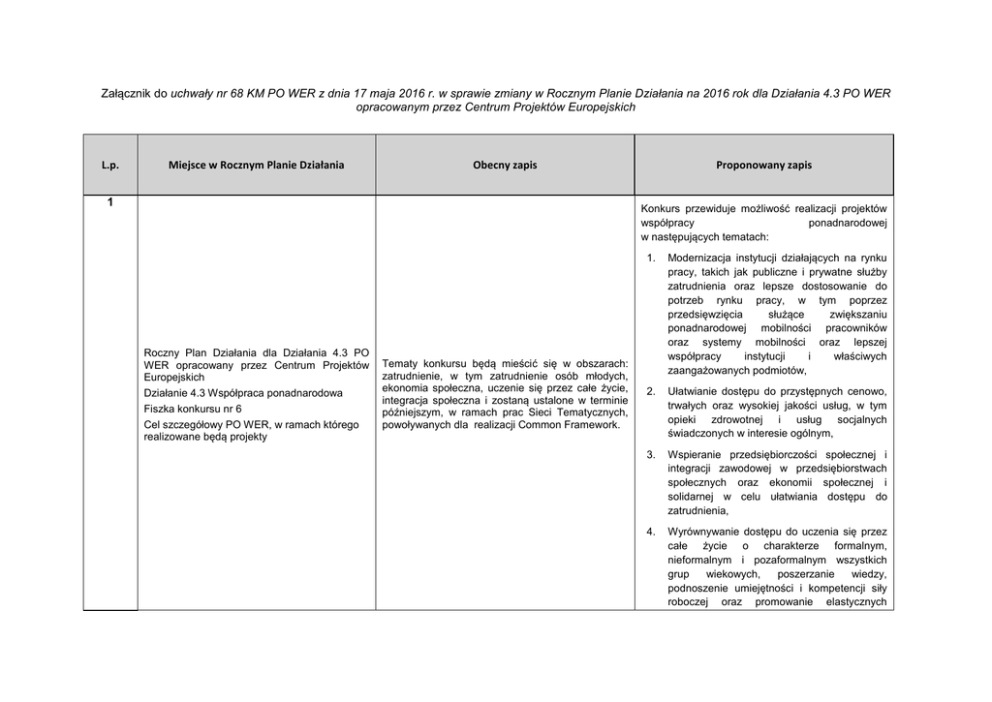 Załącznik do uchwały nr 68 KM PO WER z dnia 17 maja 2016 r. w sprawie zmiany w Rocznym Planie Działania na 2016 rok dla Działania 4.3 PO WER opracowanym przez Centrum Projektów Europejskich L.p. Miejsce w Rocznym Planie Działania Obecny zapis 1 Proponowany zapis Konkurs przewiduje możliwość realizacji projektów współpracy ponadnarodowej w następujących tematach: Roczny Plan Działania dla Działania 4.3 PO WER opracowany przez Centrum Projektów Europejskich Działanie 4.3 Współpraca ponadnarodowa Fiszka konkursu nr 6 Cel szczegółowy PO WER, w ramach którego realizowane będą projekty Tematy konkursu będą mieścić się w obszarach: zatrudnienie, w tym zatrudnienie osób młodych, ekonomia społeczna, uczenie się przez całe życie, integracja społeczna i zostaną ustalone w terminie późniejszym, w ramach prac Sieci Tematycznych, powoływanych dla realizacji Common Framework. 1. Modernizacja instytucji działających na rynku pracy, takich jak publiczne i prywatne służby zatrudnienia oraz lepsze dostosowanie do potrzeb rynku pracy, w tym poprzez przedsięwzięcia służące zwiększaniu ponadnarodowej mobilności pracowników oraz systemy mobilności oraz lepszej współpracy instytucji i właściwych zaangażowanych podmiotów, 2. Ułatwianie dostępu do przystępnych cenowo, trwałych oraz wysokiej jakości usług, w tym opieki zdrowotnej i usług socjalnych świadczonych w interesie ogólnym, 3. Wspieranie przedsiębiorczości społecznej i integracji zawodowej w przedsiębiorstwach społecznych oraz ekonomii społecznej i solidarnej w celu ułatwiania dostępu do zatrudnienia, 4. Wyrównywanie dostępu do uczenia się przez całe życie o charakterze formalnym, nieformalnym i pozaformalnym wszystkich grup wiekowych, poszerzanie wiedzy, podnoszenie umiejętności i kompetencji siły roboczej oraz promowanie elastycznych ścieżek kształcenia, w tym poprzez doradztwo zawodowe i potwierdzanie nabytych kompetencji, 2. 5. Lepsze dostosowanie systemów kształcenia i szkolenia do potrzeb rynku pracy, ułatwianie przechodzenia z etapu kształcenia do etapu zatrudnienia oraz wzmacnianie systemów kształcenia i szkolenia zawodowego i ich jakości, w tym poprzez mechanizmy prognozowania umiejętności, dostosowania programów nauczania oraz tworzenia i rozwoju systemów uczenia się poprzez praktyczną naukę zawodu realizowaną w ścisłej współpracy z pracodawcami, 6. Inwestycje w zdolności instytucjonalne i w sprawność administracji publicznej oraz efektywność usług publicznych na szczeblu krajowym, regionalnym i lokalnym w celu przeprowadzenia reform, z uwzględnieniem lepszego stanowienia prawa i dobrego rządzenia. Dodano treść kryterium oraz uzasadnienie: Projekt jest realizowany w ramach jednego z następujących tematów: Roczny Plan Działania dla Działania 4.3 PO WER opracowany przez Centrum Projektów Europejskich Działanie 4.3 Współpraca ponadnarodowa Fiszka konkursu nr 6 Kryterium dostępu nr 2 1. Modernizacja instytucji działających na rynku pracy, takich jak publiczne i prywatne służby zatrudnienia oraz lepsze dostosowanie do potrzeb rynku pracy, w tym poprzez przedsięwzięcia służące zwiększaniu ponadnarodowej mobilności pracowników oraz systemy mobilności oraz lepszej współpracy instytucji i właściwych zaangażowanych podmiotów, 2. Ułatwianie dostępu do przystępnych cenowo, Brak zapisów. Wprowadzono nowe kryterium. trwałych oraz wysokiej jakości usług, w tym opieki zdrowotnej i usług socjalnych świadczonych w interesie ogólnym, 3. Wspieranie przedsiębiorczości społecznej i integracji zawodowej w przedsiębiorstwach społecznych oraz ekonomii społecznej i solidarnej w celu ułatwiania dostępu do zatrudnienia, 4. Wyrównywanie dostępu do uczenia się przez całe życie o charakterze formalnym, nieformalnym i pozaformalnym wszystkich grup wiekowych, poszerzanie wiedzy, podnoszenie umiejętności i kompetencji siły roboczej oraz promowanie elastycznych ścieżek kształcenia, w tym poprzez doradztwo zawodowe i potwierdzanie nabytych kompetencji, 5. Lepsze dostosowanie systemów kształcenia i szkolenia do potrzeb rynku pracy, ułatwianie przechodzenia z etapu kształcenia do etapu zatrudnienia oraz wzmacnianie systemów kształcenia i szkolenia zawodowego i ich jakości, w tym poprzez mechanizmy prognozowania umiejętności, dostosowania programów nauczania oraz tworzenia i rozwoju systemów uczenia się poprzez praktyczną naukę zawodu realizowaną w ścisłej współpracy z pracodawcami, 6. Inwestycje w zdolności instytucjonalne i w sprawność administracji publicznej oraz efektywność usług publicznych na szczeblu krajowym, regionalnym i lokalnym w celu przeprowadzenia reform, z uwzględnieniem lepszego stanowienia prawa i dobrego rządzenia. Treść uzasadnienia W ramach Common Framework poszczególne kraje członkowskie Unii Europejskiej planują ogłaszanie konkursów w ramach szerokich tematów. Przyjęcie w niniejszym kryterium tematów odpowiadających priorytetom inwestycyjnym, jest zbieżne z podejściem stosowanym przez większość krajów zaangażowanych w Common Framework i ma na celu zwiększenie możliwości pozyskania partnerów zagranicznych do współpracy oraz ułatwienia wspólnej realizacji projektów w tym typie projektów. Praktyczne powiązanie tematów z konkretnymi priorytetami inwestycyjnymi spowoduje również możliwość płynnego ich monitorowania oraz rozliczania na poziomie programu. Wnioskodawca zobowiązany jest do wpisania w treści wniosku, w ramach którego tematu, w konkursie, składa projekt. (spełnienie kryterium weryfikowane jest na podstawie zapisów we wniosku 3. Roczny Plan Działania dla Działania 4.3 PO WER opracowany przez Centrum Projektów Europejskich Działanie 4.3 Współpraca ponadnarodowa Fiszka konkursu nr 6 Brak zapisów Do wszystkich kryteriów dodano zapis: stosuje się do tematu/tematów nr 1-6. DZIAŁANIE/PODDZIAŁANIE PO WER 4.3 Ws