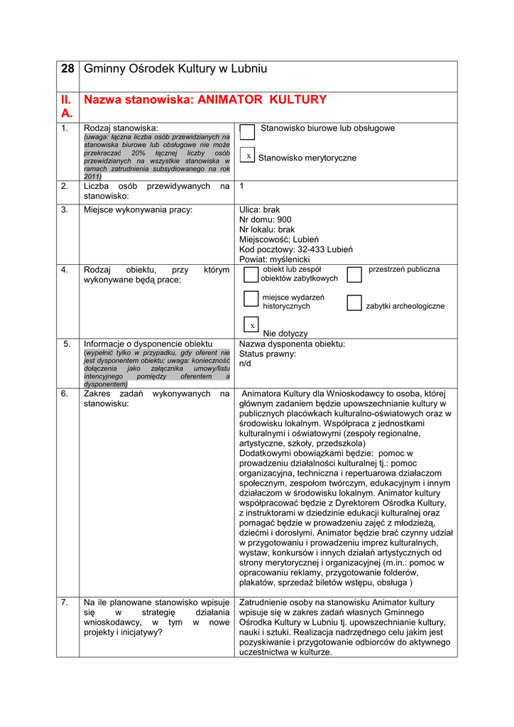 28 Gminny Ośrodek Kultury w Lubniu II. Nazwa stanowiska: ANIMATOR KULTURY A. 1. Rodzaj stanowiska: Stanowisko biurowe lub obsługowe (uwaga: łączna liczba osób przewidzianych na stanowiska biurowe lub obsługowe nie może przekraczać 20% łącznej liczby osób przewidzianych na wszystkie stanowiska w ramach zatrudnienia subsydiowanego na rok 2011) 2. Liczba osób stanowisko: przewidywanych 3. Miejsce wykonywania pracy: 4. Rodzaj obiektu, przy wykonywane będą prace: na x Stanowisko merytoryczne 1 Ulica: brak Nr domu: 900 Nr lokalu: brak Miejscowość; Lubień Kod pocztowy: 32-433 Lubień Powiat: myślenicki obiekt lub zespół obiektów zabytkowych którym miejsce wydarzeń historycznych przestrzeń publiczna zabytki archeologiczne x 5. Informacje o dysponencie obiektu (wypełnić tylko w przypadku, gdy oferent nie jest dysponentem obiektu; uwaga: konieczność dołączenia jako załącznika umowy/listu intencyjnego pomiędzy oferentem a dysponentem) wykonywanych Nie dotyczy Nazwa dysponenta obiektu: Status prawny: n/d 6. Zakres zadań stanowisku: na Animatora Kultury dla Wnioskodawcy to osoba, której głównym zadaniem będzie upowszechnianie kultury w publicznych placówkach kulturalno-oświatowych oraz w środowisku lokalnym. Współpraca z jednostkami kulturalnymi i oświatowymi (zespoły regionalne, artystyczne, szkoły, przedszkola) Dodatkowymi obowiązkami będzie: pomoc w prowadzeniu działalności kulturalnej tj.: pomoc organizacyjna, techniczna i repertuarowa działaczom społecznym, zespołom twórczym, edukacyjnym i innym działaczom w środowisku lokalnym. Animator kultury współpracować będzie z Dyrektorem Ośrodka Kultury, z instruktorami w dziedzinie edukacji kulturalnej oraz pomagać będzie w prowadzeniu zajęć z młodzieżą, dziećmi i dorosłymi. Animator będzie brać czynny udział w przygotowaniu i prowadzeniu imprez kulturalnych, wystaw, konkursów i innych działań artystycznych od strony merytorycznej i organizacyjnej (m.in.: pomoc w opracowaniu reklamy, przygotowanie folderów, plakatów, sprzedaż biletów wstępu, obsługa ) 7. Na ile planowane stanowisko wpisuje się w strategię działania wnioskodawcy, w tym w nowe projekty i inicjatywy? Zatrudnienie osoby na stanowisku Animator kultury wpisuje się w zakres zadań własnych Gminnego Ośrodka Kultury w Lubniu tj. upowszechnianie kultury, nauki i sztuki. Realizacja nadrzędnego celu jakim jest pozyskiwanie i przygotowanie odbiorców do aktywnego uczestnictwa w kulturze. Oczekiwania, co do wymagań kwalifikacyjnych: 8. Wykształcenie: Niezbędne: brak Pożądane: - plastyczne lub muzyczne 9. Doświadczenie zawodowe: Niezbędne: brak Pożądane: - praca z dziećmi i młodzieżą - umiejętności praktyczne w dziedzinie kultury i sztuki 10. Umiejętności: Niezbędne: brak 11. Cechy osobowe: Niezbędne: Pracowitość Pomysłowość Dokładność Pożądane: - umiejętności praktyczne z dziedziny: malarstwo, rysunek, grafika, rzeźba, ceramika Pożądane: Otwartość na nowe doświadczenia 12. Oferta jest kierowana również do osób z niepełnosprawnością Tak 13. Wstępne wymagania dotyczące sprawności kandydata (np. stopień sprawności fizycznej, intelektualnej, wzroku, słuchu, odporność na stres itp.) Umiejętności, które osoba nabędzie na stanowisku: 14. Sposób wprowadzenia osoby na stanowisko (szkolenia wewnętrzne, instruktaże): 15. Sposób nadzoru/ monitorowania pracy na stanowisku: x Nie Osoba zatrudniona na stanowisku Animator kultury pozyska nowe umiejętności i doświadczenia praktyczne- praca w zespole, umiejętność prowadzenia zajęć, rozwiniecie indywidualnych zainteresowań i umiejętności, organizacja i prowadzenie imprez kulturalnych w różnej formie np.: festyny, konkursy, koncerty, kursy tematyczne Rozpoczęcie pracy przez nowego pracownika zostanie poprzedzone przeprowadzeniem szkolenia z zakresu przepisów BHP z inicjatywy Wnioskodawcy. Przed rozpoczęciem nowych zajęć każdorazowo osoba zostanie wprowadzono co do zakresu i sposobu realizacji zadania. Nad osobą zatrudnioną kontrolę i nadzór sprawować będzie bezpośredni przełożony, czyli Dyrektor Gminnego Ośrodka Kultury w Lubniu mgr Danuta Burtan. Nowozatrudniona osoba będzie na bieżąco kontrolowana w zakresie wywiązywania się z nałożonych obowiązków przez Dyrektora oraz pracowników GOK . Pracownik będzie pod stała opieką pracownika GOK, który na bieżąco będzie udzielał wskazówek i rad tak aby realizacja zadania ukończona 16. Sposób organizacji pracy – czas pracy, np. Czy stanowisko wymaga dyspozycyjności w soboty/ niedzielę/ święta? 17. Czy istnieje możliwość zatrudnienia przez Wnioskodawcę po zatrudnieniu subsydiowanym? W stosunku do ilu osób zgłaszanych na stanowisko objęte niniejszą ofertą Wnioskodawca deklaruje możliwość zatrudnienia. Dodatkowe informacje, które mogą być istotne przy ocenie oferty: 18. została sukcesem. Wnioskodawca liczy, jest otwarty na inwencje twórczą , pomysłowość nowego pracownika. Organizacja czasu pracy będzie ustalona następująco: Praca od poniedziałku do piątku w godzinach od 10.00-18.00. Przewiduje się pracę w soboty, niedziele oraz w święta. Czas nadpracowany Wnioskodawca zwróci pracownikowi w dogodnym dla niego terminie. x Tak Nie Liczba osób: 1 Gminny Ośrodek Kultury jest Instytucją Kultury, której organizatorem jest Gmina Lubień. Swą działalnością obejmuje teren wiejski, leżący w powiecie myślenickim, w województwie małopolskim. W skład Gminy wchodzą 4 wsie: Lubień, Tenczyn, Krzeczów i Skomielna Biała. Przy GOK działają: Zespół regionalny "Zagórzanie" z Lubnia, "Toporzanie" z Tenczyna, grupy kolędnicze z Lubnia i Tenczyna, Młodzieżowa Orkiestra Dęta z Tenczyna, Orkiestra Dęta ze Skomielnej Białej, Drużyna ZHP "Polskie Orły", Teatr Dziecięcy "Nowi" oraz Teatr Ludowy im. F. Macioła ze Skomielnej Białej. Dużym zadowoleniem cieszą się zajęcia plastyczne, manualne, cera