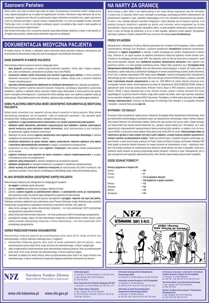 Szanowni Państwo NA NARTY ZA GRANICĘ Zima w pełni, choć może za oknem tego wcale nie widać. W poszukiwaniu narciarskich wrażeń i białego puchu coraz częściej decydujemy się na wyjazd do zagranicznych kurortów. Zachwyceni wizją oderwania się od rzeczywistości i spędzenia tych kilku dni na pokonywaniu tysiąca kilometrów narciarskich tras, często zapominamy o tym, by zawczasu pomyśleć o naszym zdrowiu i bezpieczeństwie. A o uraz czy wypadek na stoku nietrudno. Trochę więc o tym, co zrobić, by tak długo oczekiwany wyjazd, na przykład w Alpy, nawet w razie wypadku nie stał się dla nas przykrym wspomnieniem. Dziś również informacje o tym, co powinna zawierać nasza dokumentacja medyczna, a także, w jaki sposób, jeśli zajdzie taka potrzeba, zakłady opieki zdrowotnej mogą nam ją udostępnić. Sezon zimowy w pełni. Wielu z nas chętnie planuje w tym czasie dłuższy wypoczynek, aby móc skorzystać z uroków zimy. Ci natomiast, którym czas i obowiązki nie pozwalają, zadowalają się krótkimi weekendowymi lub jednodniowymi wypadami w góry. Jednakże niesprzyjająca w tym roku zimowemu wypoczynkowi aura sprawia, że wielu z nas, szukając lepszych warunków śniegowych, często decyduje się na wyjazd za granicę. A że podczas zimowych szaleństw o wypadek czy groźny uraz nietrudno, warto przygotować się na taką ewentualność. Jeszcze przed wyjazdem sprawdźmy zatem, na jakie bezpłatne świadczenia medyczne możemy liczyć w kraju, do którego się wybieramy, a za co, w razie wypadku, będziemy musieli zapłacić. Szczegółowe informacje uzyskamy w śląskim oddziale NFZ oraz na stronie internetowej www.nfz-katowice.pl. PRZED WYJAZDEM DOKUMENTACJA MEDYCZNA PACJENTA W świetle artykułu 18 Ustawy o zakładach opieki zdrowotnej każda placówka medyczna zobowiązana jest do prowadzenia dokumentacji medycznej osób korzystających z jej świadczeń zdrowotnych. DANE ZAWARTE W KARCIE PACJENTA Dokumentacja medyczna powinna zawierać następujące dane: 1. dane pacjenta, pozwalające na ustalenie jego tożsamości (nazwisko i imiona, data i miejsce urodzenia, płeć, adres zameldowania, zamieszkania lub pobytu oraz numer PESEL) 2. oznaczenie zakładu opieki zdrowotnej oraz komórki organizacyjnej zakładu, w której udzielono świadczeń zdrowotnych (nazwy jednostki organizacyjnej i zakładu, adresy wraz z numerami telefonów i kodami identyfikacyjnymi) 3. opis stanu zdrowia pacjenta lub udzielonych mu świadczeń zdrowotnych wraz z datą jego sporządzenia. Dokumentację wypełnia czytelnie pracownik placówki medycznej, posiadający odpowiednie uprawnienia zawodowe i ustalony w zakładzie zakres czynności. Kolejne wpisy dokonywane w karcie powinny być sporządzane w porządku chronologicznym, z zaznaczeniem końca każdego wpisu oraz czytelnym podpisem osoby go dokonującego. Wpisy błędne powinny być skreślone, opatrzone datą i podpisem osoby dokonującej skreślenia. KOMU PLACÓWKA MEDYCZNA MOŻE UDOSTĘPNIĆ DOKUMENTACJĘ MEDYCZNĄ PACJENTA Zakład opieki zdrowotnej musi zapewnić ochronę danych zawartych w karcie pacjenta. Może jednak dokumentację udostępniać, ale nie wszystkim, i tylko na określonych warunkach. I tak, placówka opieki zdrowotnej może, według przepisów Ustawy, udostępnić dokumentację: 1. pacjentowi lub jego przedstawicielowi ustawowemu bądź osobie upoważnionej przez pacjenta 2. zakładom opieki zdrowotnej, jednostkom organizacyjnym tych zakładów i osobom wykonującym zawód medyczny poza zakładami opieki zdrowotnej, jeżeli dokumentacja ta jest niezbędna do zapewnienia ciągłości świadczeń zdrowotnych 3. właściwym do spraw zdrowia organom państwowym oraz organom samorządu lekarskiego w zakresie niezbędnym do wykonywania kontroli i nadzoru 4. ministrowi właściwemu do spraw zdrowia, sądom, prokuratorom, lekarzom sądowym oraz sądom i rzecznikom odpowiedzialności zawodowej w związku z prowadzonym postępowaniem 5. uprawnionym na mocy odrębnych ustaw organom i instytucjom, jeżeli badanie zostało przeprowadzone na ich wniosek 6. organom rentowym oraz zespołom do spraw orzekania o stopniu niepełnosprawności w związku z prowadzonym przez nie postępowaniem 7. rejestrom usług medycznych w zakresie niezbędnym do prowadzenia rejestrów 8. zakładom ubezpieczeń na zasadach określonych w przepisach o działalności ubezpieczeniowej 9. szkole wyższej lub jednostce badawczo-rozwojowej do wykorzystania dla celów naukowych, bez ujawniania nazwiska i innych danych umożliwiających identyfikację osoby, której dokumentacja dotyczy. W JAKI SPOSÓB MOŻNA UDOSTĘPNIĆ KARTĘ PACJENTA Dokumentacja medyczna jest udostępniana na następujących zasadach: 1. do wglądu w zakładzie opieki zdrowotnej 2. poprzez odpłatne sporządzenie jej wyciągów, odpisów lub kopii 3. poprzez wydanie oryginału za pokwitowaniem odbioru i z zastrzeżeniem zwrotu po wykorzystaniu, jeśli uprawniony organ lub podmiot żąda udostępnienia oryginałów tej dokumentacji. Udostępnienie dokumentacji medycznej poprzez sporządzenie wyciągów, odpisów lub kopii jest płatne. Podstawą wyliczenia odpłatności jest publikowana przez Prezesa Głównego Urzędu Statystycznego wysokość miesięcznego wynagrodzenia w gospodarce narodowej w poprzednim kwartale. I tak, opłata za: 1. jedną stronę wyciągu lub odpisu dokumentacji medycznej – nie może przekraczać 0,0015 przeciętnego wynagrodzenia w poprzednim kwartale 2. jedną stronę kopii dokumentacji medycznej – nie może przekraczać 0,00015 przeciętnego wynagrodzenia 3. sporządzenie wyciągu, odpisu lub kopii dokumentacji medycznej na elektronicznym nośniku danych, jeżeli zakład prowadzi dokumentację medyczną w formie elektronicznej – nie może przekraczać 0,001 przeciętnego wynagrodzenia. Ubezpieczenie w Narodowym Funduszu Zdrowia gwarantuje nam w krajach Unii Europejskiej, a także w Islandii, Liechtensteinie, Norwegii oraz Szwajcarii, uzyskanie be