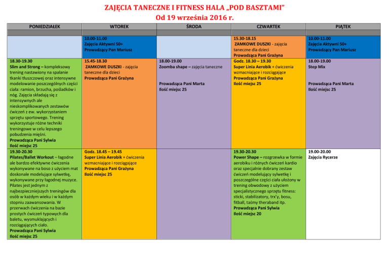 ZAJĘCIA TANECZNE I FITNESS HALA „POD BASZTAMI” Od 19 września 2016 r. PONIEDZIAŁEK WTOREK ŚRODA 10.00-11.00 Zajęcia Aktywni 50+ Prowadzący Pan Mariusz 18.30-19.30 Slim and Strong – kompleksowy trening nastawiony na spalanie tkanki tłuszczowej oraz intensywne modelowanie poszczególnych części ciała: ramion, brzucha, pośladków i nóg. Zajęcia składają się z intensywnych ale nieskomplikowanych zestawów ćwiczeń z ew. wykorzystaniem sprzętu sportowego. Trening wykorzystuje różne techniki treningowe w celu lepszego pobudzenia mięśni. Prowadząca Pani Sylwia Ilość miejsc 25 19.30-20.30 Pilates/Ballet Workout – łagodne ale bardzo efektywne ćwiczenia wykonywane na boso z użyciem mat doskonale modelujące sylwetkę, wykonywane przy łagodnej muzyce. Pilates jest jednym z najbezpieczniejszych treningów dla osób w każdym wieku i w każdym stopniu zaawansowania. W przerwach ćwiczenia na bazie prostych ćwiczeń typowych dla baletu, wysmuklających i rozciągających ciało. Prowadząca Pani Sylwia Ilość miejsc 25 15.45-18.30 ZAMKOWE DUSZKI - zajęcia taneczne dla dzieci Prowadząca Pani Grażyna 18.00-19.00 Zoomba shape – zajęcia taneczne Prowadząca Pani Marta Ilość miejsc 25 Godz. 18.45 – 19.45 Super Linia Aerobik + ćwiczenia wzmacniające i rozciągające Prowadząca Pani Grażyna Ilość miejsc 25 CZWARTEK PIĄTEK 15.30-18.15 ZAMKOWE DUSZKI - zajęcia taneczne dla dzieci Prowadząca Pani Grażyna Godz. 18.30 – 19.30 Super Linia Aerobik + ćwiczenia wzmacniające i rozciągające Prowadząca Pani Grażyna Ilość miejsc 25 10.00-11.00 Zajęcia Aktywni 50+ Prowadzący Pan Mariusz 19.30-20.30 Power Shape – rozgrzewka w formie aerobiku i różnych ćwiczeń kardio oraz specjalnie dobrany zestaw ćwiczeń modelujący sylwetkę i poszczególne części ciała ułożony w trening obwodowy z użyciem specjalistycznego sprzętu fitness: sticki, stabilizatory, trx’y, bosu, fitball, taśmy theraband itp. Prowadząca Pani Sylwia Ilość miejsc 20 19.00-20.00 Zajęcia Rycerze 18.00-19.00 Step Mix Prowadząca Pani Marta Ilość miejsc 25