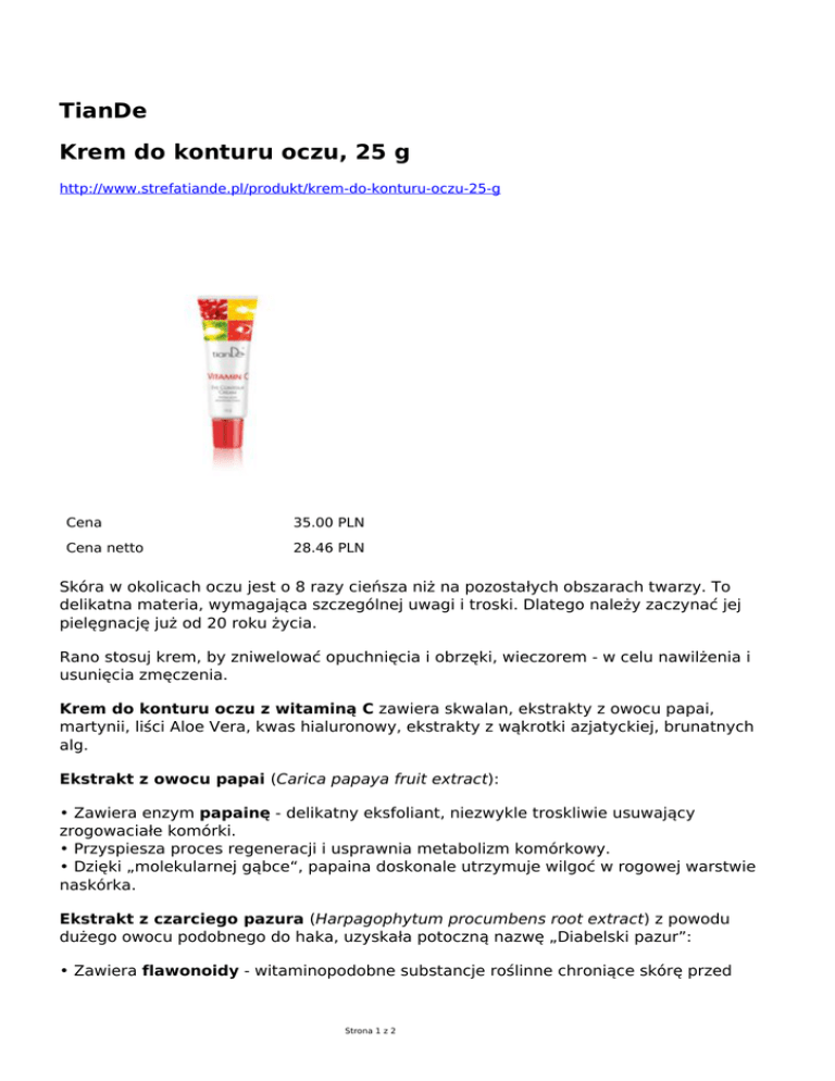 TianDe Krem do konturu oczu, 25 g http://www.strefatiande.pl/produkt/krem-do-konturu-oczu-25-g Cena 35.00 PLN Cena netto 28.46 PLN Skóra w okolicach oczu jest o 8 razy cieńsza niż na pozostałych obszarach twarzy. To delikatna materia, wymagająca szczególnej uwagi i troski. Dlatego należy zaczynać jej pielęgnację już od 20 roku życia. Rano stosuj krem, by zniwelować opuchnięcia i obrzęki, wieczorem - w celu nawilżenia i usunięcia zmęczenia. Krem do konturu oczu z witaminą C zawiera skwalan, ekstrakty z owocu papai, martynii, liści Aloe Vera, kwas hialuronowy, ekstrakty z wąkrotki azjatyckiej, brunatnych alg. Ekstrakt z owocu papai (Carica papaya fruit extract): • Zawiera enzym papainę - delikatny eksfoliant, niezwykle troskliwie usuwający zrogowaciałe komórki. • Przyspiesza proces regeneracji i usprawnia metabolizm komórkowy. • Dzięki „molekularnej gąbce“, papaina doskonale utrzymuje wilgoć w rogowej warstwie naskórka. Ekstrakt z czarciego pazura (Harpagophytum procumbens root extract) z powodu dużego owocu podobnego do haka, uzyskała potoczną nazwę „Diabelski pazur”: • Zawiera flawonoidy - witaminopodobne substancje roślinne chroniące skórę przed Strona 1 z 2 działaniem wolnych rodników - podstawową przyczyną przedwczesnego starzenia się skóry. • Koi podrażnioną i wrażliwą skórę. • Stymuluje regenerację komórek. Ekstrakt z brunatnych alg (Phyllacantha fibrosa extract): • Aktywuje metabolizm komórkowy i oddychanie komórkowe. • Zapobiega procesom przedwczesnego wiotczenia skóry, stymuluje regenerację komórek. • Przywraca mineralną równowagę w komórkach skóry. • Nasyca skórę wilgocią. Fakt: Algi - to cenne lecznicze zasoby, prawdziwa apteka z dna morza: przy badaniu światowego oceanu odkryto, że skład wody morskiej jest bliski składowi ludzkiej plazmy, a połączenie substancji wchodzących w skład alg prawie całkowicie dubluje ich połączenie we krwi i tkankach ludzkich. Ekstrakt z wąkrotki azjatyckiej (Centella asiatica leaf extract) - „Zioło pamięci” - taką nazwę roślina uzyskała dzięki właściwości poprawienia dopływu krwi do mózgu, tym samym poprawiając zdolności intelektualne. Kosmetyczny efekt tej właściwości przejawia się w zmniejszeniu opuchnięć. Ekstrakt z wąkrotki azjatyckiej: • Normalizuje mikrokrążenie, wzmacnia ścianki naczyń krwionośnych, sprzyja usunięciu nadmiaru płynów i niwelowaniu obrzęków. • Jest źródłem magnezu, witamin A, B, E i K. • Tryteprenowe saponiny, zawarte w roślinie, są niezbędne do syntezy kolagenu. Działanie: • Nawilża i chroni skórę wokół oczu, zapobiega powstawaniu zmarszczek. • Odżywia skórę, stymuluje procesy regeneracji. • Zmniejsza obrzęki, cienie pod oczami. Zastosowanie: Lekko poklepując, nałożyć na skórę wokół oczu. Nie masuj. W celu osiągnięcia maksymalnego efektu stosuj rano i wieczorem. Zalecany jest do skóry pozbawionej blasku, o obniżonej odporności, przy oznakach zmęczenia i stresu. Rezultat: Skóra powiek staje się miękka, gładka i lśniąca! Opakowanie: 25 g. Strona 2 z 2 Powered by TCPDF (www.tcpdf.org)