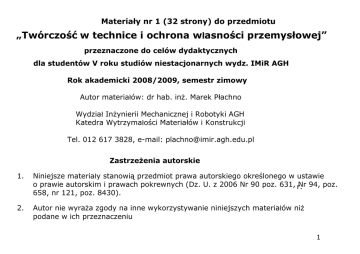Materiały nr 1 (32 strony) do przedmiotu „Twórczość w technice i ochrona własności przemysłowej” przeznaczone do celów dydaktycznych dla studentów V roku studiów niestacjonarnych wydz. IMiR AGH Rok akademicki 2008/2009, semestr zimowy Autor materiałów: dr hab. inŜ. Marek Płachno Wydział InŜynierii Mechanicznej i Robotyki AGH Katedra Wytrzymałości Materiałów i Konstrukcji Tel. 012 617 3828, e-mail: [email protected] ZastrzeŜenia autorskie 1. Niniejsze materiały stanowią przedmiot prawa autorskiego określonego w ustawie o prawie autorskim i prawach pokrewnych (Dz. U. z 2006 Nr 90 poz. 631, r. Nr 94, poz. 658, nr 121, poz. 8430). 2. Autor nie wyraŜa zgody na inne wykorzystywanie niniejszych materiałów niŜ podane w ich przeznaczeniu 1 Twórczość w technice i ochrona własności przemysłowej Osoba prowadząca przedmiot dr hab. inŜ. Marek Płachno Katedra Wytrzymałości Materiałów i Konstrukcji Tel./fax: 012 617 3828 e-mail: [email protected] 2 DOBRA NIEMATERIALNE Własność intelektualna, przemysłowa, handlowa UTWORY ROZWIĄZANIA • Literackie • Wynalazki • Muzyczne • Wzory uŜytkowe • Plastyczne • Wzory przemysłowe • Naukowe • Opracowania • Dokumentacja • Programy komputerowe • Działalność wykonawcza artystów • Topografia układów scalonych OZNACZENIA • Nazwy handlowe • Znaki towarowe i firmowe • Oznaczenia geograficzne • Tajemnice produkcyjne, organizacyjne, handlowe i inne 3 UTWORY ROZWIĄZANIA OZNACZENIA KONWENCJA BEREŃSKA 1886 KONWENCJA PARYSKA 1883 o ochronie dzieł literackich i artystycznych o ochronie własności przemysłowej Ustawa o prawie autorskim i prawach pokrewnych (Dz. U z 2006 r. Nr 90, poz. 631, Nr 94, poz. 658, Nr 121, poz. 8430) Ustawa Prawo własności przemysłowej z dnia 30 czerwca 2000r. (Dz. U. z 2001 r. Nr 49 poz. 508.) Ustawa z dnia 29 czerwca 2007 o zmianie ustawy Prawo własności przemysłowej (Dz. U. z 2007r. Nr 136 poz. 958) 4 Główne definicje i postanowienia wynikające z Ustaw: Prawo własności przemysłowej z dnia 30 czerwca 2000r. (Dz. U. z 2001 r. Nr 49 poz. 508.) Ustawa z dnia 29 czerwca 2007 o zmianie ustawy Prawo własności przemysłowej (Dz. U. z 2007r. Nr 136 poz. 958) Część I 5 Jakie utwory obejmuje ustawa pod nazwą projekty wynalazcze? (Art. 3) Są to: • • • • • wynalazki, wzory uŜytkowe, wzory przemysłowe, topografie układów scalonych, Projekty racjonalizatorskie Wynalazki, wzory uŜytkowe, wzory przemysłowe oraz topografie układów scalonych podlegają ochronie przez Urząd Patentowy (UP) Projekty racjonalizatorskie są chronione przez podmiot gospodarczy, będący właścicielem tego projektu. 6 Co to jest wynalazek ? (Art. 24) Jest rozwiązanie, które spełłnia kaŜdy z czterech warunków: ● ma charakter techniczny, ● nadaje się do przemysłowego stosowania, ● jest nowe, ● ma poziom wynalazczy. 7 Kiedy rozwiązanie ma charakter techniczny? Wtedy, gdy moŜna je materialnie urzeczywistnić przez techniczne oddziaływanie na materię. Kiedy rozwiązanie techniczne nadaje się do przemysłowego stosowania? (Art. 27) Wtedy, gdy według tego rozwiązania można, w rozumieniu technicznym, w jakiejkolwiek działalności przemysłowej, nie wykluczając rolnictwa, uzyskać wytwór lub wykorzystać sposób (zrealizować technologię). 8 Kiedy rozwiązanie techniczne jest nowe? (Art. 25) Wtedy, gdy: • nie jest częś ęścią ęś ą stanu techniki, czyli wszystkich informacji , które do dnia wystąpienia do Urzędu Patentowego o ochronę tego rozwiązania, zostały udostępnione do wiadomości powszechnej w jakiejkolwiek formie, • nie zawiera informacji, które wcześniej zostały zawarte w zgłłoszeniach wynalazków lub wzorów użytkowych, przyję ętych przez Urząd Patentowy. 9 Kiedy rozwiązanie techniczne ma poziom wynalazczy? (Art. 26) Wtedy, gdy dla znawcy przedmiotu tego rozwiązania jest ono nieoczywiste względem stanu techniki, tzn. przekracza rutynowe działania inŜynierskie. 10 Co to jest patent na wynalazek? (Art. 54) Patent na wynalazek jest to okresowe prawo trwające nie dłuŜej niŜ 20 lat do wyłącznego korzystania z wynalazku na całym obszarze Rzeczypospolitej Polskiej (patent udzielony przez Urząd Patentowy RP) 11 Jakie rozwiązania spełniające warunki wynalazku nie mogą być opatentowane ? (Art. 28, 29) • odkrycia, teorie naukowe i metody matematyczne, • programy komputerowe, • plany, zasady i metody działalności umysłowej, gospodarczej oraz gier, • odmiany roślin, rasy zwierząt oraz czysto biologiczne sposoby hodowli, • sposoby leczenia i diagnostyki zdrowia ludzi i zwierząt, 12 Jakie rozwiązania spełniające warunki wynalazku nie mogą być opatentowane ? (Art. 28, 29) c.d. •wytwory, których niemoŜliwość wykorzystania moŜe być wykazana w świetle powszechnie przyjętych i uznanych zasad nauki, •wytwory o charakterze jedynie estetycznym, •rozwiązania , których wykorzystywanie byłoby sprzeczne z porządkiem publicznym lub dobrymi obyczajami. 13 Na czym polega prawo nazywane patentem na wynalazek ? (Art. 63–75) ● Uprawniony z patentu (osoba która uzyskała patent) posiada prawo do wyłącznego korzystania z wynalazku w sposób zarobkowy lub zawodowy na całym obszarze RP. Prawo to jest zbywalne i podlega dziedziczeniu. ● Korzystanie z wynalazku przez inne osoby niŜ uprawniony z patentu wymaga uzyskania zgody ze strony uprawnionego, np. w formie licencji. ● Patent trwa 20 lat od dnia zgłoszenia wynalazku w UP RP, o ile uprawniony wnosi do Urzędu Patentowego opłaty za ochronę wynalazku. ● Zakres ochrony wynalazku podają zastrzeŜenia patentowe zawarte w dokumencie patentowym. 14 Na czym polega prawo nazywane patentem na wynalazek ? C.d. (Art. 63–75) • Patent na wynalazek dotyczący sposobu wytwarzarzania rozciąga się takŜe na wyroby uzyskane tym sposobem. • Nie narusza się patentu na wynalazek przez stosowanie wynalazku do celów badawczych i dla usu