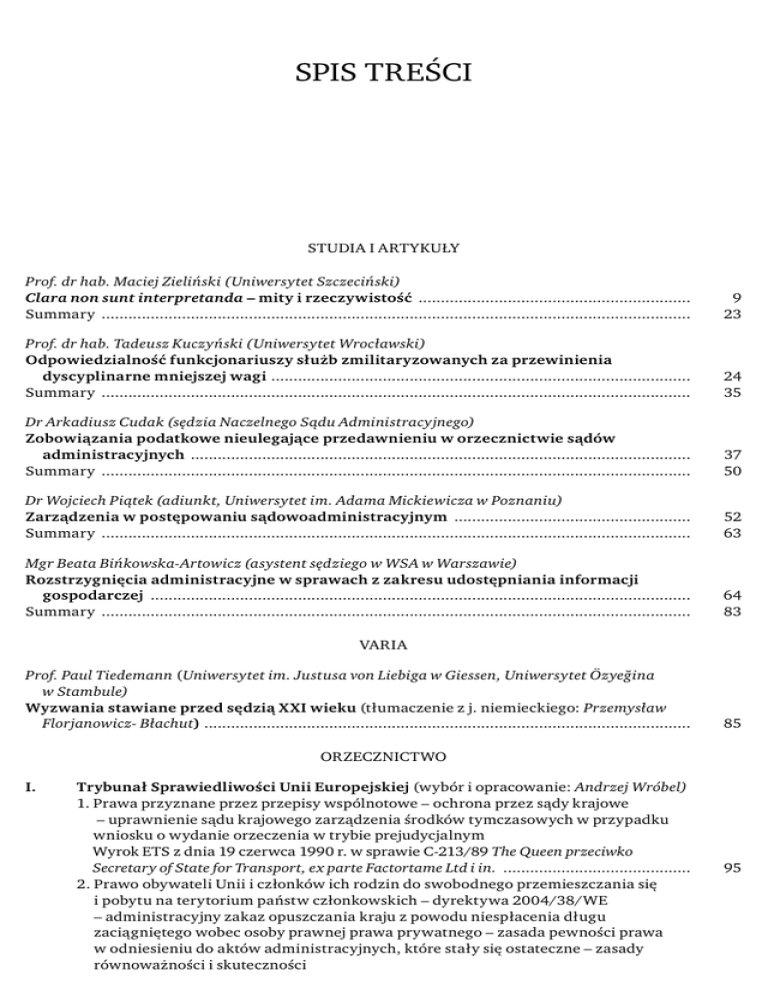 SPIS TREŚCI STUDIA I ARTYKUŁY Prof. dr hab. Maciej Zieliński (Uniwersytet Szczeciński) Clara non sunt interpretanda – mity i rzeczywistość ............................................................. Summary .................................................................................................................................... 9 23 Prof. dr hab. Tadeusz Kuczyński (Uniwersytet Wrocławski) Odpowiedzialność funkcjonariuszy służb zmilitaryzowanych za przewinienia dyscyplinarne mniejszej wagi .............................................................................................. Summary .................................................................................................................................... 24 35 Dr Arkadiusz Cudak (sędzia Naczelnego Sądu Administracyjnego) Zobowiązania podatkowe nieulegające przedawnieniu w orzecznictwie sądów administracyjnych ................................................................................................................ Summary .................................................................................................................................... 37 50 Dr Wojciech Piątek (adiunkt, Uniwersytet im. Adama Mickiewicza w Poznaniu) Zarządzenia w postępowaniu sądowoadministracyjnym ..................................................... Summary .................................................................................................................................... 52 63 Mgr Beata Bińkowska-Artowicz (asystent sędziego w WSA w Warszawie) Rozstrzygnięcia administracyjne w sprawach z zakresu udostępniania informacji gospodarczej ......................................................................................................................... Summary .................................................................................................................................... 64 83 VARIA Prof. Paul Tiedemann (Uniwersytet im. Justusa von Liebiga w Giessen, Uniwersytet Özyeğina w Stambule) Wyzwania stawiane przed sędzią XXI wieku (tłumaczenie z j. niemieckiego: Przemysław Florjanowicz- Błachut) ............................................................................................................. 85 ORZECZNICTWO I. Trybunał Sprawiedliwości Unii Europejskiej (wybór i opracowanie: Andrzej Wróbel) 1. Prawa przyznane przez przepisy wspólnotowe – ochrona przez sądy krajowe – uprawnienie sądu krajowego zarządzenia środków tymczasowych w przypadku wniosku o wydanie orzeczenia w trybie prejudycjalnym Wyrok ETS z dnia 19 czerwca 1990 r. w sprawie C-213/89 The Queen przeciwko Secretary of State for Transport, ex parte Factortame Ltd i in. .......................................... 2. Prawo obywateli Unii i członków ich rodzin do swobodnego przemieszczania się i pobytu na terytorium państw członkowskich – dyrektywa 2004/38/WE – administracyjny zakaz opuszczania kraju z powodu niespłacenia długu zaciągniętego wobec osoby prawnej prawa prywatnego – zasada pewności prawa w odniesieniu do aktów administracyjnych, które stały się ostateczne – zasady równoważności i skuteczności 95 4 II. III. IV. V. VI. Zeszyty Naukowe Sądownictwa Administracyjnego 6 (45)/2012 Wyrok TSUE z dnia 4 października 2012 r. w sprawie C-249/11 Christo Bjankow przeciwko Gławen sekretar na Ministerstwo na wytresznite raboti ................................ 99 Europejski Trybunał Praw Człowieka (wybór i opracowanie: Agnieszka Wilk-Ilewicz) Stosowanie przepisu uznanego za niekonstytucyjny w okresie między wejściem w życie orzeczenia Trybunału Konstytucyjnego a nowelizacją ustawy Wyrok ETPC z dnia 16 października 2012 r. w sprawie Kędzior przeciwko Polsce (skarga nr 45026/07) ................................................................................................................... 112 Trybunał Konstytucyjny (wybór: Irena Chojnacka, opracowanie: Mieszko Nowicki) 1. Wyrok TK z dnia 17 lipca 2012 r. (sygn. akt P 30/11) [dot. braku poinformowania o zawieszeniu biegu terminu przedawnienia zobowiązania podatkowego w kontekście zasady ochrony zaufania obywatela do państwa (art. 2 Konstytucji)] .... 2. Wyrok TK z dnia 27 września 2012 r. (sygn. akt SK 4/11) [dot. zgodności art. 4241 § 1 k.p.c. z art. 77 ust. 1 Konstytucji] ........................................................................... 124 Sąd Najwyższy (wybór i opracowanie: Dawid Miąsik) Wyrok SN z dnia 16 lutego 2012 r. (sygn. akt IV CSK 225/11) [dot. stosowania dyrektywy przez sąd krajowy przed jej wdrożeniem do prawa wewnętrznego] .............. 129 Naczelny Sąd Administracyjny i wojewódzkie sądy administracyjne A. Orzecznictwo Naczelnego Sądu Administracyjnego (wybór: Stefan Babiarz, opracowanie: Marcin Wiącek) 1. Uchwała składu siedmiu sędziów NSA z dnia 29 października 2012 r. (sygn. akt I GPS 1/12) [dot. akcyzy na produkty energetyczne wykorzystywane do celów innych niż napędowe lub grzewcze] ......................................................................... 2. Uchwała składu siedmiu sędziów NSA z dnia 29 października 2012 r. (sygn. akt II GPS 3/12) [dot. charakteru prawnego terminu na złożenie przez spadkobiercę rolnika, który wnioskował o przyznanie płatności, postanowienia o stwierdzeniu nabycia spadku] ....................................................................................................... B. Orzecznictwo wojewódzkich sądów administracyjnych (wybór: Bogusław Gruszczyński, opracowanie: Marcin Wiącek) 1. Wyrok WSA w Gdańsku z dnia 5 października 2011 r. (sygn. akt II SA/Gd 218/11) [dot. podmiotu uprawnionego do wyrażenia zgody na przeniesienie pozwolenia na budowę] .............................................................................................................. 2. Wyrok WSA w Białymstoku z dnia 11 października 2011 r. (sygn.akt II SA/Bk 98/11) [dot. skutków postanowienia sądu adminis