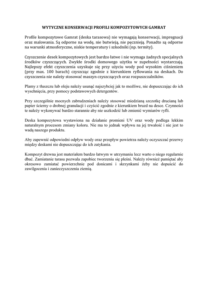 WYTYCZNE KONSERWACJI PROFILI KOMPOZYTOWYCH GAMRAT Profile kompozytowe Gamrat (deska tarasowa) nie wymagają konserwacji, impregnacji oraz malowania. Są odporne na wodę, nie butwieją, nie pęcznieją. Ponadto są odporne na warunki atmosferyczne, niskie temperatury i szkodniki (np. termity). Czyszczenie desek kompozytowych jest bardzo łatwe i nie wymaga żadnych specjalnych środków czyszczących. Zwykłe środki domowego użytku w zupełności wystarczają. Najlepszy efekt czyszczenia uzyskuje się przy użyciu wody pod wysokim ciśnieniem (przy max. 100 barach) czyszcząc zgodnie z kierunkiem ryflowania na deskach. Do czyszczenia nie należy stosować maszyn czyszczących oraz rozpuszczalników. Plamy z tłuszczu lub oleju należy usunąć najszybciej jak to możliwe, nie dopuszczając do ich wyschnięcia, przy pomocy podstawowych detergentów. Przy szczególnie mocnych zabrudzeniach należy stosować miedzianą szczotkę drucianą lub papier ścierny o drobnej granulacji i czyścić zgodnie z kierunkiem bruzd na desce. Czynności te należy wykonywać bardzo starannie aby nie uszkodzić lub zmienić wymiarów ryfli. Deska kompozytowa wystawiona na działanie promieni UV oraz wody podlega lekkim naturalnym procesom zmiany koloru. Nie ma to jednak wpływu na jej trwałość i nie jest to wadą naszego produktu. Aby zapewnić odpowiedni odpływ wody oraz przepływ powietrza należy oczyszczać przerwy między deskami nie dopuszczając do ich zatykania. Kompozyt drewna jest materiałem bardzo łatwym w utrzymaniu lecz warto o niego regularnie dbać. Zamiatanie tarasu pozwala zapobiec tworzeniu się pleśni. Należy również pamiętać aby okresowo zamiatać powierzchnie pod donicami i skrzynkami żeby nie dopuścić do zawilgocenia i zanieczyszczenia ziemią.