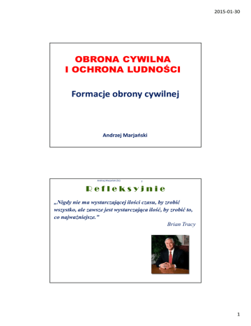 2015-01-30 OBRONA CYWILNA I OCHRONA LUDNOŚCI Formacje obrony cywilnej Andrzej Marjański Andrzej Marjański (51) 2 Refleksyjnie „Nigdy nie ma wystarczającej ilości czasu, by zrobić wszystko, ale zawsze jest wystarczająca ilość, by zrobić to, co najważniejsze.” Brian Tracy 1 2015-01-30 Andrzej Marjański (51) 3 Agenda Podstawa tworzenia formacji obrony cywilnej Zadania formacji obrony cywilnej Rodzaje formacji obrony cywilnej Stopnie gotowości Czasy osiągania pełnej gotowości Przykłady formacji do zadań ogólnych Przykłady formacji do zadań specjalistycznych Zasady opracowywania planów działania formacji Układ treści meldunków o zagrożeniach nadzwyczajnych Andrzej Marjański (51) 4 Art. 138. Ustawy o powszechnym obowiązku obrony RP Podstawowymi jednostkami organizacyjnymi przeznaczonymi do wykonywania zadań obrony cywilnej są formacje obrony cywilnej Formacje obrony cywilnej składają się z oddziałów obrony cywilnej przeznaczonych do: wykonywania zadań ogólnych wykonywania zadań specjalnych innych jednostek tych formacji. 2 2015-01-30 Andrzej Marjański (51) 5 Art. 138. Ustawy o powszechnym obowiązku obrony RP Formacje obrony cywilnej tworzą uwzględniając w szczególności: skalę występujących zagrożeń, rodzaj formacji, ich przeznaczenie oraz stan osobowy i organizację wewnętrzną : ministrowie, wojewodowie, starostowie, wójtowie lub burmistrzowie (prezydenci miast) Formacje obrony cywilnej mogą tworzyć także pracodawcy. Andrzej Marjański (51) 6 Zadania jednostek organizacyjnych OC Formacje obrony cywilnej - podstawowe jednostki organizacyjne OC przeznaczone do: ratowania i udzielania pomocy poszkodowanej ludności, zapewnieniu jej warunków niezbędnych do przetrwania w okresie wojny, (51) do likwidacji skutkówAndrzej klęskMarjański żywiołowych, katastrof i awarii 3 2015-01-30 Andrzej Marjański (51) 7 WYTYCZNE Szefa Obrony Cywilnej Kraju w sprawie zasad organizacji i sposobu przeprowadzania szkoleń z zakresu ochrony ludności i obrony cywilnej zatwierdzone w dniu 21 kwietnia 2009 r. Andrzej Marjański (51) 8 Zadania formacji obrony cywilnej wykrywanie zagrożeń oraz ostrzeganie i alarmowanie, organizowanie ewakuacji ludności przygotowanie budowli ochronnych, zaopatrywanie ludności w sprzęt i środki ochrony indywidualnej, zaciemnianie i wygaszanie oświetlenia, organizowanie i prowadzenie akcji ratunkowych, udzielanie poszkodowanym pomocy medycznej, walkę z pożarami 4 2015-01-30 Andrzej Marjański (51) 9 Zadania formacji obrony cywilnej – c.d. przygotowanie oraz prowadzenie likwidacji skażeń i zakażeń, ochronę żywności i innych dóbr niezbędnych do przetrwania, organizowanie doraźnych pomieszczeń i zaopatrzenia dla poszkodowanej ludności, zabezpieczenie dóbr kultury, urządzeń użyteczności publicznej i ważnej dokumentacji, doraźne przywracanie działania niezbędnych służb użyteczności publicznej, w tym pomoc w budowie i odbudowie awaryjnych ujęć wody pitnej, doraźną pomoc w przywracaniu i utrzymaniu porządku w strefach dotkniętych klęskami, doraźną pomoc w grzebaniu zmarłych. Andrzej Marjański (51) 10 Rodzaje oddziałów obrony cywilnej Formacje obrony cywilnej składają się z oddziałów obrony cywilnej przeznaczonych do: wykonywania zadań ogólnych specjalnych innych jednostek tych formacji 5 2015-01-30 Andrzej Marjański (51) 11 Podział zadań formacji obrony cywilnej Formacje ratownictwa ogólnego – podstawowa siła w prowadzeniu akcji ratunkowej w rejonie zagrożenia lub klęski żywiołowej Formacje specjalistyczne – wsparcie akcji ratunkowej prowadzonej przez formacje ratownictwa ogólnego Andrzej Marjański (51) 12 Oddziały do zadań specjalnych 1) 2) 3) 4) 5) 6) 7) 8) 9) pierwszej pomocy medycznej, likwidacji skażeń ratownictwa budowlanego, ratownictwa komunalnego, ratownictwa energetycznego, schronowe, przeciwpożarowe, porządkowo-ochronne, łączności, 6 2015-01-30 Andrzej Marjański (51) 13 Oddziały do zadań specjalnych 10) zaopatrzenia i zabezpieczenia, 11) wykrywania i alarmowania, 12) lotnicze 13) ochrony płodów rolnych, 14) ochrony produktów żywnościowych, 15) ochrony zwierząt gospodarskich i pasz, 16) ratownictwa chemicznego, 17) ratownictwa przeciwpowodziowego, 18) budowy i odbudowy awaryjnych ujęć wody. Andrzej Marjański (51) 14 Podmioty tworzące formacje OC ministrowie, wojewodowie, starostowie, wójtowie lub burmistrzowie (prezydenci miast) kierownicy (właściciele) zakładów pracy według potrzeb i możliwości 7 2015-01-30 Andrzej Marjański (51) 15 Gdzie tworzy formacje OC Gminach i zakładach pracy zatrudniających powyżej 50 pracowników. W zakładach pracy zatrudniających poniżej 50 pracowników mogą być tworzone wspólne formacje obrony cywilnej dla kilku sąsiadujących ze sobą zakładów. W zakładach pracy, w których gromadzone są substancje stwarzające zagrożenie dla życia i zdrowia okolicznej ludności oraz środowiska, tworzy się formacje OC zdolne do samodzielnego prowadzenia działań ratunkowych w strefach bezpośredniego zagrożenia. W gminach i zakładach pracy, w których utworzono co najmniej dwie formacje OC, może być powołana gmina lub zakładowa komenda obrony cywilnej. Andrzej Marjański (51) 16 Czasy osiągania gotowości do działania przez formacje OC Formacje obrony cywilnej dzielą się ze względu na stopień gotowości do działania na: o wyższym stopniu gotowości; o podstawowym stopniu gotowości. 8 2015-01-30 Andrzej Marjański (51) 17 Formacje obrony cywilnej o wyższym stopniu gotowości Do formacji obrony cywilnej o wyższym stopniu gotowości zalicza się wytypowane formacje: ochrony ogólnej do zadań specjalnych Decyzję o zaliczeniu formacji do wyższego stopnia gotowości podejmuje Szef OC danej jednostki administracyjnej Formacje Systemu Wykrywania i Alarmowania – należą obligatoryjnie do wyższego stopnia gotowości Andrzej Marjański (51) 18 O stopniu gotowości decyduje Szef O