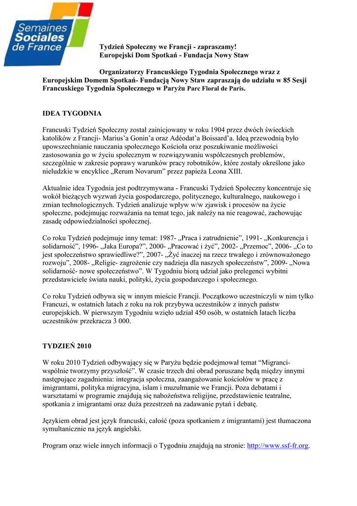 Tydzień Społeczny we Francji - zapraszamy! Europejski Dom Spotkań - Fundacja Nowy Staw Organizatorzy Francuskiego Tygodnia Społecznego wraz z Europejskim Domem Spotkań- Fundacją Nowy Staw zapraszają do udziału w 85 Sesji Francuskiego Tygodnia Społecznego w ParyŜu Parc Floral de Paris. IDEA TYGODNIA Francuski Tydzień Społeczny został zainicjowany w roku 1904 przez dwóch świeckich katolików z Francji- Marius’a Gonin’a oraz Adéodat’a Boissard’a. Ideą przewodnią było upowszechnianie nauczania społecznego Kościoła oraz poszukiwanie moŜliwości zastosowania go w Ŝyciu społecznym w rozwiązywaniu współczesnych problemów, szczególnie w zakresie poprawy warunków pracy robotników, które zostały określone jako nieludzkie w encyklice „Rerum Novarum” przez papieŜa Leona XIII. Aktualnie idea Tygodnia jest podtrzymywana - Francuski Tydzień Społeczny koncentruje się wokół bieŜących wyzwań Ŝycia gospodarczego, politycznego, kulturalnego, naukowego i zmian technologicznych. Tydzień analizuje wpływ w/w zjawisk i procesów na Ŝycie społeczne, podejmując rozwaŜania na temat tego, jak naleŜy na nie reagować, zachowując zasadę odpowiedzialności społecznej. Co roku Tydzień podejmuje inny temat: 1987- „Praca i zatrudnienie”, 1991- „Konkurencja i solidarność”, 1996- „Jaka Europa?”, 2000- „Pracować i Ŝyć”, 2002- „Przemoc”, 2006- „Co to jest społeczeństwo sprawiedliwe?”, 2007- „śyć inaczej na rzecz trwałego i zrównowaŜonego rozwoju”, 2008- „Religie- zagroŜenie czy nadzieja dla naszych społeczeństw”, 2009- „Nowa solidarność- nowe społeczeństwo”. W Tygodniu biorą udział jako prelegenci wybitni przedstawiciele świata nauki, polityki, Ŝycia gospodarczego i społecznego. Co roku Tydzień odbywa się w innym mieście Francji. Początkowo uczestniczyli w nim tylko Francuzi, w ostatnich latach z roku na rok przybywa uczestników z innych państw europejskich. W pierwszym Tygodniu wzięło udział 450 osób, w ostatnich latach liczba uczestników przekracza 3 000. TYDZIEŃ 2010 W roku 2010 Tydzień odbywający się w ParyŜu będzie podejmował temat “Migranciwspólnie tworzymy przyszłość”. W czasie trzech dni obrad poruszane będą między innymi następujące zagadnienia: integracja społeczna, zaangaŜowanie kościołów w pracę z imigrantami, polityka migracyjna, islam i muzułmanie we Francji. Poza debatami i warsztatami w programie znajdują się naboŜeństwa religijne, przedstawienie teatralne, spotkania z imigrantami oraz duŜa przestrzeń na zadawanie pytań i debatę. Językiem obrad jest język francuski, całość (poza spotkaniem z imigrantami) jest tłumaczona symultanicznie na język angielski. Program oraz wiele innych informacji o Tygodniu znajdują na stronie: http://www.ssf-fr.org. INFORMACJE ORGANIZACYJNE Dzięki zaproszeniu organizatorów Francuskiego Tygodnia Społecznego, w konferencji będzie uczestniczyła grupa 50 Polaków. Warunkiem uczestnictwa jest: • • • • • • skończone 18 lat gotowość do udziału w całości Sesji 26-28 listopada 2010 dobry stan zdrowia pozwalający na podróŜ autokarem i udział w trzydniowych obradach zainteresowanie tematyką Tygodnia znajomość języka francuskiego lub angielskiego pozwalająca uczestniczyć w obradach wniesienie opłaty w wysokości 150 PLN Organizatorzy zapewniają: • • bezpłatny transport w obie strony, wyjazd: Lublin w dniu 24.11.2010, powrót w dniu 29.11.2010 zakwaterowanie u rodzin w ParyŜu, Uczestnicy zobowiązani są do zapewnienia sobie Europejskiej Karty Ubezpieczenia Zdrowotnego na czas pobytu we Francji (Karta taka jest bezpłatna i moŜna ją otrzymać w lokalnym oddziale Narodowego Funduszu Zdrowia). Chętni mogą zamówić obiad w postaci lunch pakietu (2 kanapki, deser, woda) w cenie 30,00 PLN w dniach 26- 28. 11. 2010. Nie jesteśmy w stanie zagwarantować, Ŝe rodziny zapewnią śniadania i kolacje, będzie to kwestia indywidualna, naleŜy więc liczyć się z koniecznością pokrycia tego kosztu. Wyjazd w dniu 24 listopada 2010, powrót dnia 29 listopada 2010. PodróŜ odbędzie się dobrej jakości autokarem. ZGŁOSZENIA Zgłoszenia na załączonych formularzach przyjmowane są wyłącznie drogą elektroniczną do dnia 15 października 2010 roku. Decyduje kolejność zgłoszeń. Potwierdzenie udziału otrzymają Państwo w dniu 16. 10. 2010 drogą mailową. Wpłaty za uczestnictwo przyjmowane będą do dnia 18. 10. 2010 (data wpłynięcia na konto). Telefon kontaktowy: Anna Moskwa 662 257 292- po godzinie 17, biuro: Katarzyna Słowińska 0 81 534 61 91. E-mail: [email protected] EUROPEJSKI DOM SPOTKAŃ - FUNDACJA NOWY STAW ul. M. Skłodowskiej- Curie 3; 20 – 029 Lublin tel. 0 81 534 61 91, ; fax 0 81 534 61 92 www.eds-fundacja.pl