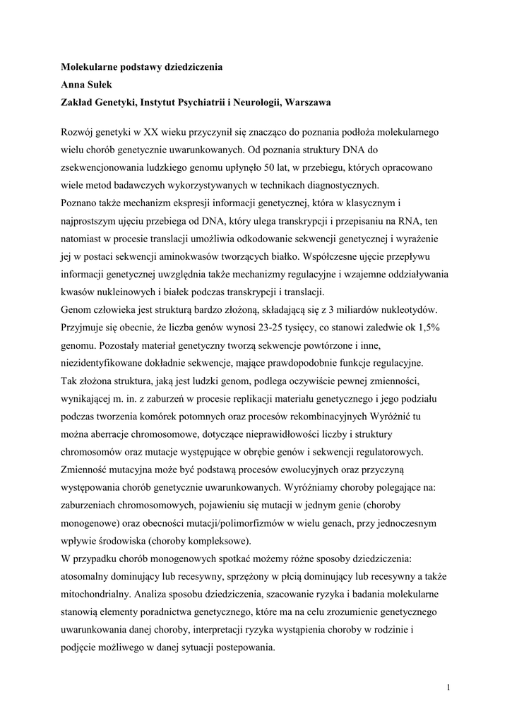 Molekularne podstawy dziedziczenia Anna Sułek Zakład Genetyki, Instytut Psychiatrii i Neurologii, Warszawa Rozwój genetyki w XX wieku przyczynił się znacząco do poznania podłoża molekularnego wielu chorób genetycznie uwarunkowanych. Od poznania struktury DNA do zsekwencjonowania ludzkiego genomu upłynęło 50 lat, w przebiegu, których opracowano wiele metod badawczych wykorzystywanych w technikach diagnostycznych. Poznano także mechanizm ekspresji informacji genetycznej, która w klasycznym i najprostszym ujęciu przebiega od DNA, który ulega transkrypcji i przepisaniu na RNA, ten natomiast w procesie translacji umożliwia odkodowanie sekwencji genetycznej i wyrażenie jej w postaci sekwencji aminokwasów tworzących białko. Współczesne ujęcie przepływu informacji genetycznej uwzględnia także mechanizmy regulacyjne i wzajemne oddziaływania kwasów nukleinowych i białek podczas transkrypcji i translacji. Genom człowieka jest strukturą bardzo złożoną, składającą się z 3 miliardów nukleotydów. Przyjmuje się obecnie, że liczba genów wynosi 23-25 tysięcy, co stanowi zaledwie ok 1,5% genomu. Pozostały materiał genetyczny tworzą sekwencje powtórzone i inne, niezidentyfikowane dokładnie sekwencje, mające prawdopodobnie funkcje regulacyjne. Tak złożona struktura, jaką jest ludzki genom, podlega oczywiście pewnej zmienności, wynikającej m. in. z zaburzeń w procesie replikacji materiału genetycznego i jego podziału podczas tworzenia komórek potomnych oraz procesów rekombinacyjnych Wyróżnić tu można aberracje chromosomowe, dotyczące nieprawidłowości liczby i struktury chromosomów oraz mutacje występujące w obrębie genów i sekwencji regulatorowych. Zmienność mutacyjna może być podstawą procesów ewolucyjnych oraz przyczyną występowania chorób genetycznie uwarunkowanych. Wyróżniamy choroby polegające na: zaburzeniach chromosomowych, pojawieniu się mutacji w jednym genie (choroby monogenowe) oraz obecności mutacji/polimorfizmów w wielu genach, przy jednoczesnym wpływie środowiska (choroby kompleksowe). W przypadku chorób monogenowych spotkać możemy różne sposoby dziedziczenia: atosomalny dominujący lub recesywny, sprzężony w płcią dominujący lub recesywny a także mitochondrialny. Analiza sposobu dziedziczenia, szacowanie ryzyka i badania molekularne stanowią elementy poradnictwa genetycznego, które ma na celu zrozumienie genetycznego uwarunkowania danej choroby, interpretacji ryzyka wystąpienia choroby w rodzinie i podjęcie możliwego w danej sytuacji postepowania. 1