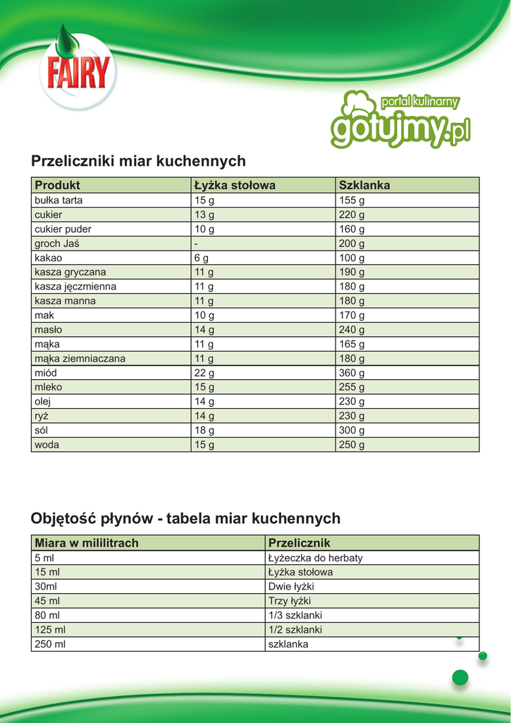 Przeliczniki miar kuchennych Objętość płynów - tabela