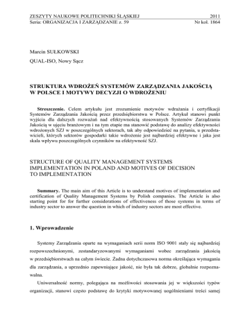 ZESZYTY NAUKOWE POLITECHNIKI ŚLĄSKIEJ Seria: ORGANIZACJA I ZARZĄDZANIE z. 59 2011 Nr kol. 1864 Marcin SUŁKOWSKI QUAL-ISO, Nowy Sącz STRUKTURA WDROŻEŃ SYSTEMÓW ZARZĄDZANIA JAKOŚCIĄ W POLSCE I MOTYWY DECYZJI O WDROŻENIU Streszczenie. Celem artykułu jest zrozumienie motywów wdrażania i certyfikacji Systemów Zarządzania Jakością przez przedsiębiorstwa w Polsce. Artykuł stanowi punkt wyjścia dla dalszych rozważań nad efektywnością stosowanych Systemów Zarządzania Jakością w ujęciu branżowym i na tym etapie ma stanowić podstawę do analizy efektywności wdrożonych SZJ w poszczególnych sektorach, tak aby odpowiedzieć na pytania, u przedstawicieli, których sektorów gospodarki takie wdrożenie jest najbardziej efektywne i jaka jest skala wpływu poszczególnych czynników na efektywność SZJ. STRUCTURE OF QUALITY MANAGEMENT SYSTEMS IMPLEMENTATION IN POLAND AND MOTIVES OF DECISION TO IMPLEMENTATION Summary. The main aim of this Article is to understand motives of implementation and certification of Quality Management Systems by Polish companies. The Article is also starting point for for further considerations of effectiveness of those systems in terms of industry sector to answer the question in which of industry sectors are most effective. 1. Wprowadzenie Systemy Zarządzania oparte na wymaganiach serii norm ISO 9001 stały się najbardziej rozpowszechnionymi, zestandaryzowanymi wymaganiami wobec zarządzania jakością w przedsiębiorstwach na całym świecie. Żadna dotychczasowa norma określająca wymagania dla zarządzania, a uprzednio zapewniające jakość, nie była tak dobrze, globalnie rozpoznawalna. Uniwersalność normy, polegająca na możliwości stosowania jej w większości typów organizacji, stanowi często podstawę do krytyki motywowanej uogólnieniami treści samej 208 M. Sułkowski normy ISO 9001 – szczególnie w odniesieniu do wymagań dotyczących realizacji procesów dostarczania wyrobu. Źródłem takich opinii są najczęściej duże przedsiębiorstwa o bardzo wysokiej kulturze technicznej, które w wielu elementach wymagań wykraczają poza wymagania omawianej normy. Po drugiej stronie należy umieścić krytyczne opinie formułowane w małych i średnich przedsiębiorstwach, które będąc w fazie rozwoju rozpoznają wymagania jako krępujące dla swobody działalności i wymuszające zmiany w dotychczasowym modelu funkcjonowania swoich procesów. Przedsiębiorstwa te (w dużej mierze) są na etapie tworzenia reguł postępowania, a już niejednokrotnie podejmują się dostarczania bardzo wymagających technologicznie wyrobów. Szczególnie, w przypadku rozwijających się organizacji, wdrożenie Systemu Zarządzania Jakością daje możliwość uniknięcia problemów wynikających z braku doświadczenia i znajomości reguł zarządzania jakością. Reasumując, uogólnianie i analizowanie zagadnienia efektywności wdrożeń systemów zarządzania jakością na podstawie obiegowych opinii nie daje wiarygodnych danych, pozwalających na sformułowanie wniosków dotyczących opłacalności i zasadności podejmowania decyzji o wdrożeniach. 2. Rozpowszechnienie stosowania SZJ na Świecie i w Polsce Wiarygodnych danych na temat stosowania systemów zarządzania jakością dostarcza International Organization for Standarization w swoim dorocznym raporcie. Jako autor normy i organizacja skupiająca 162 krajowe jednostki normalizacyjne ISO posiada stale aktualizowaną bazę danych na temat rozpowszechnienia stosowania wymagań norm serii ISO 9001 w organizacjach na całym świecie. Źródłem danych są raporty krajowych jednostek akredytujących, stowarzyszonych w IAF (International Accreditation Forum). Jednak informacje te nie obejmują danych na temat motywów stosowania systemów. Dane te zostaną zebrane na podstawie badania ankietowego, uwzględniającego kluczowe branże przedsiębiorstw funkcjonujących w Polsce1. W skali globalnej na koniec 2009 roku, w odniesieniu do wymagań normy ISO 9001 (wydanie 2000 oraz 2008) wydano 1 064 785 certyfikatów zgodności SZJ co stanowi 8% 1 ISO Survey of Certfications 2009, International Organization for Standardization, Geneva, Switzerland 2010. Struktura wdrożeń systemów… 209 wzrostu w stosunku do 2008 roku (wtedy obserwowano spadek dynamiki do 3% z uprzednich 7% w 2007 roku, będący wynikiem światowego kryzysu finansowego). Rys. 1. Liczba certyfikatów SZJ na zgodność z ISO 9001 w ujęciu globalnym wraz z dynamiką w latach 2001-2009. Lata 2001-2003 zawierają zsumowane dane na temat ISO 9001:1994 oraz ISO 9001:2000 Dane za ISO Survey of Certfications 2009, International Organization for Standardization, Geneva, Switzerland 2010 Fig. 1. Number of certificates of conformity of QMS to ISO 9001 on a global basis, together with developments in the years 2001-2009. Years 2001-2003 include aggregated data on the ISO 9001:1994 and ISO 9001:2000 Data for the Survey of Certfications ISO 2009, International Organization for Standardization, Geneva, Switzerland 2010 Na szczególną uwagę zasługuje fakt, że udział sektora usług w certyfikacji w skali świata znacząco wzrósł (z 32% do 40%). Ponadto, wyraźnie wyłaniają się następujące zjawiska w zakresie stosowania systemów zarządzania jakością: ustawicznie rośnie udział norm specyficznych dla poszczególnych sektorów gospodarki, opartych na ISO 9001 (wymagania dla producentów wyrobów medycznych – ISO 13485, wymagania dla sektora żywnościowego – ISO 22000, wymagania dla przemysłu motoryzacyjnego – ISO/TS 16949), tendencja do certyfikacji wszystkich lokalizacji przedsiębiorstwa przez jedną jednostkę certyfikującą, bardzo silny rozwój stosowania SZJ w krajach rozwijających się – 224 tys. Certyfikattów wydanych w Chinach, wobec 210 tys. rok wcześniej, M. Sułkowski 210 na tle danych globalnych silne wzrosty ilości wydanych certyfikatów w Korei Południowej (7 tys. nowych certyfikatów w 2008 roku)