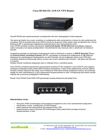 Cisco RV042-EU 2xWAN VPN Router Cisco® RV042 jest zaawansowanym rozwiązaniem dla sieci obsługującymi wiele połączeń. Tak samo jak każdy inny router umożliwia on podłączenie wielu komputerów w biurze do sieci publicznej lub prywatnej. Fakt że posiada dwa porty WAN oznacza że drugi port może zostać użyty do łączenia się z innym dostawcą ISP co gwarantuje zwiększenie przepustowości oraz równoważenie ruchu. Cisco RV042 posiada również wbudowane 4 porty full-duplex 10/100 ethernet pozwalające połączyć cztery komputery lub więcej przełączników i koncentratorów aby stworzyć sieć w zależności od własnych potrzeb. Urządzenie pozwala na stworzenie szyfrowanych tuneli w Internecie w oparciu o VPN IP Security (IPsec) lub Point-to-Point Tunneling Protocol (PPTP), pozwalając na bezpieczne podłączenie do 50 zdalnych lokalizacji lub podróżujących użytkowników do sieci firmowej. Są oni podłączeni przez tunel VPN który umożliwia bezpieczną transmisje plików, poczty oraz innych zasobów sieci intranet – tak jakby byli fizycznie w budynku. Istnieje również możliwość połączenia sieci w oddziale firmy z centralną siecią. Cisco RV042 umożliwia dynamiczne przyznawanie adresów IP dla urządzeń w sieci (DHCP) oraz potężne narzędzie analizujące każdy pakiet (SPI) broniące komputerów w sieci przed większością znanych ataków. Posiada również wsparcie dla usługi Cisco ProtectLink Web która blokuje podejrzane witryny raz kontroluje dostęp do stron internetowych w celu zapewnienia bezpieczeństwa w sieci. Konfiguracja jest bardzo prosta i odbywa się za pomocą przeglądarki internetowej. Router Cisco RV042 Dual WAN VPN gwarantuje wysoką elastyczną dla twojej firmy. Najważniejsze cechy: • • • • dwa porty WAN umożliwiające równoważenie obciążenia ruchu oraz niezawodność połączenia wbudowane 4 porty przełącznika 10/100 Ethernet pełne wsparcie dla maksymalnie 50 połączeń IPsec VPN zaawansowana zapora sieciowa SPI kontrolująca każdy pakiet która pomaga utrzymać bezpieczeństwo w sieci ul. Wiertnicza 129, 02-952 Warszawa, tel. 22 6517242, fax 22 6517246 http://www.meditronik.com.pl e-mail: [email protected] [email protected] Najważniejsze funkcje: • • • • • • • • • • zapora sieciowa SPI zapewniająca najwyższy poziom bezpieczeństwa dwa porty WAN umożliwiające równoważenie ruchu internetowego 4 porty przełącznika 10/100 wspierające automatyczne dopasowywanie się do medium (MDI oraz MDI-X) oraz przepustowość do 200Mbps na port dynamiczne analizowanie adresów URL dzięki usłudze Cisco ProtectLink Web (opcjonalne) pełne wsparcie dla IPSec VPN używając standardów Data Encryption Standard (DES), Triple DES (3DES) oraz Advanced Encryption Standard (AES) wsparcie dla algorytmów MD5 oraz SHA pozwala na jednoczenie otworzeni do 50 tuneli IPsec oraz do 5 tuneli PPTP VPN zarządzanie przez przeglądarkę internetową, SNMP oraz kreatory konfiguracji dla łatwej konfiguracji zarządzanie przepustowością dzięki usłudze QoS wsparcie do 50 użytkowników QuickVPN Specyfikacja • • • • • • • • • • • • • • • • • • • • • • • • • • • • • • • Standardy IEEE 802.3, 802.3u Porty: • Cztery porty 10/100 RJ-45, • Jeden port Internetowy 10/100 RJ-45 • Jeden port DMZ/Internet 10/100 RJ-45 Przyciski: Reset Typ kabli: Nieekranowana skrętka (UTP) kategoria 5. Diody: System, DIAG, DMZ/Internet, DMZ Mode, od 1 do 4. Wydajność • Przepustowość (NAT) 100 Mbps • Przepustowość IPSec 59 Mbps Zapora sieciowa: Zapora SPI Reguły dostępu: Do 50 wpisów Przekazywanie pakietów: Do 30 wpisów Zdarzenia na portach: Do 30 wpisów Filtrowanie URL Statyczne listy według domen lub słów kluczowych(dołączone), dynamiczne filtrowanie przez usługę Cisco ProtectLink Web (opcjonalne) Dwa porty WAN Mogą być skonfigurowane jako zapasowy Smartlink lub do równoważenia ruchu Protocol blinding: Protokoły mogą być przypisane do określonych portów WAN DHCP: Serwer DHCP, Klient DHCP DNS: Proxy DNS, Dynamic DNS (DynDNS, 3322, PeanutHull) NAT: Many-to-one, one-to-one DMZ: DMZ port, DMZ host Routing: Statyczny oraz z wykorzystaniem Routing Information Protocol (RIP) w wersji 1 i 2 Web-based HTTPS SNMP: Wsparcie dla SNMP w wersji 1 i 2c Logowanie: Syslog, powiadomienia na email QoS Port-based QoS Konfigurowane na port Service-based QoS Wspiera kontrole przepustowości oraz priorytetu Rate control Prędkość pobierania/ściągania może być ustawiona w zależności od usługi Piorytet Każda usługa może być przypisana do jednego z trzech poziomów priorytetu VPN IPsec Do 50 tuneli IPsec do połączeń między oddziałami firm QuickVPN 50 zdalnych połączeń QuickVPN PPTP Wbudowany serwer PPTP wspierający do 5 połączeń PPTP Szyfrowanie DES, 3DES, AES-128, AES-192, AES-256 ul. Wiertnicza 129, 02-952 Warszawa, tel. 22 6517242, fax 22 6517246 http://www.meditronik.com.pl e-mail: [email protected] [email protected] • • • • • • • • • • • Autoryzacja MD5, SHA1 IPsec NAT Traversal (NAT-T) Wsparcie dla tuneli gateway-gateway i client-gateway VPN pass-through PPTP, Layer 2 Tunnelling Protocol (L2TP), IPsec Wymiary 130 x 38.5 x 200 mm Waga 0.5755 kg Zasilanie 12V 1A Certyfikaty FCC Class B, CE Class B, cUL Temperatura pracy od 0°C do 40°C Temperatura przechowywania od 0°C do 70°C Wilgotność pracy od 10% do 85%, bez kondensacji Wilgotność przechowywania od 5% do 90%, bez kondensacji Minimalne wymagania • • • szerokopasmowe połączenie do sieci Internet. karta sieciowa obsługująca Ethernet oraz TCP/IP zainstalowane na komputerze. konfiguracja przez przeglądarkę internetową: włączone Java/ciasteczka/SSL Zawartość opakowania: zasilacz AC do montażu na ścianie, płyta CD z instrukcją obsługi w formacie PDF, kabel Ethernet, instrukcja szybkiej instalacji. ul. Wiertnicza 129, 02-952 Warszawa, tel. 