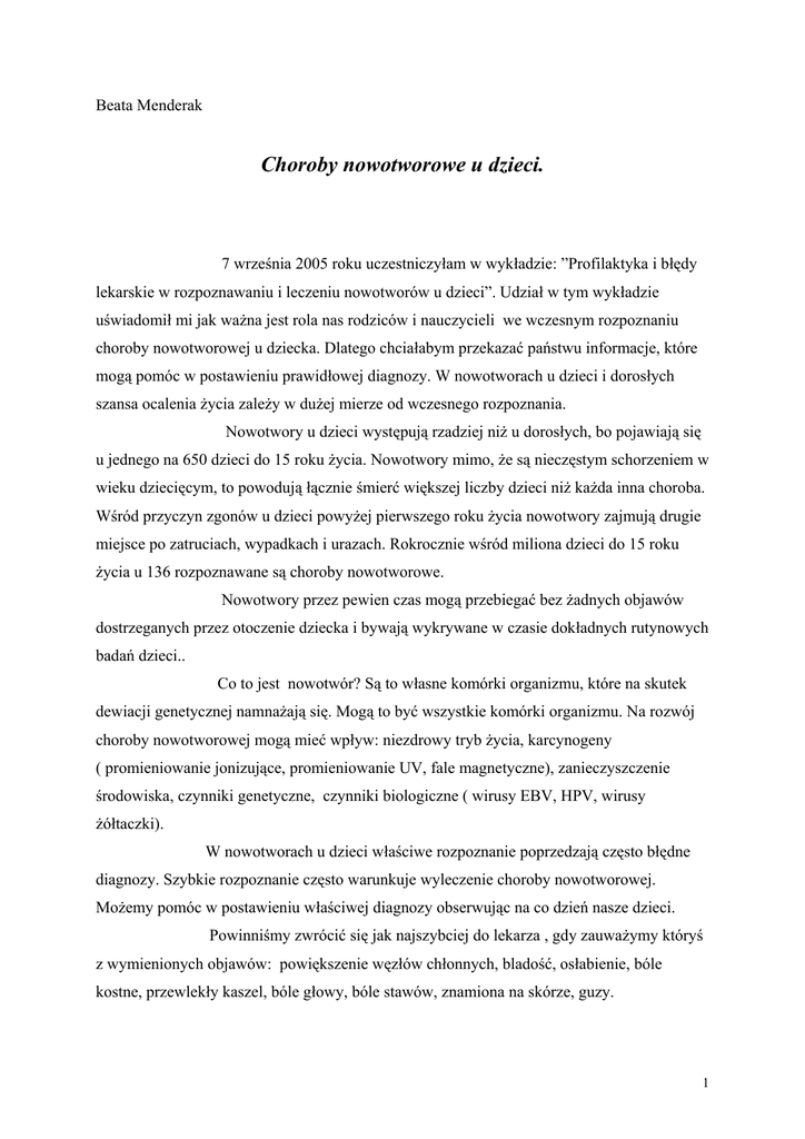 Beata Menderak Choroby nowotworowe u dzieci. 7 września 2005 roku uczestniczyłam w wykładzie: ”Profilaktyka i błędy lekarskie w rozpoznawaniu i leczeniu nowotworów u dzieci”. Udział w tym wykładzie uświadomił mi jak ważna jest rola nas rodziców i nauczycieli we wczesnym rozpoznaniu choroby nowotworowej u dziecka. Dlatego chciałabym przekazać państwu informacje, które mogą pomóc w postawieniu prawidłowej diagnozy. W nowotworach u dzieci i dorosłych szansa ocalenia życia zależy w dużej mierze od wczesnego rozpoznania. Nowotwory u dzieci występują rzadziej niż u dorosłych, bo pojawiają się u jednego na 650 dzieci do 15 roku życia. Nowotwory mimo, że są nieczęstym schorzeniem w wieku dziecięcym, to powodują łącznie śmierć większej liczby dzieci niż każda inna choroba. Wśród przyczyn zgonów u dzieci powyżej pierwszego roku życia nowotwory zajmują drugie miejsce po zatruciach, wypadkach i urazach. Rokrocznie wśród miliona dzieci do 15 roku życia u 136 rozpoznawane są choroby nowotworowe. Nowotwory przez pewien czas mogą przebiegać bez żadnych objawów dostrzeganych przez otoczenie dziecka i bywają wykrywane w czasie dokładnych rutynowych badań dzieci.. Co to jest nowotwór? Są to własne komórki organizmu, które na skutek dewiacji genetycznej namnażają się. Mogą to być wszystkie komórki organizmu. Na rozwój choroby nowotworowej mogą mieć wpływ: niezdrowy tryb życia, karcynogeny ( promieniowanie jonizujące, promieniowanie UV, fale magnetyczne), zanieczyszczenie środowiska, czynniki genetyczne, czynniki biologiczne ( wirusy EBV, HPV, wirusy żółtaczki). W nowotworach u dzieci właściwe rozpoznanie poprzedzają często błędne diagnozy. Szybkie rozpoznanie często warunkuje wyleczenie choroby nowotworowej. Możemy pomóc w postawieniu właściwej diagnozy obserwując na co dzień nasze dzieci. Powinniśmy zwrócić się jak najszybciej do lekarza , gdy zauważymy któryś z wymienionych objawów: powiększenie węzłów chłonnych, bladość, osłabienie, bóle kostne, przewlekły kaszel, bóle głowy, bóle stawów, znamiona na skórze, guzy. 1 Białaczki stanowią grupę chorób nowotworowych o nieznanej przyczynie, które odznaczają się nieprawidłową proliferacją i dojrzewaniem komórek krwi. Komórki białaczkowe rozrastając się, niszczą prawidłowe utkanie szpikowe i naciekają tkanki i narządy całego organizmu. Białaczki stanowią najczęstszy nowotwór u dzieci. Wśród miliona dzieci do 15 roku życia występuje około 40 zachorowań na białaczki. Najczęstsze obserwowane objawy to: powiększenie węzłów chłonnych, powiększenie wątroby, powiększenie śledziony, niedokrwistość, małopłytkowość, wybroczyny, wysypka na twarzy. Powiększenie węzłów chłonnych nie musi być objawem choroby nowotworowej. Jest to częsty objaw u dzieci występuje m. in. w przebiegu różyczki, mononukleozy zakaźnej, zapalenia ucha wewnętrznego, zapalenia gardła, zapalenia migdałków, gruźlicy, toksoplazmozy. Stwierdzenie powiększenia węzłów chłonnych stanowi przede wszystkim wskazanie do dokładnego badania dziecka. Duże znaczenie mają badania laboratoryjne. Najważniejsze badanie laboratoryjne to zmierzające do wykluczenia lub rozpoznania białaczki. Służy temu badanie morfologii, obrazu krwi i płytek. Upowszechnienie tych badań przyczyniło się do szybszego rozpoznawania białaczek. To badanie( jak każde przedszpitalne) stanowi jedynie podstawę do podejrzenia białaczki, której rozpoznanie wymaga zwłaszcza oceny mielogramu. Wśród metod obrazowania rosnące znaczenie ma ultrasonografia, a w wykrywaniu guzów (szczególnie w klatce piersiowej) użyteczne są nadal badania radiologiczne. Tomografia komputerowa stanowi istotny postęp w rozpoznawaniu guzów mózgu. Biorąc pod uwagę częstotliwość występowania u dzieci drugie miejsce po białaczkach zajmują nowotwory ośrodkowego układu nerwowego. Nowotwory mózgu występują u dzieci w każdym wieku, najczęściej jednak między 5 a 10 rokiem życia. Rokrocznie wśród miliona dzieci do 15 roku życia występuje około 24 zachorowań na nowotwory ośrodkowego układu nerwowego. Objawy tych guzów zależą od umiejscowienia, budowy histologicznej oraz wieku dziecka. Większość guzów mózgu u dzieci( ok.60%) rozwija się w tylnej jamie czaszkowej. Do najczęstszych objawów należą : bóle głowy- zwykle nasilone , najczęściej rano( rozpoznawane jako spowodowane zapaleniem zatok przynosowych lub migreną), wymioty- przede wszystkim rano (mogą błędnie sugerować, że przyczyna jest psychosomatyczna-lęk przed szkołą), zaburzenia chodu, problemy z utrzymaniem równowagi, niezręczność, gwałtowność ruchów, objawy psychiczne( spowolnienie procesów myślowych, zaburzenia pamięci, senność), podwójne widzenie, drgawki. Wzmożone ciśnienie 2 śródczaszkowe, zaburzenia chodu i zmiany psychiczne mogą mieć również inne przyczyny niż choroba nowotworowa np. zatrucie ołowiem, przedawkowanie witaminy A lub D, leki np. tetracyklina lub kortykoidy. Badania takie jak EEG, RTG czaszki, badanie płynu mózgowo-rdzeniowego są pomocne w rozpoznawaniu. Najdokładniejszy sposób wykrywania guzów mózgu stanowi osiowa tomografia komputerowa. Guzy lite szyi i twarzy zasługują na szczególną uwagę ze względu na częstość występowania i niewczesne rozpoznanie pogarszające rozpoznanie . Objawy guzów szyi i twarzy u dzieci nazywanych nowotworami otolaryngologicznymi nasuwają często przez długi czas błędne rozpoznania przewlekłych zakażeń . Możliwość nowotworu jest często uwzględniana dopiero wówczas , gdy guzy są duże i zniekształcają dzieci. Możemy wtedy zaobserwować wytrzeszcz gałek ocznych, narastające utrudnienie łykania i oddychania, podwójne widzenie, obrzmienie policzka lub podniebienia z owrzodzeniem, czasami szczękościsk. Nowotwory złośliwe kości u dzieci nie są zbyt częste, na