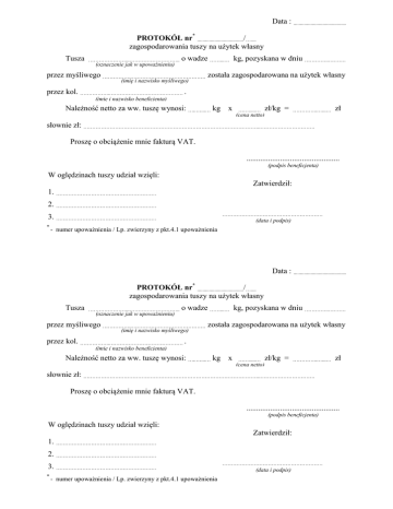 Data : ........................................ PROTOKÓŁ nr* .................................../….... zagospodarowania tuszy na użytek własny Tusza …………………...……………………….. (oznaczenie jak w upoważnieniu) o wadze ……...… kg, pozyskana w dniu …………..………. przez myśliwego ……………..…………………………………… została zagospodarowana na użytek własny (imię i nazwisko myśliwego) przez kol. ……………..…………………………………… . (imię i nazwisko beneficjenta) Należność netto za ww. tuszę wynosi: …..…...… kg x …….....… zł/kg = …………..…...… zł (cena netto) słownie zł: ………………………………………………………………………………………..…………………………. Proszę o obciążenie mnie fakturą VAT. ............................................... (podpis beneficjenta) W oględzinach tuszy udział wzięli: Zatwierdził: 1. ………………………………………………… 2. ………………………………………………… ………………………………………………… 3. ………………………………………………… * (data i podpis) - numer upoważnienia / Lp. zwierzyny z pkt.4.1 upoważnienia Data : ........................................ PROTOKÓŁ nr* .................................../….... zagospodarowania tuszy na użytek własny Tusza …………………...……………………….. (oznaczenie jak w upoważnieniu) o wadze ……...… kg, pozyskana w dniu …………..………. przez myśliwego ……………..…………………………………… została zagospodarowana na użytek własny (imię i nazwisko myśliwego) przez kol. ……………..…………………………………… . (imię i nazwisko beneficjenta) Należność netto za ww. tuszę wynosi: …..…...… kg x …….....… zł/kg = …………..…...… zł (cena netto) słownie zł: ………………………………………………………………………………………..…………………………. Proszę o obciążenie mnie fakturą VAT. ............................................... (podpis beneficjenta) W oględzinach tuszy udział wzięli: Zatwierdził: 1. ………………………………………………… 2. ………………………………………………… 3. ………………………………………………… * - numer upoważnienia / Lp. zwierzyny z pkt.4.1 upoważnienia ………………………………………………… (data i podpis)
