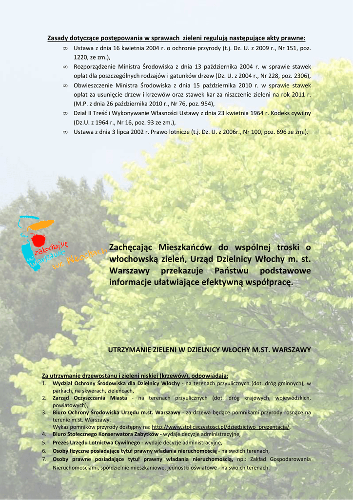 Zasady dotyczące postępowania w sprawach zieleni regulują następujące akty prawne: • • • • • Ustawa z dnia 16 kwietnia 2004 r. o ochronie przyrody (t.j. Dz. U. z 2009 r., Nr 151, poz. 1220, ze zm.), Rozporządzenie Ministra Środowiska z dnia 13 października 2004 r. w sprawie stawek opłat dla poszczególnych rodzajów i gatunków drzew (Dz. U. z 2004 r., Nr 228, poz. 2306), Obwieszczenie Ministra Środowiska z dnia 15 października 2010 r. w sprawie stawek opłat za usunięcie drzew i krzewów oraz stawek kar za niszczenie zieleni na rok 2011 r. (M.P. z dnia 26 października 2010 r., Nr 76, poz. 954), Dział II Treść i Wykonywanie Własności Ustawy z dnia 23 kwietnia 1964 r. Kodeks cywilny (Dz.U. z 1964 r., Nr 16, poz. 93 ze zm.), Ustawa z dnia 3 lipca 2002 r. Prawo lotnicze (t.j. Dz. U. z 2006r., Nr 100, poz. 696 ze zm.). Zachęcając Mieszkańców do wspólnej troski o włochowską zieleń, Urząd Dzielnicy Włochy m. st. Warszawy przekazuje Państwu podstawowe informacje ułatwiające efektywną współpracę. UTRZYMANIE ZIELENI W DZIELNICY WŁOCHY M.ST. WARSZAWY Za utrzymanie drzewostanu i zieleni niskiej (krzewów), odpowiadają: 1. 2. 3. 4. 5. 6. 7. Wydział Ochrony Środowiska dla Dzielnicy Włochy - na terenach przyulicznych (dot. dróg gminnych), w parkach, na skwerach, zieleńcach, Zarząd Oczyszczania Miasta - na terenach przyulicznych (dot. dróg krajowych, wojewódzkich, powiatowych), Biuro Ochrony Środowiska Urzędu m.st. Warszawy - za drzewa będące pomnikami przyrody rosnące na terenie m.st. Warszawy. Wykaz pomników przyrody dostępny na: http://www.stolicaczystosci.pl/dziedzictwo_prezentacja/, Biuro Stołecznego Konserwatora Zabytków - wydaje decyzje administracyjne, Prezes Urzędu Lotnictwa Cywilnego - wydaje decyzje administracyjne, Osoby fizyczne posiadające tytuł prawny władania nieruchomością - na swoich terenach, Osoby prawne posiadające tytuł prawny władania nieruchomością, np.: Zakład Gospodarowania Nieruchomościami, spółdzielnie mieszkaniowe, jednostki oświatowe - na swoich terenach. 1. Wydział Ochrony Środowiska dla Dzielnicy Włochy Siedziba: al. Krakowska 257, 02-133 Warszawa. Godziny urzędowania: poniedziałek - piątek, 8.00 - 16.00. Tel. kont.: 22 44 34 221, 22 44 34 219, 22 44 34 224, 22 44 34 223 Naczelnik: Iwona Bielawska, e-mail: [email protected] Główny Specjalista: Paweł Gnieszawa - Słodkowski, e-mail: [email protected] Inspektor: Aleksandra Grzywaczewska, e-mail: [email protected] Działania Wydziału Ochrony Środowiska w zakresie zieleni: • • • przeprowadza pielęgnację, cięcia techniczne, nowe nasadzenia oraz usuwanie drzew martwych i zagrażających bezpieczeństwu za pomocą specjalistycznej firmy ogrodniczej, wydaje decyzje administracyjne dot. wyrażenia zgody na usunięcie drzew lub krzewów osobom fizycznym lub podmiotom gospodarczym, prowadzi administracyjne postępowania karne w przypadku ujawnienia nielegalnej wycinki lub zniszczenia drzew, krzewów, terenów zieleni. 2. Zarząd Oczyszczania Miasta INFOLINIA CZYSTOŚĆ 0 800 800 117 Siedziba: Al. Jerozolimskie 11/19, 00-508 Warszawa. Godziny urzędowania: poniedziałek - piątek, 7.30 - 15.30. Tel. kont.: 22 522 40 85, 22 522 40 60, 22 522 40 61, 22 522 40 62 e-mail: [email protected], [email protected] Działania Zarządu Oczyszczania Miasta w zakresie zieleni: • • • przeprowadza pielęgnację, cięcia techniczne, nowe nasadzenia oraz usuwanie drzew martwych i zagrażających bezpieczeństwu za pomocą specjalistycznej firmy ogrodniczej, przyjmuje wszelkie interwencje związane z drzewostanem i zielenią niską rosnącymi w pasach zieleni przyulicznej wzdłuż dróg krajowych, wojewódzkich i powiatowych na terenie m. st. Warszawy, przyjmuje wnioski dot. usunięcia drzew lub krzewów z terenów przyulicznych dróg krajowych, wojewódzkich i powiatowych w obrębie m. st. Warszawy. 3. Biuro Ochrony Środowiska Siedziba: pl. Starynkiewicza 7/9, 02-015 Warszawa. Godziny urzędowania: poniedziałek - piątek, 8.00 - 16.00 Tel. kont.: 22 257 92 65, 22 257 92 64, 22 257 92 60, 22 257 92 43 Naczelnik Wydziału Ochrony Systemu Przyrodniczego Miasta: Iwona Jędrychowska – Klimczak e-mail: [email protected] Działania Biura Ochrony Środowiska w zakresie zieleni: • • przeprowadza pielęgnację oraz usuwanie martwych drzew, będących pomnikami przyrody, na terenach m.st. Warszawy, prowadzi postępowania administracyjne w sprawie ustanowienia lub zniesienia statusu pomnika przyrody. 4. Biuro Stołecznego Konserwatora Zabytków Siedziba: ul. Nowy Świat 18/20, 00-373 Warszawa. Godziny urzędowania: poniedziałek - piątek: 8.00 - 16.00. Tel. kont.: 22 443 36 77, 22 443 36 40/41 e-mail: [email protected] Działania Stołecznego Konserwatora Zabytków w zakresie zieleni: • wydaje decyzje administracyjne dot. wyrażenia zgody na usunięcie drzew lub krzewów z terenów wpisanych do rejestru zabytków 5. Prezes Urzędu Lotnictwa Cywilnego Siedziba: ul. M. Flisa 2, 02-247 Warszawa. Godziny urzędowania: poniedziałek: 10.00 - 18.00, wtorek - piątek, 8.15 - 16.00 . Tel. kont.: 22 520 74 35, 22 520 74 37, e-mail: [email protected] Działania Prezesa Urzędu Lotnictwa Cywilnego w zakresie zieleni: • wydaje decyzje administracyjne dot. obowiązku usunięcia drzew lub krzewów stanowiących przeszkody lotnicze