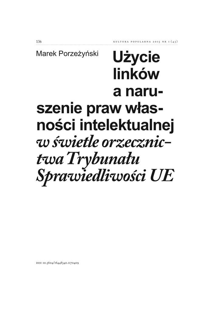 136 kultura popularna 2015 nr 1 (43) 8Ī\FLH OLQNyZ DQDUX V]HQLHSUDZZáDV QRĞFLLQWHOHNWXDOQHM 0DUHN3RU]HĪ\ĔVNL w świetle orzecznictwa Trybunału Sprawiedliwości UE DOI: 10.5604/16448340.1170409 M a r e k P o r z e ż y ń s k i U ż y c i e l i n k ó w a n a r u s z e n i e p r aw w ł a s n o ś c i i n t e l e k t u a l n e j :VWĊS Problem linków był analizowany przez sądy krajowe oraz międzynarodowe wielokrotnie i w różnych kontekstach, co pokazuje złożoność problemu. Akty prawodawstwa unijnego, które w swoich założeniach mają harmonizować przepisy, wprowadzają nowe kwestie wymagające rozstrzygnięcia. Problematyka naruszenia prawa poprzez zamieszczenie linków jest dodatkowo komplikowana przez znaczną skalę tego zjawiska. Nie dysponujemy żadnymi statystykami dotyczącymi liczby linków w internecie, gdyż cała sieć się na nich opiera. Można intuicyjnie określić ogrom zjawiska, którego dynamika jest dodatkowo zwiększana przez powstawanie nowych stron, blogów, a w szczególności portali społecznościowych. Jeszcze istotniejsza mogłaby okazać się informacja dotycząca odsetka treści mogących naruszać prawa własności intelektualnej pośród wszystkich linkowanych. Przedmiotowa tematyka może mieć doniosłe znaczenie w szczególności dla branży kreatywnej, w tym filmowej, która nader często posługuje się różnego rodzaju linkami w celu zilustrowania poszczególnych opinii lub ich prezentacji. Z tego powodu mimo prawniczo-technicznego charakteru niniejszej publikacji warto zapoznać się z najważniejszymi przepisami prawa dotyczącymi tej tematyki oraz dorobkiem orzeczniczym, dzięki któremu mamy coraz większą pewność co do ich stosowania. 3RGVWDZRZH]DJDGQLHQLD WHFKQLF]QHLSUDZQH Mimo że intuicyjnie wiemy, czym są linki, okazuje się, że nie jest to oczywiste. Co więcej, szeroka kategoria linków nie jest jednorodna i poszczególne rodzaje, które zostaną wskazane, różnią się między sobą i nie mogą być traktowane jednakowo, szczególnie pod względem prawnym. Za Słownikiem języka polskiego PWN link „to element dokumentu elektronicznego łączący jego elementy i odsyłający do innego dokumentu” (SJP). Zgodnie z tą definicją link pełni jedynie funkcję techniczną – łączy dwa miejsc wewnątrz jednego pliku lub strony internetowej bądź odsyła na zewnątrz. Ponadto wyróżnia się hiperłącza, których jednak ze względu na ograniczony zakres niniejszej publikacji nie będziemy rozróżniać. W odniesieniu do całej kategorii używam określenia link. Myśląc o linkach, w pierwszej kolejności rozpatrujemy linki proste – umieszczenie na stronie internetowej adresu innej strony głównej. Podobne do linków prostych są linki głębokie, które zasadniczo również polegają na umieszczeniu adresu internetowego strony w charakterze linku, ale ich budowa jest znacznie bardziej skomplikowana. Linki głębokie nie prowadzą do strony głównej danego podmiotu tylko do określonej podstrony, stąd ich nazwa. Oprócz dwóch wskazanych powyżej standardowych kategorii linków mamy również do czynienia z bardziej skomplikowanymi odmianami, które najczęściej nie istnieją w naszej świadomości jako linki. Pierwsza to framed links (linki w ramkach). Wyświetlają się one na danej stronie internetowej jako dodatkowa ramka obejmująca treść strony, do której prowadzi odesłanie. Jedną z ich najbardziej dyskusyjnych kategorii są embedded links (odesłania wbudowane). Przybierają postać jednego z elementów strony internetowej, na której są prezentowane. W takiej postaci prezentowane są najczęściej materiały 137 0DUHN3RU]HĪ\ĔVNLAsystent w Katedrze 3UDZD,QIRUPDW\F]QHJR na WPiA Uniwersytetu .DUG\QDáD6WHIDQD :\V]\ĔVNLHJRDEVROwent WPiA UniwersyWHWX:DUV]DZVNLHJR GRNWRUDQWVSHFMDOL]XMąF\VLĊZSUDZQ\FK DVSHNWDFKQRZ\FK WHFKQRORJLLRFKURQ\ ZáDVQRĞFLLQWHOHNWXDOQHM PHGLyZLUHNODP\ 138 kultura popularna 2015 nr 1 (43) z serwisów oferujących możliwość zamieszczenia materiałów audialnych lub audiowizualnych na innych stronach takich jak YouTube (Zakres prawa do publicznego udostępniania, 2014). Trzeba pamiętać, że głównym aktem prawodawstwa, który ma zastosowanie do problematyki zgodności z prawem zamieszczonych odesłań jest Dyrektywa Parlamentu Europejskiego i Rady 2001/29/WE. Głównym zadaniem Dyrektywy, co znalazło wyraz w jej nazwie, miało być harmonizowanie prawa w pewnych obszarach społeczeństwa informacyjnego, co w konsekwencji ma zwiększyć stopień pewności prawa. Harmonizuje ona prawo autorskie, przede wszystkim w zakresie powszechnego odtwarzania utworów, między innymi poprzez przyznanie wyraźnej ochrony podmiotom praw w odniesieniu do wykorzystania ich dóbr w ramach różnego rodzaju usług multimedialnych (Prawo autorskie w Społeczeństwie Informacyjnym, 2008). Oznacza to, że wskazany akt ma za zadanie objąć ochroną prawną oprócz tradycyjnych form eksploatacji również komunikację elektroniczną, w tym internet, co dla przedmiotu niniejszego artykułu będzie miało największe znaczenie. 'RW\FKF]DVRZHUR]VWU]\JQLĊFLD Najważniejszą kwestią, która okazała się bardzo problematyczna i doczekała się wielu orzeczeń sądów, było rozumienie pojęcia „publicznego udostępniania utworów”. Art. 3 ust. 1 Dyrektywy wskazuje na akt publicznego udostępniania utworów, nie definiując tej kategorii. Problemy te musiały być następnie rozstrzygane w licznych wyrokach, w szczególności Trybunału Sprawiedliwości Unii Europejskiej 1. Mimo tej istotnej ułomności należy uznać, że harmonizacja w obszarze kategorii publicznego udostępniania była posunięciem we właściwym kierunku. Do momentu wejścia w życie wskazanego aktu prawnego publiczne udostępnianie dotyczyło jedynie konkretnych obszarów prawnych i było regulowane przez akty prawne stosowne dla kategorii, do jakich się odnoszą, na przykład do baz danych (Zakres prawa do publicznego u