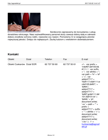 http://agroefekt.pl 2017-03-02 14:41:47 Serdecznie zapraszamy do korzystania z usług doradztwa rolniczego. Nasz wykwalifikowany personel służy zawsze dobrą radą w zakresie doboru środków ochrony roślin, nawozów czy nasion. Pomożemy Ci w osiągnięciu plonów najwyższej jakości. Dołącz do najlepszych. Zaufaj ludziom z wieloletnim doświadczeniem. Kontakt Obiekt Dział Obiekt Czekanów Dział SOR Telefon Fax E-mail 62 737 50 60 62 737 50 61 <!-- var prefix = 'mailt& #111;:'; var suffix = ''; var attribs = ''; var path = 'hr' + 'ef' + '='; var addy47717 = 'hurtow nia' + '@'; addy47717 = addy47717 + 'agro&# 101;fekt' + '.' + 'pl'; document.write( '<a ' + path + ''' + prefix + addy47717 + suffix + ''' + attribs + '>' ); document.write( addy47717 ); document.write( '</a>' ); //--> hurtownia@agroef ekt.pl Strona 1/3 http://agroefekt.pl 2017-03-02 14:41:48 <!-document.write( '<span style='display: none;'>' ); //--> Adres poczty elektronicznej jest chroniony przed robotami spamującymi. W przeglądarce musi być włączona obsługa JavaScript, żeby go zobaczyć. <!-document.write( '</' ); document.write( 'span>' ); //--> Obiekt Syców Dział SOR 62 786 84 10 Strona 2/3 - <!-- var prefix = 'mailt& #111;:'; var suffix = ''; var attribs = ''; var path = 'hr' + 'ef' + '='; var addy72963 = 'sor' + '@'; addy72963 = addy72963 + 'agro&# 101;fekt' + '.' + 'pl'; document.write( '<a ' + path + ''' + prefix + addy72963 + suffix + ''' + attribs + '>' ); document.write( addy72963 ); document.write( '</a>' ); //--> [email protected] <!-- http://agroefekt.pl 2017-03-02 14:41:48 document.write( '<span style='display: none;'>' ); //--> Adres poczty elektronicznej jest chroniony przed robotami spamującymi. W przeglądarce musi być włączona obsługa JavaScript, żeby go zobaczyć. <!-document.write( '</' ); document.write( 'span>' ); //--> Strona 3/3