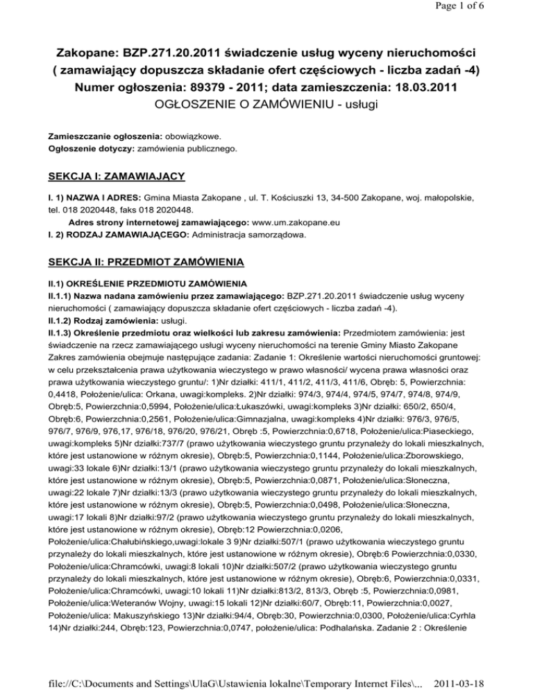 Page 1 of 6 Zakopane: BZP.271.20.2011 świadczenie usług wyceny nieruchomości ( zamawiający dopuszcza składanie ofert częściowych - liczba zadań -4) Numer ogłoszenia: 89379 - 2011; data zamieszczenia: 18.03.2011 OGŁOSZENIE O ZAMÓWIENIU - usługi Zamieszczanie ogłoszenia: obowiązkowe. Ogłoszenie dotyczy: zamówienia publicznego. SEKCJA I: ZAMAWIAJĄCY I. 1) NAZWA I ADRES: Gmina Miasta Zakopane , ul. T. Kościuszki 13, 34-500 Zakopane, woj. małopolskie, tel. 018 2020448, faks 018 2020448. Adres strony internetowej zamawiającego: www.um.zakopane.eu I. 2) RODZAJ ZAMAWIAJĄCEGO: Administracja samorządowa. SEKCJA II: PRZEDMIOT ZAMÓWIENIA II.1) OKREŚLENIE PRZEDMIOTU ZAMÓWIENIA II.1.1) Nazwa nadana zamówieniu przez zamawiającego: BZP.271.20.2011 świadczenie usług wyceny nieruchomości ( zamawiający dopuszcza składanie ofert częściowych - liczba zadań -4). II.1.2) Rodzaj zamówienia: usługi. II.1.3) Określenie przedmiotu oraz wielkości lub zakresu zamówienia: Przedmiotem zamówienia: jest świadczenie na rzecz zamawiającego usługi wyceny nieruchomości na terenie Gminy Miasto Zakopane Zakres zamówienia obejmuje następujące zadania: Zadanie 1: Określenie wartości nieruchomości gruntowej: w celu przekształcenia prawa uŜytkowania wieczystego w prawo własności/ wycena prawa własności oraz prawa uŜytkowania wieczystego gruntu/: 1)Nr działki: 411/1, 411/2, 411/3, 411/6, Obręb: 5, Powierzchnia: 0,4418, PołoŜenie/ulica: Orkana, uwagi:kompleks. 2)Nr działki: 974/3, 974/4, 974/5, 974/7, 974/8, 974/9, Obręb:5, Powierzchnia:0,5994, PołoŜenie/ulica:Łukaszówki, uwagi:kompleks 3)Nr działki: 650/2, 650/4, Obręb:6, Powierzchnia:0,2561, PołoŜenie/ulica:Gimnazjalna, uwagi:kompleks 4)Nr działki: 976/3, 976/5, 976/7, 976/9, 976,17, 976/18, 976/20, 976/21, Obręb :5, Powierzchnia:0,6718, PołoŜenie/ulica:Piaseckiego, uwagi:kompleks 5)Nr działki:737/7 (prawo uŜytkowania wieczystego gruntu przynaleŜy do lokali mieszkalnych, które jest ustanowione w róŜnym okresie), Obręb:5, Powierzchnia:0,1144, PołoŜenie/ulica:Zborowskiego, uwagi:33 lokale 6)Nr działki:13/1 (prawo uŜytkowania wieczystego gruntu przynaleŜy do lokali mieszkalnych, które jest ustanowione w róŜnym okresie), Obręb:5, Powierzchnia:0,0871, PołoŜenie/ulica:Słoneczna, uwagi:22 lokale 7)Nr działki:13/3 (prawo uŜytkowania wieczystego gruntu przynaleŜy do lokali mieszkalnych, które jest ustanowione w róŜnym okresie), Obręb:5, Powierzchnia:0,0498, PołoŜenie/ulica:Słoneczna, uwagi:17 lokali 8)Nr działki:97/2 (prawo uŜytkowania wieczystego gruntu przynaleŜy do lokali mieszkalnych, które jest ustanowione w róŜnym okresie), Obręb:12 Powierzchnia:0,0206, PołoŜenie/ulica:Chałubińskiego,uwagi:lokale 3 9)Nr działki:507/1 (prawo uŜytkowania wieczystego gruntu przynaleŜy do lokali mieszkalnych, które jest ustanowione w róŜnym okresie), Obręb:6 Powierzchnia:0,0330, PołoŜenie/ulica:Chramcówki, uwagi:8 lokali 10)Nr działki:507/2 (prawo uŜytkowania wieczystego gruntu przynaleŜy do lokali mieszkalnych, które jest ustanowione w róŜnym okresie), Obręb:6, Powierzchnia:0,0331, PołoŜenie/ulica:Chramcówki, uwagi:10 lokali 11)Nr działki:813/2, 813/3, Obręb :5, Powierzchnia:0,0981, PołoŜenie/ulica:Weteranów Wojny, uwagi:15 lokali 12)Nr działki:60/7, Obręb:11, Powierzchnia:0,0027, PołoŜenie/ulica: Makuszyńskiego 13)Nr działki:94/4, Obręb:30, Powierzchnia:0,0300, PołoŜenie/ulica:Cyrhla 14)Nr działki:244, Obręb:123, Powierzchnia:0,0747, połoŜenie/ulica: Podhalańska. Zadanie 2 : Określenie file://C:\Documents and Settings\UlaG\Ustawienia lokalne\Temporary Internet Files\... 2011-03-18 Page 2 of 6 wartości rynkowej projektowanej nieruchomości lokalowej: ilość 1 lokal 1)Nr projektowanej nieruchomości lokalowej: 4, Ulica/nr budynku: Chramcówki 1 d Zadanie 3: Określenie wartości nieruchomości celem: rozwiązania umowy uŜytkowania wieczystego 1)Nr działki:976/16, Obręb:5, Powierzchnia:0,1579, Działka niezabudowana-zajęta pod drogę 2)Nr działki:943/11, Obręb:8, Powierzchnia:0,0027, Działka niezabudowana 3)Nr działki:651/4, Obręb:6, Powierzchnia:0,0276, Działka niezabudowana Zadanie 4: Określenie wartości słuŜebności gruntowej przejazdu i przegonu oraz prowadzenia rur wodociągowych, ciepłowniczych, gazowych oraz przewodów elektrycznych i telefonicznych 1)Nr działki:83, 84/10, Obręb:12, Powierzchnia:0,2018, SłuŜebność ma być ustanowiona po istniejącej drodze. W oferowanych cenach winny być zawarte wszystkie elementy kosztów tj. sporządzenie wypisów oraz mapy ewidencyjne lub zasadnicze, badanie księgi wieczystej, wypis z planu zagospodarowania przestrzennego lub studium i inne. UWAGA!!! Wykonawca zobowiązany jest do zamieszczenia w operacie szacunkowym klauzuli o stwierdzeniu aktualnej wartości nieruchomości jednorazowo na wezwanie Zamawiającego. Wykonawca na świadczone usługi objęte poszczególnymi zadaniami udzieli gwarancji nie krótszej niŜ 12 miesięcy liczonej od daty odbioru zamówienia bez zastrzeŜeń.. II.1.4) Czy przewiduje się udzielenie zamówień uzupełniających: nie. II.1.5) Wspólny Słownik Zamówień (CPV): 70.00.00.00-1. II.1.6) Czy dopuszcza się złoŜenie oferty częściowej: tak, liczba części: 4. II.1.7) Czy dopuszcza się złoŜenie oferty wariantowej: nie. II.2) CZAS TRWANIA ZAMÓWIENIA LUB TERMIN WYKONANIA: Okres w dniach: 30. SEKCJA III: INFORMACJE O CHARAKTERZE PRAWNYM, EKONOMICZNYM, FINANSOWYM I TECHNICZNYM III.2) ZALICZKI Czy przewiduje się udzielenie zaliczek na poczet wykonania zamówienia: nie III.3) WARUNKI UDZIAŁU W POSTĘPOWANIU ORAZ OPIS SPOSOBU DOKONYWANIA OCENY SPEŁNIANIA TYCH WARUNKÓW III. 3.1) Uprawnienia do wykonywania określonej działalności lub czynności, jeŜeli przepisy prawa nakładają obowiązek ich posiadania Opis sposobu dokonywania oceny spełniania tego warunku Warunek zostanie uznany za spełniony jeŜeli wykonawca złoŜy stosowne oświadczenie