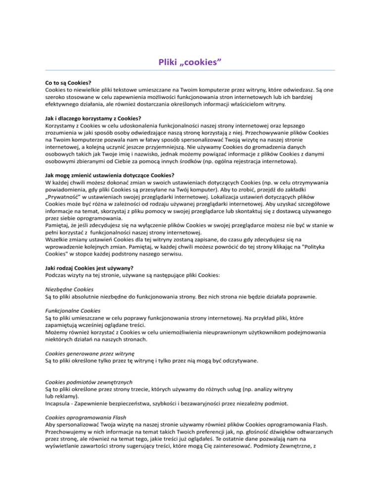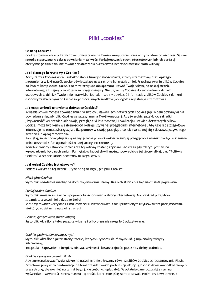 Pliki „cookies” Co to są Cookies? Cookies to niewielkie pliki tekstowe umieszczane na Twoim komputerze przez witryny, które odwiedzasz. Są one szeroko stosowane w celu zapewnienia możliwości funkcjonowania stron internetowych lub ich bardziej efektywnego działania, ale również dostarczania określonych informacji właścicielom witryny. Jak i dlaczego korzystamy z Cookies? Korzystamy z Cookies w celu udoskonalenia funkcjonalności naszej strony internetowej oraz lepszego zrozumienia w jaki sposób osoby odwiedzające naszą stronę korzystają z niej. Przechowywanie plików Cookies na Twoim komputerze pozwala nam w łatwy sposób spersonalizować Twoją wizytę na naszej stronie internetowej, a kolejną uczynić jeszcze przyjemniejszą. Nie używamy Cookies do gromadzenia danych osobowych takich jak Twoje imię i nazwisko, jednak możemy powiązać informacje z plików Cookies z danymi osobowymi zbieranymi od Ciebie za pomocą innych środków (np. ogólna rejestracja internetowa). Jak mogę zmienić ustawienia dotyczące Cookies? W każdej chwili możesz dokonać zmian w swoich ustawieniach dotyczących Cookies (np. w celu otrzymywania powiadomienia, gdy pliki Cookies są przesyłane na Twój komputer). Aby to zrobić, przejdź do zakładki „Prywatność” w ustawieniach swojej przeglądarki internetowej. Lokalizacja ustawień dotyczących plików Cookies może być różna w zależności od rodzaju używanej przeglądarki internetowej. Aby uzyskać szczegółowe informacje na temat, skorzystaj z pliku pomocy w swojej przeglądarce lub skontaktuj się z dostawcą używanego przez siebie oprogramowania. Pamiętaj, że jeśli zdecydujesz się na wyłączenie plików Cookies w swojej przeglądarce możesz nie być w stanie w pełni korzystać z funkcjonalności naszej strony internetowej. Wszelkie zmiany ustawień Cookies dla tej witryny zostaną zapisane, do czasu gdy zdecydujesz się na wprowadzenie kolejnych zmian. Pamiętaj, w każdej chwili możesz powrócić do tej strony klikając na "Polityka Cookies" w stopce każdej podstrony naszego serwisu. Jaki rodzaj Cookies jest używany? Podczas wizyty na tej stronie, używane są następujące pliki Cookies: Niezbędne Cookies Są to pliki absolutnie niezbędne do funkcjonowania strony. Bez nich strona nie będzie działała poprawnie. Funkcjonalne Cookies Są to pliki umieszczane w celu poprawy funkcjonowania strony internetowej. Na przykład pliki, które zapamiętują wcześniej oglądane treści. Możemy również korzystać z Cookies w celu uniemożliwienia nieuprawnionym użytkownikom podejmowania niektórych działań na naszych stronach. Cookies generowane przez witrynę Są to pliki określone tylko przez tę witrynę i tylko przez nią mogą być odczytywane. Cookies podmiotów zewnętrznych Są to pliki określone przez strony trzecie, których używamy do różnych usług (np. analizy witryny lub reklamy). Incapsula - Zapewnienie bezpieczeństwa, szybkości i bezawaryjności przez niezależny podmiot. Cookies oprogramowania Flash Aby spersonalizować Twoja wizytę na naszej stronie używamy również plików Cookies oprogramowania Flash. Przechowujemy w nich informacje na temat takich Twoich preferencji jak, np. głośność dźwięków odtwarzanych przez stronę, ale również na temat tego, jakie treści już oglądałeś. Te ostatnie dane pozwalają nam na wyświetlanie zawartości strony sugerujący treści, które mogą Cię zainteresować. Podmioty Zewnętrzne, z którymi współpracujemy, aby zapewnić działanie pewnych funkcji na naszych stronach korzystają z Cookies oprogramowania Flash do gromadzenia i przechowywania informacji nie zawierających danych osobowych. Flash Cookies różnią się od innych plików używanych na tej stronie z powodu ilości, rodzaju oraz sposobu, w jaki dane są przechowywane. Narzędzia zarządzania plikami Cookies w Twojej przeglądarce nie usuną Cookies oprogramowania Flash. Aby dowiedzieć się jak zarządzać prywatnością oraz ustawieniami przechowywania Cookies w oprogramowaniu Flash kliknij tutaj: http://www.macromedia.com/support/documentation/en/flashplayer/help/settings_manager.html#117118 Lista plików Cookies używanych na tej stronie Poniższe tabele kategoryzują i opisują różne pliki Cookies używane na tej stronie: I. Ze względu na niezbędność do realizacji usługi Rodzaj Niezbędne Opis są absolutnie niezbędne do prawidłowego funkcjonowania witryny lub funkcjonalności z których użytkownik chce skorzystać Funkcjonalne Są ważne dla działania serwisu: służą wzbogaceniu funkcjonalności serwisu, bez nich serwis będzie działał poprawnie, jednak nie będzie dostosowany do preferencji użytkownika, służą zapewnieniu wysokiego poziomu funkcjonalności serwisu, bez ustawień zapisanych w plikach cookies może obniżyć się poziom funkcjonalności witryny, ale nie powinna uniemożliwić zupełnego korzystania z niej, służą bardzo ważnym funkcjonalnościom serwisu, ich zablokowanie spowoduje, że wybrane funkcje nie będą działać prawidłowo. Biznesowe II. Umożliwiają realizację modelu biznesowego w oparciu o który udostępniona jest witryna, ich zablokowanie nie spowoduje niedostępności całości funkcjonalności serwisu ale może obniżyć poziom świadczenia usługi ze względu na brak możliwości realizacji przez właściciela witryny przychodów subsydiujących działanie serwisu. Do tej kategorii należą np. cookies reklamowe. Ze względu na czas przez jaki cookies będą umieszczone w urządzeniu końcowym użytkownika Rodzaj Opis Cookies tymczasowe(session cookies umieszczone na czas korzystania z przeglądarki (sesji), zostają wykasowane cookies) po jej zamknięciu Cookies stałe (persistent cookies) III. nie są kasowane po zamknięciu przeglądarki i pozostają w urządzeniu użytkownika na określony czas lub bez okresu ważności w zależności od ustawień właściciela witryny Ze względu na pochodzenie –