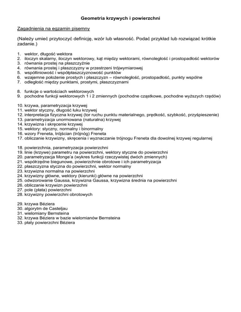 Geometria krzywych i powierzchni Zagadnienia na egzamin pisemny