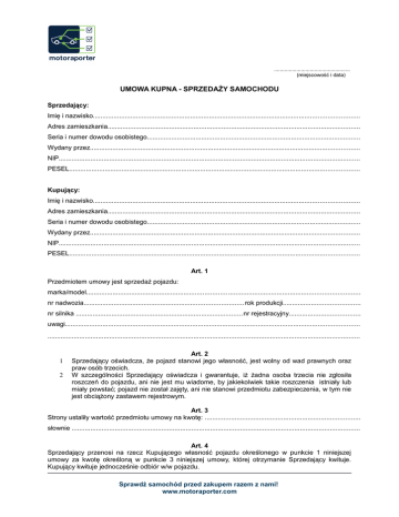 ................................................... (miejscowość i data) UMOWA KUPNA - SPRZEDAŻY SAMOCHODU Sprzedający: Imię i nazwisko.............................................................................................................................................. Adres zamieszkania....................................................................................................................................... Seria i numer dowodu osobistego.................................................................................................................. Wydany przez................................................................................................................................................ NIP................................................................................................................................................................. PESEL........................................................................................................................................................... Kupujący: Imię i nazwisko.............................................................................................................................................. Adres zamieszkania....................................................................................................................................... Seria i numer dowodu osobistego.................................................................................................................. Wydany przez................................................................................................................................................ NIP................................................................................................................................................................. PESEL........................................................................................................................................................... Art. 1 Przedmiotem umowy jest sprzedaż pojazdu: marka/model................................................................................................................................................. nr nadwozia.....................................................................................rok produkcji......................................... nr silnika ......................................................................................... nr rejestracyjny...................................... uwagi............................................................................................................................................................. ....................................................................................................................................................................... 1 2 Art. 2 Sprzedający oświadcza, że pojazd stanowi jego własność, jest wolny od wad prawnych oraz praw osób trzecich. W szczególności Sprzedający oświadcza i gwarantuje, iż żadna osoba trzecia nie zgłosiła roszczeń do pojazdu, ani nie jest mu wiadome, by jakiekolwiek takie roszczenia istniały lub miały powstać; pojazd nie został zajęty, ani nie stanowi przedmiotu zabezpieczenia, w tym nie jest obciążony zastawem rejestrowym. Art. 3 Strony ustaliły wartość przedmiotu umowy na kwotę: ................................................................................... słownie .......................................................................................................................................................... Art. 4 Sprzedający przenosi na rzecz Kupującego własność pojazdu określonego w punkcie 1 niniejszej umowy za kwotę określoną w punkcie 3 niniejszej umowy, której otrzymanie Sprzedający kwituje. Kupujący kwituje jednocześnie odbiór w/w pojazdu. Sprawdź samochód przed zakupem razem z nami! www.motoraporter.com 1 2 Art. 5 Kupujący oświadcza, że stan techniczny pojazdu jest mu znany. Zgodnie z oświadczeniem Sprzedającego pojazd jest w pełni sprawny i nadaje się do umówionego użytku, ponadto nie posiada żadnych wad ukrytych, a w szczególności uszkodzeń powypadkowych, nie stanowi też własności ani współwłasności tudzież przedmiotu zabezpieczenia innych osób. Art. 6 Strony ustaliły, że wszelkiego rodzaju koszty transakcji wynikające z realizacji ustaleń niniejszej umowy obciążają Sprzedawcę, przy czym zgodnie art. 4 pkt 1 ustawy o podatku od czynności cywilnoprawnych, koszty podatku od czynności cywilnoprawnej obciążają Kupującego. 1 2 1 2 3 Art. 7 W sprawach nie uregulowanych w niniejszej umowie zastosowanie mają obowiązujące w tym zakresie przepisy kodeksu cywilnego, a w przypadku gdy Kupujący jest konsumentem, przepisy ustawy o szczególnych warunkach sprzedaży konsumenckiej oraz o zmianie kodeksu cywilnego. W szczególności Sprzedawca ponosi odpowiedzialność z tytułu rękojmi za wady fizyczne i prawne pojazdu, z tym zastrzeżeniem że w przypadku gdy Kupujący jest konsumentem i nabywa pojazd od przedsiębiorcy, Sprzedawca, odpowiada za niezgodność pojazdu w chwili jego wydania z umową. Pkt. 8 Niniejszą umowę sporządzono w dwóch jednobrzmiących egzemplarzach, po jednym dla każdej ze stron. Wszelkie zmiany lub uzupełnienia umowy wymagają formy pisemnej pod rygorem nieważności. Wszelkie spory powstał na gruncie niniejszej umowy, będą rozstrzygane przez sąd powszechny właściwy dla siedziby Kupującego. Sprawdź samochód przed zakupem razem z nami! www.motoraporter.com