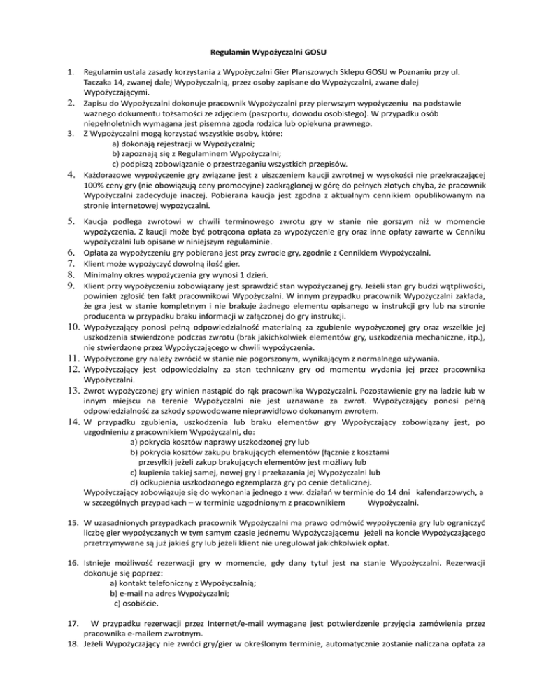 Regulamin Wypożyczalni GOSU 1. Regulamin ustala zasady korzystania z Wypożyczalni Gier Planszowych Sklepu GOSU w Poznaniu przy ul. Taczaka 14, zwanej dalej Wypożyczalnią, przez osoby zapisane do Wypożyczalni, zwane dalej Wypożyczającymi. 2. Zapisu do Wypożyczalni dokonuje pracownik Wypożyczalni przy pierwszym wypożyczeniu na podstawie ważnego dokumentu tożsamości ze zdjęciem (paszportu, dowodu osobistego). W przypadku osób niepełnoletnich wymagana jest pisemna zgoda rodzica lub opiekuna prawnego. 3. Z Wypożyczalni mogą korzystać wszystkie osoby, które: a) dokonają rejestracji w Wypożyczalni; b) zapoznają się z Regulaminem Wypożyczalni; c) podpiszą zobowiązanie o przestrzeganiu wszystkich przepisów. 4. Każdorazowe wypożyczenie gry związane jest z uiszczeniem kaucji zwrotnej w wysokości nie przekraczającej 100% ceny gry (nie obowiązują ceny promocyjne) zaokrąglonej w górę do pełnych złotych chyba, że pracownik Wypożyczalni zadecyduje inaczej. Pobierana kaucja jest zgodna z aktualnym cennikiem opublikowanym na stronie internetowej wypożyczalni. 5. Kaucja podlega zwrotowi w chwili terminowego zwrotu gry w stanie nie gorszym niż w momencie 6. 7. 8. 9. 10. 11. 12. 13. 14. wypożyczenia. Z kaucji może być potrącona opłata za wypożyczenie gry oraz inne opłaty zawarte w Cenniku wypożyczalni lub opisane w niniejszym regulaminie. Opłata za wypożyczeniu gry pobierana jest przy zwrocie gry, zgodnie z Cennikiem Wypożyczalni. Klient może wypożyczyć dowolną ilość gier. Minimalny okres wypożyczenia gry wynosi 1 dzień. Klient przy wypożyczeniu zobowiązany jest sprawdzić stan wypożyczanej gry. Jeżeli stan gry budzi wątpliwości, powinien zgłosić ten fakt pracownikowi Wypożyczalni. W innym przypadku pracownik Wypożyczalni zakłada, że gra jest w stanie kompletnym i nie brakuje żadnego elementu opisanego w instrukcji gry lub na stronie producenta w przypadku braku informacji w załączonej do gry instrukcji. Wypożyczający ponosi pełną odpowiedzialność materialną za zgubienie wypożyczonej gry oraz wszelkie jej uszkodzenia stwierdzone podczas zwrotu (brak jakichkolwiek elementów gry, uszkodzenia mechaniczne, itp.), nie stwierdzone przez Wypożyczającego w chwili wypożyczenia. Wypożyczone gry należy zwrócić w stanie nie pogorszonym, wynikającym z normalnego używania. Wypożyczający jest odpowiedzialny za stan techniczny gry od momentu wydania jej przez pracownika Wypożyczalni. Zwrot wypożyczonej gry winien nastąpić do rąk pracownika Wypożyczalni. Pozostawienie gry na ladzie lub w innym miejscu na terenie Wypożyczalni nie jest uznawane za zwrot. Wypożyczający ponosi pełną odpowiedzialność za szkody spowodowane nieprawidłowo dokonanym zwrotem. W przypadku zgubienia, uszkodzenia lub braku elementów gry Wypożyczający zobowiązany jest, po uzgodnieniu z pracownikiem Wypożyczalni, do: a) pokrycia kosztów naprawy uszkodzonej gry lub b) pokrycia kosztów zakupu brakujących elementów (łącznie z kosztami przesyłki) jeżeli zakup brakujących elementów jest możliwy lub c) kupienia takiej samej, nowej gry i przekazania jej Wypożyczalni lub d) odkupienia uszkodzonego egzemplarza gry po cenie detalicznej. Wypożyczający zobowiązuje się do wykonania jednego z ww. działań w terminie do 14 dni kalendarzowych, a w szczególnych przypadkach – w terminie uzgodnionym z pracownikiem Wypożyczalni. 15. W uzasadnionych przypadkach pracownik Wypożyczalni ma prawo odmówić wypożyczenia gry lub ograniczyć liczbę gier wypożyczanych w tym samym czasie jednemu Wypożyczającemu jeżeli na koncie Wypożyczającego przetrzymywane są już jakieś gry lub jeżeli klient nie uregulował jakichkolwiek opłat. 16. Istnieje możliwość rezerwacji gry w momencie, gdy dany tytuł jest na stanie Wypożyczalni. Rezerwacji dokonuje się poprzez: a) kontakt telefoniczny z Wypożyczalnią; b) e-mail na adres Wypożyczalni; c) osobiście. 17. W przypadku rezerwacji przez Internet/e-mail wymagane jest potwierdzenie przyjęcia zamówienia przez pracownika e-mailem zwrotnym. 18. Jeżeli Wypożyczający nie zwróci gry/gier w określonym terminie, automatycznie zostanie naliczana opłata za kolejne dni wypożyczenia wg stawki określonej w Cenniku Wypożyczalni. 19. Wypożyczający ma prawo do prolongaty wypożyczonej gry gdy: a) gra nie została zamówiona przez innego Klienta Wypożyczalni; b) Wypożyczający nie zalega z żadnymi opłatami. 20. Prolongata powinna być dokonana poprzez: a) kontakt telefoniczny z Wypożyczalnią; b) e-mail na adres Wypożyczalni, co najmniej jeden dzień przed końcem wypożyczenia; c) osobiście. 21. W przypadku dokonania prolongaty przez Internet/e-mail wymagane jest potwierdzenie przyjęcia zamówienia przez pracownika e-mailem zwrotnym. 22. W przypadku przekroczenia deklarowanego terminu zwrotu gry o 7 dni, Wypożyczalnia wysyła przypomnienie o konieczności zwrotu gry. Koszt wysłania przypomnienia naliczany jest według stawki określonej w Cenniku Wypożyczalni. 23. Przypomnienie o konieczności zwrotu gry wysyłane jest: a) W formie wiadomości e-mail, jeżeli Wypożyczajcy udostępnił swój adres e-mail; b) W formie SMS, jeżeli Wypożyczający udostępnił swój numer telefonu komórkowego; c) W formie listownej, na adres podany w dokumencie tożsamości (jeżeli nie podano innego jako kontaktowy). 24. Wypożyczalnia ma prawo w uzasadnionych przypadkach żądać zwrotu gry przed upływem regulaminowego terminu zwrotu lub w chwili wypożyczenia zastrzec wcześniejszy termin zwrotu 25. Jeżeli na żądanie Wypożyczalni wypożyczone mienie nie zostanie zwrócone lub gdy nie nastąpi zapłata służących Wypożyczalni wierzytelności, Wypożyczalni przysługuje prawo dochodzenia wierzytelności na drodze sądowej. 26. Wszelkie zmiany niniejszego Regulaminu, wynikające z obowiązku dostosowania do aktualnie obowiązujących przepisów prawa lub ze zmian w działalności firmy, obowią