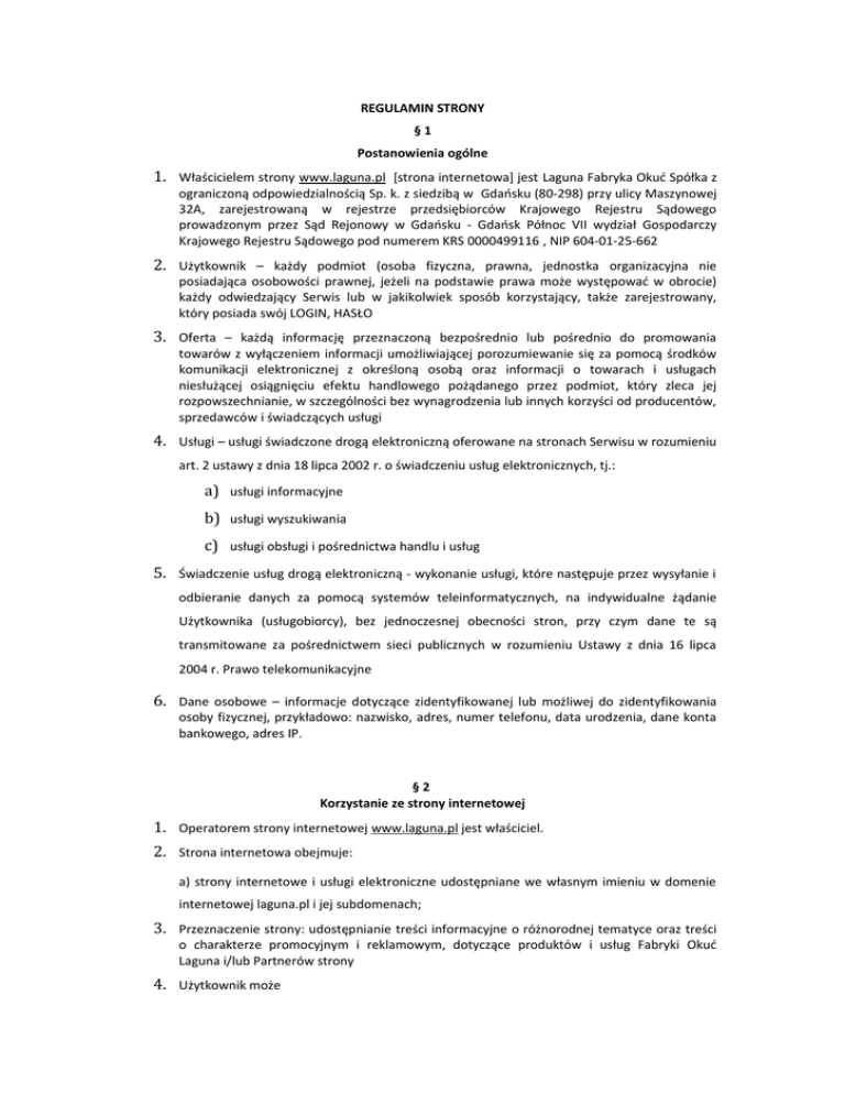 REGULAMIN STRONY §1 Postanowienia ogólne 1. Właścicielem strony www.laguna.pl [strona internetowa] jest Laguna Fabryka Okuć Spółka z ograniczoną odpowiedzialnością Sp. k. z siedzibą w Gdańsku (80-298) przy ulicy Maszynowej 32A, zarejestrowaną w rejestrze przedsiębiorców Krajowego Rejestru Sądowego prowadzonym przez Sąd Rejonowy w Gdańsku - Gdańsk Północ VII wydział Gospodarczy Krajowego Rejestru Sądowego pod numerem KRS 0000499116 , NIP 604-01-25-662 2. Użytkownik – każdy podmiot (osoba fizyczna, prawna, jednostka organizacyjna nie posiadająca osobowości prawnej, jeżeli na podstawie prawa może występować w obrocie) każdy odwiedzający Serwis lub w jakikolwiek sposób korzystający, także zarejestrowany, który posiada swój LOGIN, HASŁO 3. Oferta – każdą informację przeznaczoną bezpośrednio lub pośrednio do promowania towarów z wyłączeniem informacji umożliwiającej porozumiewanie się za pomocą środków komunikacji elektronicznej z określoną osobą oraz informacji o towarach i usługach niesłużącej osiągnięciu efektu handlowego pożądanego przez podmiot, który zleca jej rozpowszechnianie, w szczególności bez wynagrodzenia lub innych korzyści od producentów, sprzedawców i świadczących usługi 4. Usługi – usługi świadczone drogą elektroniczną oferowane na stronach Serwisu w rozumieniu art. 2 ustawy z dnia 18 lipca 2002 r. o świadczeniu usług elektronicznych, tj.: a) usługi informacyjne b) usługi wyszukiwania c) usługi obsługi i pośrednictwa handlu i usług 5. Świadczenie usług drogą elektroniczną - wykonanie usługi, które następuje przez wysyłanie i odbieranie danych za pomocą systemów teleinformatycznych, na indywidualne żądanie Użytkownika (usługobiorcy), bez jednoczesnej obecności stron, przy czym dane te są transmitowane za pośrednictwem sieci publicznych w rozumieniu Ustawy z dnia 16 lipca 2004 r. Prawo telekomunikacyjne 6. Dane osobowe – informacje dotyczące zidentyfikowanej lub możliwej do zidentyfikowania osoby fizycznej, przykładowo: nazwisko, adres, numer telefonu, data urodzenia, dane konta bankowego, adres IP. §2 Korzystanie ze strony internetowej 1. Operatorem strony internetowej www.laguna.pl jest właściciel. 2. Strona internetowa obejmuje: a) strony internetowe i usługi elektroniczne udostępniane we własnym imieniu w domenie internetowej laguna.pl i jej subdomenach; 3. Przeznaczenie strony: udostępnianie treści informacyjne o różnorodnej tematyce oraz treści o charakterze promocyjnym i reklamowym, dotyczące produktów i usług Fabryki Okuć Laguna i/lub Partnerów strony 4. Użytkownik może 5. Użytkownik jest zobowiązany do korzystania ze strony w sposób zgodny z niniejszym Regulaminem, obowiązującym prawem, ogólnymi zasadami korzystania z sieci Internet oraz celami utworzenia strony, a w szczególności w sposób nie naruszający praw osób trzecich oraz praw właściciela. 6. W przypadku stwierdzenia, że Użytkownik narusza pkt. 3 lub dopuszcza się działań opisanych w pkt 3, właściciel ma prawo podjąć wszelkie działania prowadzące do naprawienia poniesionej w związku z tym szkody. §3 Odpowiedzialność za treść 1. Właściciel odpowiada jedynie za treści własne zamieszczone na stronie. 2. Informacje zamieszczane przez właściciela na stronie są na bieżąco aktualizowane oraz sporządzane w sposób staranny, jednakże właściciel nie udziela gwarancji za prawidłowość, aktualność, kompletność i stałą dostępność strony. 3. Właściciel udziela wiążących informacji, porad, zaleceń lub wyjaśnień wyłącznie w ramach komunikacji indywidualnej. 4. Właściciel zastrzega sobie prawo zmiany oferty internetowej, jej uzupełniania, skracania lub całkowitego wycofania. Nie gwarantuje również, że treści oferty internetowej są odpowiednie dla użytkownika i jego celów. 5. Na stronie mogą być umieszczone linki do adresów internetowych podmiotów trzecich, na których treść właściciel nie ma żadnego wpływu. Za treści znajdujące się pod linkowanymi adresami odpowiada wyłącznie ich operator. 6. Właściciel zwraca się z prośbą o bezzwłoczne jego powiadomienie, jeśli użytkownik, korzystając z linków umieszczonych na stronie, trafi pod adresy, których treści wydają się użytkownikowi wątpliwe. Usunięcie tego rodzaju linków nastąpi bezzwłocznie po uzyskaniu informacji o naruszeniu prawa przez treści adresów linkowanych. Oświadczenie to obowiązuje dla wszystkich linków znajdujących się na stronie właściciela. §4 Obszar obowiązywania oferty 1. Oferta internetowa właściciela jest przeznaczona dla obszaru Rzeczpospolitej Polskiej i została sporządzona na podstawie polskiego prawa. 2. Właściciel nie ponosi żadnej odpowiedzialności za to, czy oferta internetowa jest odpowiednia dla użytkowników z innych państw, ma tam zastosowanie i jest prawnie dopuszczalna. §5 Prawa autorskie 1. Zawartość strony, w tym jej treść, kształt i konstrukcja chroniona jest polskim i międzynarodowym prawem autorskim. Prawa do wszystkich materiałów zamieszczonych na stronie zastrzeżone są na rzecz właściciela bądź firm i osób uprawnionych (np. partnerów handlowych, klientów). 2. Żadna część strony (m.in. teksty, dokumenty, pliki, układy graficzne, grafiki) nie może być powielana lub rozpowszechniana w jakiejkolwiek formie lub w jakikolwiek sposób (elektroniczny lub mechaniczny) włącznie z kopiowaniem, drukowanie, fotokopiowaniem, nagrywaniem na taśmy, dyskietki, płyty CV/DVD lub przy użyciu innych systemów i środków, bez zgody właściciela, chyba że regulamin stanowi inaczej. 3. Ściąganie i kopiowanie treści znajdujących się na stronie jest dozwolone wyłącznie do prywatnego, niekomercyjnego użytku, chyba że w danym przypadku określono inaczej. Ustawianie hiperlinków na stronie, w szczególności deep links, inline-links lub linków w technologii Frame, jest dop