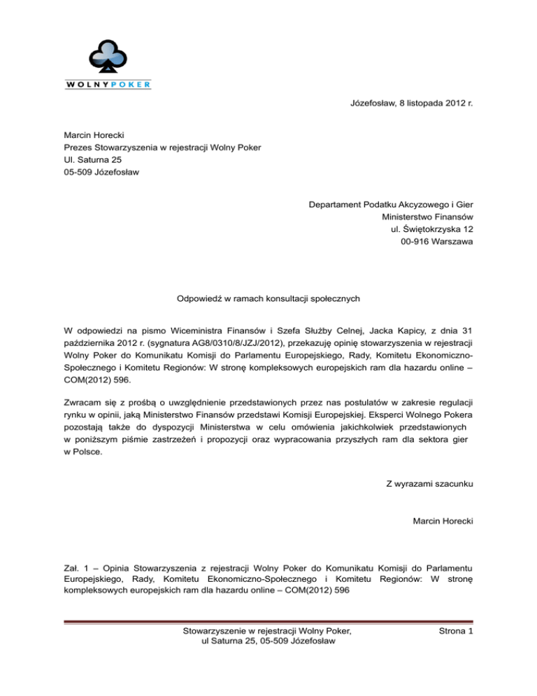 Józefosław, 8 listopada 2012 r. Marcin Horecki Prezes Stowarzyszenia w rejestracji Wolny Poker Ul. Saturna 25 05-509 Józefosław Departament Podatku Akcyzowego i Gier Ministerstwo Finansów ul. Świętokrzyska 12 00-916 Warszawa Odpowiedź w ramach konsultacji społecznych W odpowiedzi na pismo Wiceministra Finansów i Szefa Służby Celnej, Jacka Kapicy, z dnia 31 października 2012 r. (sygnatura AG8/0310/8/JZJ/2012), przekazuję opinię stowarzyszenia w rejestracji Wolny Poker do Komunikatu Komisji do Parlamentu Europejskiego, Rady, Komitetu EkonomicznoSpołecznego i Komitetu Regionów: W stronę kompleksowych europejskich ram dla hazardu online – COM(2012) 596. Zwracam się z prośbą o uwzględnienie przedstawionych przez nas postulatów w zakresie regulacji rynku w opinii, jaką Ministerstwo Finansów przedstawi Komisji Europejskiej. Eksperci Wolnego Pokera pozostają także do dyspozycji Ministerstwa w celu omówienia jakichkolwiek przedstawionych w poniższym piśmie zastrzeżeń i propozycji oraz wypracowania przyszłych ram dla sektora gier w Polsce. Z wyrazami szacunku Marcin Horecki Zał. 1 – Opinia Stowarzyszenia z rejestracji Wolny Poker do Komunikatu Komisji do Parlamentu Europejskiego, Rady, Komitetu Ekonomiczno-Społecznego i Komitetu Regionów: W stronę kompleksowych europejskich ram dla hazardu online – COM(2012) 596 Stowarzyszenie w rejestracji Wolny Poker, ul Saturna 25, 05-509 Józefosław Strona 1 Wolny Poker z zadowoleniem przyjął decyzję Komisji Europejskiej o rozpoczęciu konsultacji z państwami członkowskimi na temat regulacji sektora hazardowego. Jako jedyna inicjatywa w środowisku pokerowym popierana przez tysiące osób, chcemy zwrócić uwagę Ministerstwa Finansów oraz Komisji Europejskiej na sytuację pokerzystów w Polsce, zarówno tych grających regularnie, jak i entuzjastów pokera, traktujących grę jako jedną z form rozrywki. 1. Sytuacja pokera w Polsce Według szacunków Wolnego Pokera społeczność pokerowa w Polsce liczy blisko 800 tysięcy osób, które zetknęły się z odmianą Texas Hold’em. Od 1 stycznia 2010 roku, kiedy weszła w życie nowa Ustawa o Grach Hazardowych (Dz.U. 2009 nr 201 poz. 1540), pokerzyści w Polsce mogą uczestniczyć jedynie w turniejach pokera organizowanych w kasynach. Gry stolikowe oraz poker online zostały literalnie zakazane przez ustawodawcę. Jak wskazują jednak dane spółki Casinos Poland, także turnieje w kasynach cieszą się znacząco mniejszą popularnością ze względu na strukturę opodatkowania (25 proc. od wygranej plus 10 proc. wpisowego jako prowizja dla kasyna jako organizatora gry) oraz wymogi formalne, dotyczące organizacji turnieju. Także na same kasyna nałożone zostały dodatkowe obciążenia, np. obowiązek przechowywania zapisu audiowizualnego z kasyna przez trzy lata od końca roku kalendarzowego, w którym zapisu dokonano, co dodatkowo utrudnia i podnosi koszty działalności kasyn. W rezultacie, od 2009 r. w Polsce nie odbywają się światowej klasy turnieje, takie jak Unibet Open czy Europen Poker Tour, a obroty kasyn spadają o ok. 15 proc. rocznie. Organizowane okazjonalnie towarzyskie turnieje w restauracjach czy zamkniętych klubach, które na mocy są nielegalne, na mocy ustawy są ścigane przez Służbę Celną, policję i Centralne Biuro Śledcze. O tym, czy jest to na pewno działanie adekwatne i uzasadnione, świadczyć może sprawa przeciwko uczestnikom i organizatorom nielegalnego turnieju pokerowego, jaki odbywał się w październiku 2011 r. w Gostyniu. Sąd Rejonowy w Gostyniu, wyrokiem z 31 lipca 2012 r., umorzył postępowanie przeciwko oskarzonym. Rozpatrzywszy dostarczoną przez Służbę Celną dokumentację, sąd nie dopatrzył się wystarczających przesłanek do dalszego prowadzenia postępowania i wydał decyzję o jego umorzeniu, a kosztami postępowania obciążył Skarb Państwa. Przesłankami do takiego rozstrzygnięcia była – w ocenie sądu – znikoma szkodliwość społeczna czynu, o której przesądzał fakt, że nagrodą rzeczową w turnieju była książka o pokerze oraz kolacja dla dwóch osób w gostyńskim lokalu „Pyra”. W uzasadnieniu orzeczenia sąd stwierdził, że „wartość nagrody rzeczowej była znikoma, wręcz upominkowa, a gra organizowana była w celach towarzyskich, a nie hazardowych”. Dodał również, że „rozmiar wyrządzonej finansom publicznym szkody był znikomy”. Wyrok ten postawił pod znakiem zapytania zapisany w ustawie zakaz organizowania poza kasynami turniejów w pokera o nawet symboliczną nagrodę. Wolny Poker postuluje normalizację gry na żywo i dopuszczenie organizacji turniejów pokerowych poza kasynami na podstawie precyzyjnych przepisów, przy nadzorze państwa i rozsądnej skali podatków. Przykład z Gostynia pokazuje także, że w polskim społeczeństwie istnieje przyzwolenie na towarzyską grę w pokera poza kasynami, jeśli toczy się ona o symboliczne wygrane. Stowarzyszenie w rejestracji Wolny Poker, ul Saturna 25, 05-509 Józefosław Strona 2 2. Konieczność wprowadzenia nowej definicji i kategoryzacji gry w pokera W ocenie środowiska pokerowego wprowadzona Ustawą o Grach Hazardowych regulacja pokera, zarówno w wersji offline, jak i online, nie oddaje stanu faktycznego i modelu gry, niesprawiedliwie klasyfikując pokera jako twardy hazard, do którego zaliczane są również automaty o niskich wygranych, a także gry kasynowe, takie jak ruletka czy bakarat. Tymczasem modelowo poker jest bardziej zbliżony do gry na giełdzie i rynku forex. Nie istnieje w polskich aktach normatywnych definicja ustawowa ani tzw. „miękkiego hazardu” ani tzw. „twardego hazardu”, mimo że do tej drugiej grupy zaliczono m.in. gry w pokera online. Podział na hazard twardy i miękki jest umowny i płynny, niepoparty żadnymi obiektywnymi badaniami nt. wpływu poszczególnych gier na społeczeństwo, skali uzależnień czy znaczenia elementu losowego w grze. Środowisko pokerowe 