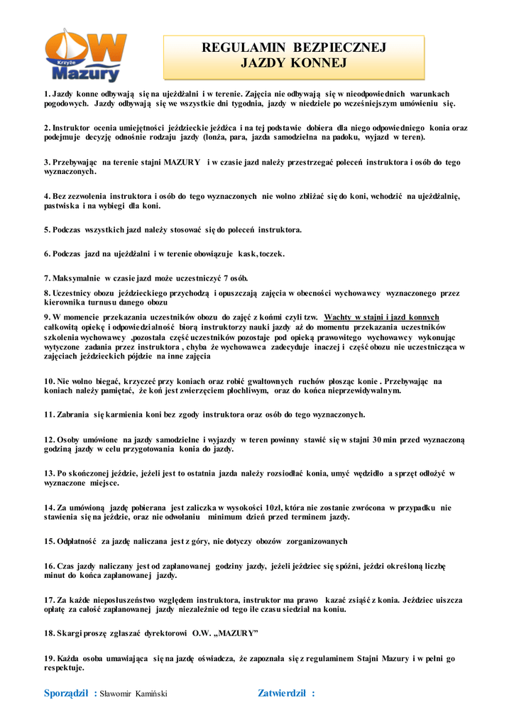 REGULAMIN BEZPIECZNEJ JAZDY KONNEJ 1. Jazdy konne odbywają się na ujeżdżalni i w terenie. Zajęcia nie odbywają się w nieodpowiednich warunkach pogodowych. Jazdy odbywają się we wszystkie dni tygodnia, jazdy w niedziele po wcześniejszym umówieniu się. 2. Instruktor ocenia umiejętności jeździeckie jeźdźca i na tej podstawie dobiera dla niego odpowiedniego konia oraz podejmuje decyzję odnośnie rodzaju jazdy (lonża, para, jazda samodzielna na padoku, wyjazd w teren). 3. Przebywając na terenie stajni MAZURY i w czasie jazd należy przestrzegać poleceń instruktora i osób do tego wyznaczonych. 4. Bez zezwolenia instruktora i osób do tego wyznaczonych nie wolno zbliżać się do koni, wchodzić na ujeżdżalnię, pastwiska i na wybiegi dla koni. 5. Podczas wszystkich jazd należy stosować się do poleceń instruktora. 6. Podczas jazd na ujeżdżalni i w terenie obowiązuje kask, toczek. 7. Maksymalnie w czasie jazd może uczestniczyć 7 osób. 8. Uczestnicy obozu jeździeckiego przychodzą i opuszczają zajęcia w obecności wychowawcy wyznaczonego przez kierownika turnusu danego obozu 9. W momencie przekazania uczestników obozu do zajęć z końmi czyli tzw. Wachty w stajni i jazd konnych całkowitą opiekę i odpowiedzi alność biorą instruktorzy nauki jazdy aż do momentu przekazania uczestników szkolenia wychowawcy ,pozostała część uczestników pozostaje pod opieką prawowitego wychowawcy wykonując wytyczone zadania przez instruktora , chyba że wychowawca zadecyduje inaczej i część obozu nie uczestnicząca w zajęciach jeździeckich pójdzie na inne zajęcia 10. Nie wolno biegać, krzyczeć przy koniach oraz robić gwałtownych ruchów płosząc konie . Przebywając na koniach należy pamiętać, że koń jest zwierzęciem płochliwym, oraz do końca nieprzewidywalnym. 11. Zabrania się karmienia koni bez zgody instruktora oraz osób do tego wyznaczonych. 12. Osoby umówione na jazdy samodzielne i wyjazdy w teren powinny stawić się w stajni 30 min przed wyznaczoną godziną jazdy w celu przygotowania konia do jazdy. 13. Po skończonej jeździe, jeżeli jest to ostatnia jazda należy rozsiodłać konia, umyć wędzidło a sprzęt odłożyć w wyznaczone miejsce. 14. Za umówioną jazdę pobierana jest zaliczka w wysokości 10zł, która nie zostanie zwrócona w przypadku nie stawienia się na jeździe, oraz nie odwołaniu minimum dzień przed terminem jazdy. 15. Odpłatność za jazdę naliczana jest z góry, nie dotyczy obozów zorganizowanych 16. Czas jazdy naliczany jest od zaplanowanej godziny jazdy, jeżeli jeździec się spóźni, jeździ określoną liczbę minut do końca zaplanowanej jazdy. 17. Za każde nieposłuszeństwo względem instruktora, instruktor ma prawo kazać zsiąść z konia. Jeździec uiszcza opłatę za całość zaplanowanej jazdy niezależnie od tego ile czasu siedział na koniu. 18. Skargi proszę zgłaszać dyrektorowi O.W. „MAZURY” 19. Każda osoba umawiająca się na jazdę oświadcza, że zapoznała się z regulaminem Stajni Mazury i w pełni go respektuje. Sporządził : Sławomir Kamiński Zatwierdził :