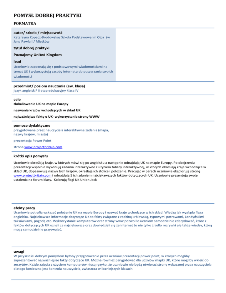 POMYSŁ DOBREJ PRAKTYKI FORMATKA autor/ szkoła / miejscowość Katarzyna Kopacz-Brodowska/ Szkoła Podstawowa im Ojca św Jana Pawła II/ Mietków tytuł dobrej praktyki Poznajemy United Kingdom lead Uczniowie zapoznają się z podstawowymi wiadomościami na temat UK i wykorzystują zasoby internetu do poszerzania swoich wiadomości przedmiot/ poziom nauczania (ew. klasa) język angielski/ II etap edukacyjny klasa IV cele zlokaliowanie UK na mapie Europy nazwanie krajów wchodzących w skład UK najważniejsze fakty o UK- wykorzystanie strony WWW pomoce dydaktyczne przygotowane przez nauczyciela interaktywne zadania (mapa, nazwy krajów, miasta) prezentacja Power Point strona www.projectbritain.com krótki opis pomysłu Uczniowie określają kraje, w których mówi się po angielsku a następnie odnajdują UK na mapie Europy. Po obejrzeniu prezentacji wspólnie wykonują zadania interaktywne z użyciem tablicy interaktywnej, w których określają kraje wchodzące w skład UK, dopasowują nazwy tych krajów, określają ich stolice i położenie. Pracując w parach uczniowie eksplorują stronę www.projectbritain.com i odnajdują 5 ich zdaniem najciekawszych faktów dotyczących UK. Uczniowie prezentują swoje ustalenia na forum klasy. Kolorują flagi UK Union Jack efekty pracy Uczniowie potrafią wskazać położenie UK na mapie Europy i nazwać kraje wchodzące w ich skład. Wiedzą jak wygląda flaga angielska. Najciekawsze informacje dotyczące UK to fakty związane z rodziną królewską, typowymi potrawami, Londyńskimi taksówkami, pogodą etc. Wykorzystanie komputerów oraz strony www pozwoliło uczniom samodzielnie zdecydować, które z faktów dotyczących UK uznali za najciekawsze oraz dowiedzieli się że internet to nie tylko źródło rozrywki ale także wiedzy, którą mogą samodzielnie przyswajać. uwagi W przyszłości dobrym pomysłem byłoby przygotowanie przez uczniów prezentacji power point, w których mogliby zaprezentować najważniejsze fakty dotyczące UK. Można również pzrygotować dla uczniów mapki UK, które mogliby wkleić do zeszytów. Każde zajęcia z użyciem komputerów niosą ryzyko, że uczniowie nie będą otwierać strony wskazanej przez nauczyciela dlatego konieczna jest kontrola nauczyciela, zwłaszcza w liczniejszych klasach. załączniki www.projectbritain.com flaga http://www.themetraders.com/jubilee-templates/UNIONJACKBUNTING_template.jpg