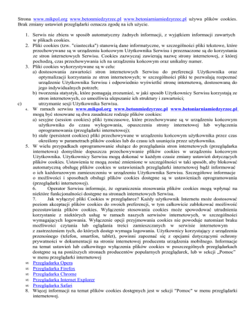 Strona www.mikpol.org www.betonmiedzyrzec.pl www.betoniarniamiedzyrzec.pl używa plików cookies. Brak zmiany ustawień przeglądarki oznacza zgodę na ich użycie. 1. Serwis nie zbiera w sposób automatyczny żadnych informacji, z wyjątkiem informacji zawartych w plikach cookies. 2. Pliki cookies (tzw. "ciasteczka") stanowią dane informatyczne, w szczególności pliki tekstowe, które przechowywane są w urządzeniu końcowym Użytkownika Serwisu i przeznaczone są do korzystania ze stron internetowych Serwisu. Cookies zazwyczaj zawierają nazwę strony internetowej, z której pochodzą, czas przechowywania ich na urządzeniu końcowym oraz unikalny numer. 3. Pliki cookies wykorzystywane są w celu: a) dostosowania zawartości stron internetowych Serwisu do preferencji Użytkownika oraz optymalizacji korzystania ze stron internetowych; w szczególności pliki te pozwalają rozpoznać urządzenie Użytkownika Serwisu i odpowiednio wyświetlić stronę internetową, dostosowaną do jego indywidualnych potrzeb; b) tworzenia statystyk, które pomagają zrozumieć, w jaki sposób Użytkownicy Serwisu korzystają ze stron internetowych, co umożliwia ulepszanie ich struktury i zawartości; c) utrzymanie sesji Użytkownika Serwisu. 4. W ramach serwisu www.mikpol.org www.betonmiedzyrzec.pl www.betoniarniamiedzyrzec.pl mogą być stosowane są dwa zasadnicze rodzaje plików cookies: a) sesyjne (session cookies) pliki tymczasowe, które przechowywane są w urządzeniu końcowym użytkownika do czasu wylogowania, opuszczenia strony internetowej lub wyłączenia oprogramowania (przeglądarki internetowej); b) stałe (persistent cookies) pliki przechowywane w urządzeniu końcowym użytkownika przez czas określony w parametrach plików cookies lub do czasu ich usunięcia przez użytkownika. 5. W wielu przypadkach oprogramowanie służące do przeglądania stron internetowych (przeglądarka internetowa) domyślnie dopuszcza przechowywanie plików cookies w urządzeniu końcowym Użytkownika. Użytkownicy Serwisu mogą dokonać w każdym czasie zmiany ustawień dotyczących plików cookies. Ustawienia te mogą zostać zmienione w szczególności w taki sposób, aby blokować automatyczną obsługę plików cookies w ustawieniach przeglądarki internetowej bądź informować o ich każdorazowym zamieszczeniu w urządzeniu Użytkownika Serwisu. Szczegółowe informacje o możliwości i sposobach obsługi plików cookies dostępne są w ustawieniach oprogramowania (przeglądarki internetowej). 6. Operator Serwisu informuje, że ograniczenia stosowania plików cookies mogą wpłynąć na niektóre funkcjonalności dostępne na stronach internetowych Serwisu. 7. Jak wyłączyć pliki Cookies w przeglądarce? Każdy użytkownik Internetu może dostosować poziom akceptacji plików cookies do swoich preferencji, w tym całkowicie zablokować możliwość pozostawiania plików cookies. Wyłączenie stosowania cookies może spowodować utrudnienia korzystanie z niektórych usług w ramach naszych serwisów internetowych, w szczególności wymagających logowania. Wyłączenie opcji przyjmowania cookies nie powoduje natomiast braku możliwości czytania lub oglądania treści zamieszczanych w serwisie internetowym z zastrzeżeniem tych, do których dostęp wymaga logowania. Użytkownicy korzystający z urządzenia przenośnego (telefon, smartfon, tablet), powinni zapoznać się z opcjami dotyczącymi ochrony prywatności w dokumentacji na stronie internetowej producenta urządzenia mobilnego. Informacje na temat ustawień lub całkowitego wyłączenia plików cookies w poszczególnych przeglądarkach dostępne są na poniższych stronach producentów popularnych przeglądarek, lub w sekcji „Pomoc” w menu przeglądarki internetowej • Przeglądarka Opera • Przeglądarka Firefox • Przeglądarka Chrome • Przeglądarka Internet Explorer • Przeglądarka Safari 8. Więcej informacji na temat plików cookies dostępnych jest w sekcji "Pomoc" w menu przeglądarki internetowej.