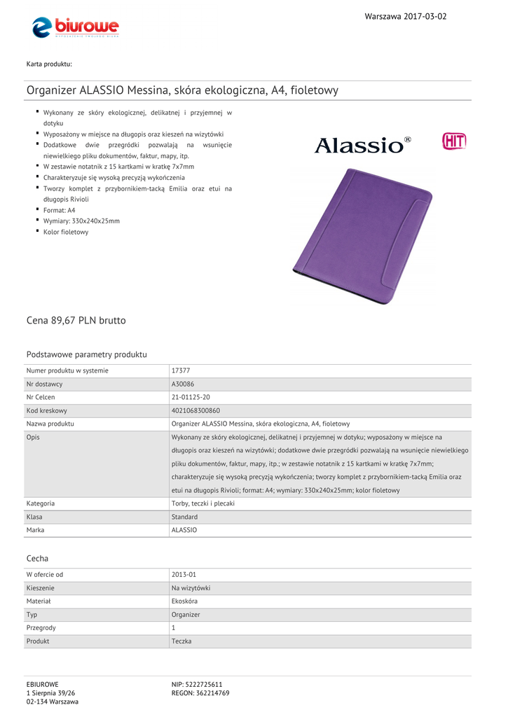 Warszawa 2017-03-02 Karta produktu: Organizer ALASSIO Messina, skóra ekologiczna, A4, fioletowy Wykonany ze skóry ekologicznej, delikatnej i przyjemnej w dotyku Wyposażony w miejsce na długopis oraz kieszeń na wizytówki Dodatkowe dwie przegródki pozwalają na wsunięcie niewielkiego pliku dokumentów, faktur, mapy, itp. W zestawie notatnik z 15 kartkami w kratkę 7x7mm Charakteryzuje się wysoką precyzją wykończenia Tworzy komplet z przybornikiem-tacką Emilia oraz etui na długopis Rivioli Format: A4 Wymiary: 330x240x25mm Kolor fioletowy Cena 89,67 PLN brutto Podstawowe parametry produktu Numer produktu w systemie 17377 Nr dostawcy A30086 Nr Celcen 21-01125-20 Kod kreskowy 4021068300860 Nazwa produktu Organizer ALASSIO Messina, skóra ekologiczna, A4, fioletowy Opis Wykonany ze skóry ekologicznej, delikatnej i przyjemnej w dotyku; wyposażony w miejsce na długopis oraz kieszeń na wizytówki; dodatkowe dwie przegródki pozwalają na wsunięcie niewielkiego pliku dokumentów, faktur, mapy, itp.; w zestawie notatnik z 15 kartkami w kratkę 7x7mm; charakteryzuje się wysoką precyzją wykończenia; tworzy komplet z przybornikiem-tacką Emilia oraz etui na długopis Rivioli; format: A4; wymiary: 330x240x25mm; kolor fioletowy Kategoria Torby, teczki i plecaki Klasa Standard Marka ALASSIO Cecha W ofercie od 2013-01 Kieszenie Na wizytówki Materiał Ekoskóra Typ Organizer Przegrody 1 Produkt Teczka EBIUROWE 1 Sierpnia 39/26 02-134 Warszawa NIP: 5222725611 REGON: 362214769 Warszawa 2017-03-02 Karta katalogowa produktu cd. Organizer ALASSIO Messina, skóra ekologiczna, A4, fioletowy Wymiary Format A4 Wymiary (mm) 330x240x25 Wspólny słownik zamówień CPV 22817000-0 Terminarze lub organizery osobiste Certyfikaty Hit Hit Nowy produkt w ofercie Standard Kolor Kolor Fioletowy Serdecznie zapraszamy do współpracy EBIUROWE zespół. EBIUROWE 1 Sierpnia 39/26 02-134 Warszawa NIP: 5222725611 REGON: 362214769
