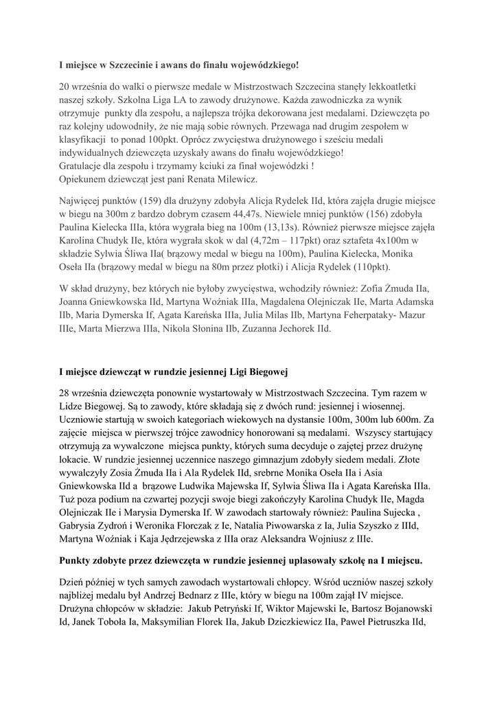 I miejsce w Szczecinie i awans do finału wojewódzkiego! 20 września do walki o pierwsze medale w Mistrzostwach Szczecina stanęły lekkoatletki naszej szkoły. Szkolna Liga LA to zawody drużynowe. Każda zawodniczka za wynik otrzymuje punkty dla zespołu, a najlepsza trójka dekorowana jest medalami. Dziewczęta po raz kolejny udowodniły, że nie mają sobie równych. Przewaga nad drugim zespołem w klasyfikacji to ponad 100pkt. Oprócz zwycięstwa drużynowego i sześciu medali indywidualnych dziewczęta uzyskały awans do finału wojewódzkiego! Gratulacje dla zespołu i trzymamy kciuki za finał wojewódzki ! Opiekunem dziewcząt jest pani Renata Milewicz. Najwięcej punktów (159) dla drużyny zdobyła Alicja Rydelek IId, która zajęła drugie miejsce w biegu na 300m z bardzo dobrym czasem 44,47s. Niewiele mniej punktów (156) zdobyła Paulina Kielecka IIIa, która wygrała bieg na 100m (13,13s). Również pierwsze miejsce zajęła Karolina Chudyk IIe, która wygrała skok w dal (4,72m – 117pkt) oraz sztafeta 4x100m w składzie Sylwia Śliwa IIa( brązowy medal w biegu na 100m), Paulina Kielecka, Monika Oseła IIa (brązowy medal w biegu na 80m przez płotki) i Alicja Rydelek (110pkt). W skład drużyny, bez których nie byłoby zwycięstwa, wchodziły również: Zofia Żmuda IIa, Joanna Gniewkowska IId, Martyna Woźniak IIIa, Magdalena Olejniczak IIe, Marta Adamska IIb, Maria Dymerska If, Agata Kareńska IIIa, Julia Milas IIb, Martyna Feherpataky- Mazur IIIe, Marta Mierzwa IIIa, Nikola Słonina IIb, Zuzanna Jechorek IId. I miejsce dziewcząt w rundzie jesiennej Ligi Biegowej 28 września dziewczęta ponownie wystartowały w Mistrzostwach Szczecina. Tym razem w Lidze Biegowej. Są to zawody, które składają się z dwóch rund: jesiennej i wiosennej. Uczniowie startują w swoich kategoriach wiekowych na dystansie 100m, 300m lub 600m. Za zajęcie miejsca w pierwszej trójce zawodnicy honorowani są medalami. Wszyscy startujący otrzymują za wywalczone miejsca punkty, których suma decyduje o zajętej przez drużynę lokacie. W rundzie jesiennej uczennice naszego gimnazjum zdobyły siedem medali. Złote wywalczyły Zosia Żmuda IIa i Ala Rydelek IId, srebrne Monika Oseła IIa i Asia Gniewkowska IId a brązowe Ludwika Majewska If, Sylwia Śliwa IIa i Agata Kareńska IIIa. Tuż poza podium na czwartej pozycji swoje biegi zakończyły Karolina Chudyk IIe, Magda Olejniczak IIe i Marysia Dymerska If. W zawodach startowały również: Paulina Sujecka , Gabrysia Zydroń i Weronika Florczak z Ie, Natalia Piwowarska z Ia, Julia Szyszko z IIId, Martyna Woźniak i Kaja Jędrzejewska z IIIa oraz Aleksandra Wojniusz z IIIe. Punkty zdobyte przez dziewczęta w rundzie jesiennej uplasowały szkołę na I miejscu. Dzień później w tych samych zawodach wystartowali chłopcy. Wśród uczniów naszej szkoły najbliżej medalu był Andrzej Bednarz z IIIe, który w biegu na 100m zajął IV miejsce. Drużyna chłopców w składzie: Jakub Petryński If, Wiktor Majewski Ie, Bartosz Bojanowski Id, Janek Toboła Ia, Maksymilian Florek IIa, Jakub Dziczkiewicz IIa, Paweł Pietruszka IId, Jakub Bis IId, Maksymilian Chmura IIIc, Wiktor Pilak IIIc, Błażej Gorzkowicz IIIe i Konrad Sielicki w rundzie jesiennej zajęła dziewiąte miejsce. Gratulujemy dziewczynom, a wszystkim życzymy udanego startu wiosną. Kolejny sukces dziewcząt w zawodach lekkoatletycznych pn. „Dzień sztafet” 3 października na stadionie lekkoatletycznym odbyły się zawody sztafetowe dla uczniów szkół gimnazjalnych. Reprezentacja szkoły składała się z szesnastu dziewcząt, które startowały w czterech sztafetach: 4x100m, 4x400m, szwedzkiej(100m, 200m,300m,400m) i olimpijskiej(800m,400m,200m,100m). Nasze dziewczyny pod opieką pani Renaty Milewicz zdobyły komplet medali i drużynowo zajęły I miejsce w Szczecinie. • • • • 4x100m – II miejsce (Ludwika Majewska If- Sylwia Śliwa IIa- Marta Mierzwa IIIaPaulina Kielecka IIIa) 4x400m - III miejsce (Zuzanna Jechorek IId – Marta Adamska IIb- Kaja Jędrzejewska IIIa- Julia Milas IIb) Szwedzka – I miejsce ( Julia Szyszko IIId- Joanna Gniewkowska IId- Zofia Żmuda IIa- Magdalena Olejniczak IIe) Olimpijska – II miejsce (Alicja Rydelek IID- Monika Oseła IIa- Maria Dymerska IfKarolina Chudyk IIe)