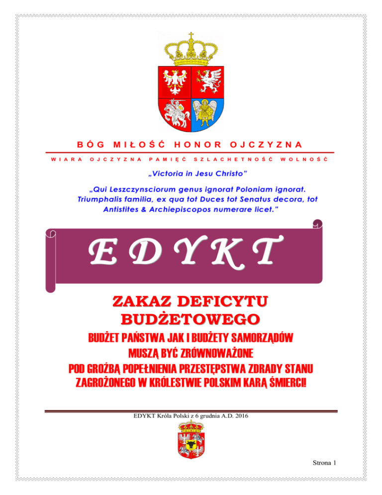 BÓG W I A R A MIŁOŚĆ O J C Z Y Z N A HONOR P A M I Ę Ć OJCZYZNA S Z L A C H E T N O Ś Ć W O L N O Ś Ć „Victoria in Jesu Christo” „Qui Leszczynsciorum genus ignorat Poloniam ignorat. Triumphalis familia, ex qua tot Duces tot Senatus decora, tot Antistites & Archiepiscopos numerare licet.” EDYKT ZAKAZ DEFICYTU BUDŻETOWEGO BUDŻET PAŃSTWA JAK I BUDŻETY SAMORZĄDÓW MUSZĄ BYĆ ZRÓWNOWAŻONE POD GROŹBĄ POPEŁNIENIA PRZESTĘPSTWA ZDRADY STANU ZAGROŻONEGO W KRÓLESTWIE POLSKIM KARĄ ŚMIERCI! EDYKT Króla Polski z 6 grudnia A.D. 2016 Strona 1 Wszem wobec i komu to należy wiedzieć oznajmiamy, że okupant Polski i Polaków tj. III RP, w którego władzach zasiadają osoby z pochodzeniem żydowskim, uzurpatorsko administrujący na Ziemi Korony Polskiej polskimi zasobami, dąży do zniewolenia narodu polskiego poprzez zadłużanie swojego państwa u lichwy światowej, co powoduje roczne wyprowadzenia z Polski wielu miliardów samych ODSETEK szacowanych obecnie na ponad 60 mld PLN równowartość ok. 15 mld dolarów (USD) rocznie. KKw woottaa zzaaoosszzcczzęęddzzoonnyycchh ooddsseetteekk ppoozzw woolliiłłaabbyy nnaa pprrzzyykkłłaadd w wyyppłłaaccaaćć PPoollaakkoom m nniiee 550000++ aallee 22..000000++ Nie wiemy jak duża część cywilizowanego świata na serio traktuje państwo kolonialne powstałe po II wojnie światowej, jako marionetkowy twór sowiecki o nazwie „„PPRRLL””, a następnie przepoczwarzone w roku 1989 w marionetkowy twór światowej finansjery i lichwy w „„IIIIII RRPP””, więc z ostrożności POSTANAWIAMY, ze okupant nie może bez konsekwencji, w żadnym przypadku, tak na szczeblu państwa okupacyjnego tj. III RP, jak i w samorządach przegłosowywać budżetów rocznych z deficytem. O Ossoobbyy,, ttaakk w w sseejjm miiee IIIIII RRPP ggłłoossuujjąąccee nnaadd bbuuddżżeetteem m,, jjaakk PPaann PPrreezzyyddeenntt A Annddrrzzeejj D Duuddaa zzaattw wiieerrddzzaajjąąccyy tteenn bbuuddżżeett zz ddeeffiiccyytteem m oorraazz oossoobbyy pprrzzeeggłłoossoow wuujjąąccee ii zzaattw wiieerrddzzaajjąąccee bbuuddżżeettyy ssaam moorrzząąddoow wee zz ddeeffiiccyyttaam mii ppooddlleeggaajjąą nniinniieejjsszzeem muu EEddyykkttoow wii,, ssttaannoow wiiąącceem muu,, żżee kkttoo zzaaddłłuużżaa N Naarróódd ppoollsskkii bbeezz JJeeggoo ppiisseem mnneejj,, iim miieennnneejj zzggooddyy,, tteenn ppooppeełłnniiaa pprrzzeessttęęppssttw woo ZZddrraaddyy SSttaannuu zzaaggrroożżoonnee w w KKrróólleessttw wiiee PPoollsskkiim m kkaarrąą śśm miieerrccii.. Jednocześnie osoby takie odpowiadają całym swoim majątkiem osobistym i majątkiem swojej rodziny za spłatę długu! EDYKT Króla Polski z 6 grudnia A.D. 2016 Strona 2 Tym samym zlecam Podskarbiemu Wielkiemu Koronnemu aby monitorował sytuację w państwie nazywanym „III RP”, tak na szczebli centralnym jak w samorządach i na Sejmie Walnym relacjonował przypadki naruszenia niniejszego prawa królewskiego. SSąądd SSeejjm moow wyy pprroossiim myy oo sszzyybbkkiiee w wyyddaaw waanniiee w wyyrrookkóów w nnaa ttyycchh,, kkttóórrzzyy ggłłoossoow waallii lluubb zzaattw wiieerrddzzaallii bbuuddżżeettyy zz ddeeffiiccyytteem m.. Przestrzegamy, że przestępstwo Zdrady Stanu na Ziemi Królestwa Polskiego nie przedawnia się i jest ścigane na całym świecie. Dodatkowo, przestępstwo Zdrady Stanu skutkuje konfiskatą majątku i infamią połączoną z banicją dla przestępcy i jego najbliższej rodziny. Infamia i banicja może dotyczyć trzech pokoleń najbliższej rodziny przestępcy. KKaarryy ssąą ssuurroow wee,, ppoonniieew waażż śśw wiiaaddoom mee lluubb w wyynniikkaajjąąccee zz nniieeuuddoollnneeggoo rrzząąddzzeenniiaa zzaaddłłuużżaanniiee PPoollaakkóów w ii ttoo kkiillkkaa ppookkoolleeńń w wpprrzzóódd jjeesstt pprróóbbąą uucczzyynniieenniiaa zz PPoollaakkóów ww wiieecczznnyycchh nniieew woollnniikkóów w,, nnaa ccoo nniiee m maa nnaasszzeejj zzggooddyy!! Jednocześnie oświadczamy tym, którzy pożyczają „III RP” pieniądze na pokrycie deficytu budżetowego, że podlegają tym samym sankcjom, co wyżej opisane. Traktujemy ich jako wrogów Narodu polskiego i Królestwa Polskiego, świadomie wspierających naszego okupanta i świadomie zadłużających Polaków bez ich pisemnej zgody. Oświadczamy niniejszym, że Królestwo Polskie nie ma nic wspólnego z zobowiązaniami jakie zaciąga „III RP”. Nie pozwalamy Poddanym aby zgadzali się na spłatę zobowiązań, których nie zaciągali i na które się nie godzili! EDYKT Króla Polski z 6 grudnia A.D. 2016 Strona 3 Dano w Mieście Myszków, 6 grudnia Roku Pańskiego MMXVI. W pierwszym roku naszego panowania. Wojciech Edward Rex Poloniae WPIS Nr 20/12/2016 DO METRYKI KORONNEJ z 14 grudnia A.D. 2016 www.metrykakoronna.pl EDYKT Króla Polski z 6 grudnia A.D. 2016 Strona 4