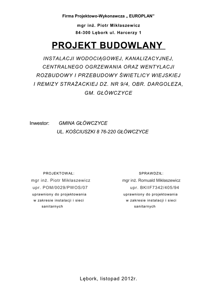 Firma Projektowo-Wykonawcza „ EUROPLAN” mgr inż. Piotr Mikłaszew icz 84-300 Lębork ul. Harcerzy 1 PROJEKT BUDOWLANY INSTALACJI WODOCIĄGOWEJ, KANALIZACYJNEJ, CENTRALNEGO OGRZEWANIA ORAZ WENTYLACJI ROZBUDOWY I PRZEBUDOWY ŚWIETLICY WIEJSKIEJ I REMIZY STRAŻACKIEJ DZ. NR 9/4, OBR. DARGOLEZA, GM. GŁÓWCZYCE Inwestor: GMINA GŁÓWCZYCE UL. KOŚCIUSZKI 8 76-220 GŁÓWCZYCE P RO JE KT OW AŁ : SP RAW DZIŁ : mgr inż. Piotr Mikłaszewicz upr. POM/0029/PW OS/07 mgr inż. Romuald Mikłaszewicz upr. BKIIF7342/405/94 u p ra wn io n y d o p ro je kt o wa n ia u p ra wn io n y d o p ro je kt o wa n ia w za kre sie in st a la cji i sie ci w za kre sie in st a la cji i sie ci sa n it a rn ych sa n ita rn ych Lębork, listopad 2012r. OPIS TECHNICZNY 1. Podstawa opracowania a) projekt architektoniczny budynku w skali 1:50 opracowany przez Biuro Obsługi Budownictwa mgr inż. Jarosław Celban b) obowiązujące normy i przepisy c) wytyczne inwestora d) obowiązujące normy i przepisy 2. Zakres opracowania Zakres niniejszego opracowania obejmuje projekt budowlany : - instalacji wody zimnej i ciepłej - instalacji kanalizacji sanitarnej - instalacji centralnego ogrzewania - instalacji wentylacyjnej rozbudowy i przebudowy świetlicy wiejskiej i remizy strażackiej w Dargolezie dz. nr 9/4, gm. Główczyce. 3. Uwagi ogólne Odpływ ścieków sanitarnych z projektowanego budynku odbywać się będzie do prefabrykowanego bezodpływowego zbiornika ścieków V=10m3 zlokalizowanego na posesji. Zasilenie budynku w wodę odbywać się będzie z istniejącego przyłącza wodociągowego. Pomiar zużycia wody zimnej dla budynku – w studzience wodomierzowej. Obiekt ogrzewany ekologicznym – przygotowywana będzie z własnej eko-groszek, będzie w kotłowni pellety. opalanej paliwem woda użytkowa Ciepła podgrzewaczu wody zlokalizowanym w kotłowni. Dobrane w niniejszym opracowaniu urządzenia, przewody i armatura mogą zostać zamienione innymi (innych producentów) pod warunkiem zachowania tych samych parametrów technicznych i jakościowych. 1 4. Instalacja wody zimnej i ciepłej Pomiar zużycia wody odbywać się będzie w studzience wodomierzowej. Zaprojektowano prefabrykowaną izolowaną studzienkę wodomierzową z tworzywa sztucznego. W studzience wodomierzowej zaprojektowano montaż zestawu wodomierzowego z wodomierzem skrzydełkowym JS-2.5 DN20 Qp=2.5m3/h, armaturą odcinającą DN20 oraz zaworem antyskażeniowym. Przewód wody zimnej ∅32x3.0 PE ze studzienki wodomierzowej wprowadzony będzie do budynku. Główny poziom wodociągowy w budynku pomieszczeń w kierunku prowadzony kotłowni. będzie Ciepła w posadzkach woda użytkowa przygotowywana będzie w pojemnościowym wiszącym podgrzewaczu ciepłej wody zlokalizowanym w kotłowni. Dobrano podgrzewacz wody o poj. 120dm3 z wężownicą wodną oraz dodatkową grzałką elektryczną N=2kW. podejścia Całą instalację wodociągową prowadzoną w posadzkach oraz wodociągowe do przyborów zaprojektowano z rur wielowarstwowych PEX/AL/PEX. Instalację wodociągową w kotłowni przy podgrzewaczu należy wykonać z rur stalowych ocynkowanych. Rury i kształtki instalacyjne należy łączyć zgodnie z fabryczną instrukcją montażu producenta rur. Na dopływie wody zimnej do podgrzewacza należy zamontować armaturę odcinającą DN20, filtr siatkowy, zawór zwrotny, membranowy zawór bezpieczeństwa SYR 2115 3/4'' 6bar, przeponowe naczynie wzbiorcze DD18 o poj. 18dm3 oraz zawór spustowy. Ciepłą wodę należy doprowadzić do wszystkich umywalek i zlewów. Nad umywalkami wodociągowe i zlewem w pom. jednouchwytowe. gospodarczym Nad zlewem w stosować baterie kotłowni należy zastosować zawory czerpalne ze złączkami do węża. W pomieszczeniu garażu, pom. gospodarczym, WC niepełnosprawnych zaprojektowano zawory czerpalne ze złączkami do węża. Podejścia pod baterie oraz do płuczek ustępowych należy wykonać w bruzdach ściennych od dołu. Wszystkie przewody wodociągowe układane w posadzkach należy 2 izolować termicznie otulinami z pianki poliuretanowej (grubość izolacji: 13mm). W bruzdach ściennych stosować izolacje gr.6mm. Spust zładu instalacji wodociągowej możliwy będzie w pomieszczeniu kotłowni poprzez zawory spustowe w studzience schładzającej. Próbę szczelności należy przeprowadzić w całości przed montażem armatury, przed zakryciem instalacji oraz przed wykonaniem izolacji termicznej przewodów. Całą instalację należy napełnić wodą oraz odpowietrzyć. Próbę przeprowadzać przy dodatniej temperaturze otoczenia. Ciśnienie próby szczelności wyniesie 0,6MPa. Instalację uważa się za szczelną, jeśli w ciągu 20minut manometr nie zmieni wskazania. Dla przewodów ciepłej wody użytkowej oraz cyrkulacji należy dodatkowo przeprowadzić próbę szczelności na gorąco wodą wodociągową o temp. 55°C i ciśnieniu roboczym instalacji c.w.u. Czas tej próby wynosi 72godziny. W przypadku wystąpienia przecieków podczas próby szczelności należy je usunąć i ponownie przeprowadzić całą próbę od początku. Dobór wodomierza Obliczenia przepływu obliczeniowego wody Płuczka zbiornikowa Bateria czerpalna dla umywalki Bateria czerpalna dla zlewu Zawór czerpalny ZIMNA CIEPŁA 0,13 0,07 0.07 0,07 0,15 ILOŚĆ 2 0.07 q ZIMNA CIEPŁA 0,26 - 2 0,14 0,14 2 1 0,14 0,15 0,69 0,14 0,28 norm Σqn = 0,97dm3/s qn= 0,57dm3/s wg PN Dobór wodomierza głównego qn= 0,57 dm3/s = 2,05m3/h Umowny przepływ obliczeniowy dla wodomierza wynosi : qw = 2 x q = 2 x 2,05 = 4,1 m3/h. Dobrano wodomierz główny skrzydełkowy JS-2,5 Qp=2,5m3/h , Qmax=5m3/h o średnicy DN20. 3 5. Instalacja kanalizacji sanitarnej Z budynku zaprojektowano jeden główny odpływ kanalizacyjny ∅160PVC do prefabrykowanego żelbetowego bezodpływowego zbiornika ścieków V=10m3 . Na wyjściu odpływu kanalizacyjnego z budynku przewidziano montaż kanalizacyjnej studzienki rewizyjnej z kręgów żelbetowych ∅800mm, H=1200mm. Całą instalację ka